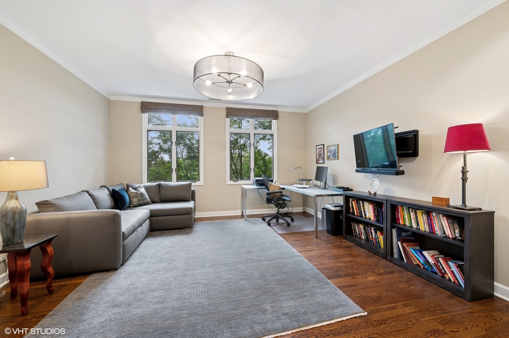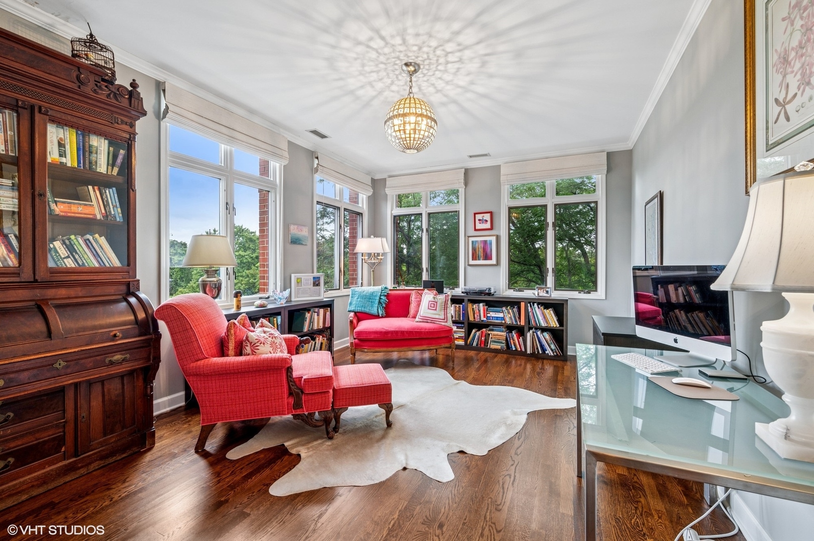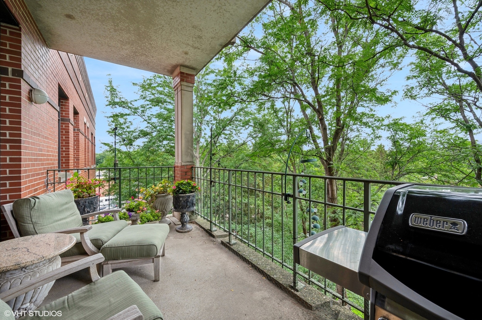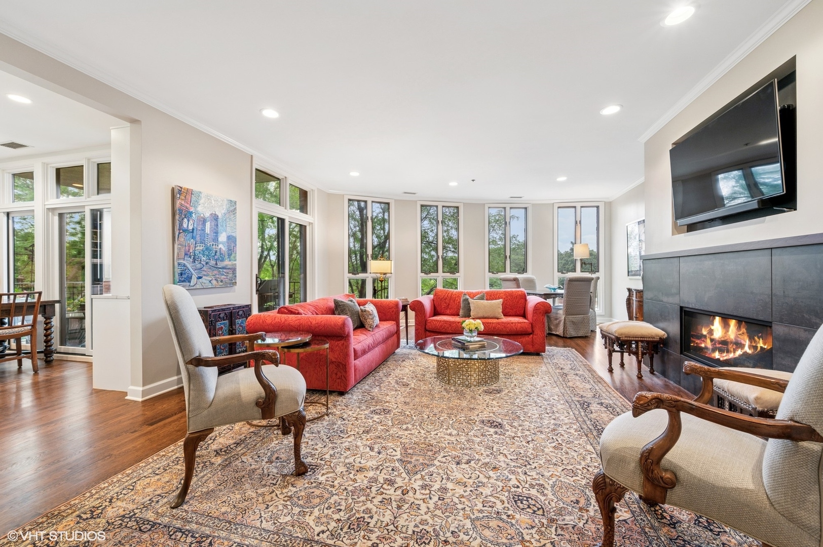 Absolutely stunning and fully renovated 3-bedroom + office, 2.5-bath top-floor condo in a prime River Forest boutique building. Nothing has been left undone-every inch of this home has been thoughtfully customized by the current owners with the highest attention to detail. You’ll love the ideal flow of this spacious floor plan, featuring 9-foot ceilings, beautiful hardwood floors, and oversized windows that fill the home with natural light. The welcoming foyer includes a large walk-in closet and a stylish half bath with a custom stone vanity. The expansive living room overlooks tree tops and a peaceful courtyard, anchored by a striking custom-built fireplace and one of three sliding doors that lead to your private balcony. The true chef’s kitchen is a showstopper with handcrafted cabinetry, quartz countertops, designer tile backsplash, and top-tier Sub-Zero, Wolf, and Bosch appliances. Enjoy casual dining at the eat-in island or a full table setup with two more sliding doors that open to the balcony. A flexible floor plan allows for a formal dining room or additional lounge space, while each bedroom offers excellent closet storage, custom window treatments, and designer lighting. The office can easily serve as a fourth bedroom or den. The serene primary suite offers a true retreat with fully outfitted custom walk-in closets and a luxurious spa-like bath, complete with heated floors, marble finishes, a soaking tub, large walk-in shower, and a double vanity with ample storage plus 2 linen closets! Large utility room with side by side washer/dryer, sink, additional storage! Additional highlights include heated garage tandem parking space and storage unit. All of this in a walk-to-everything location-this is River Forest living at its best. Don’t miss this rare opportunity!