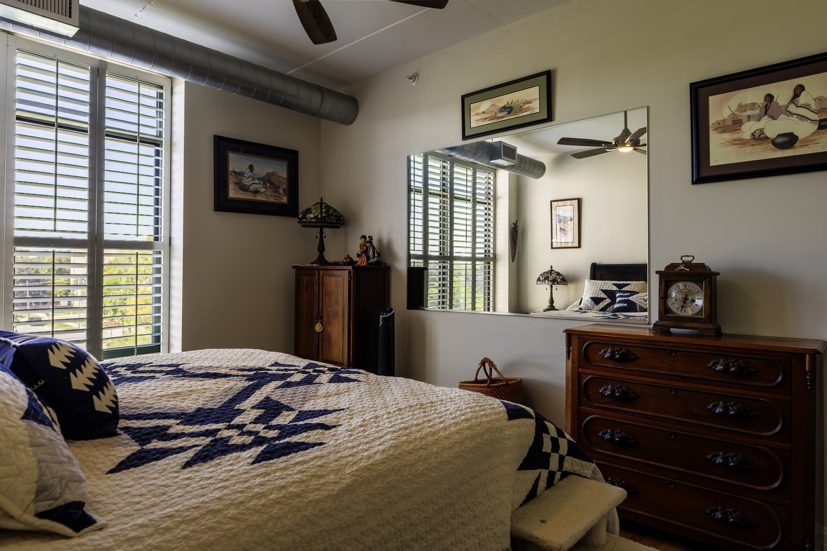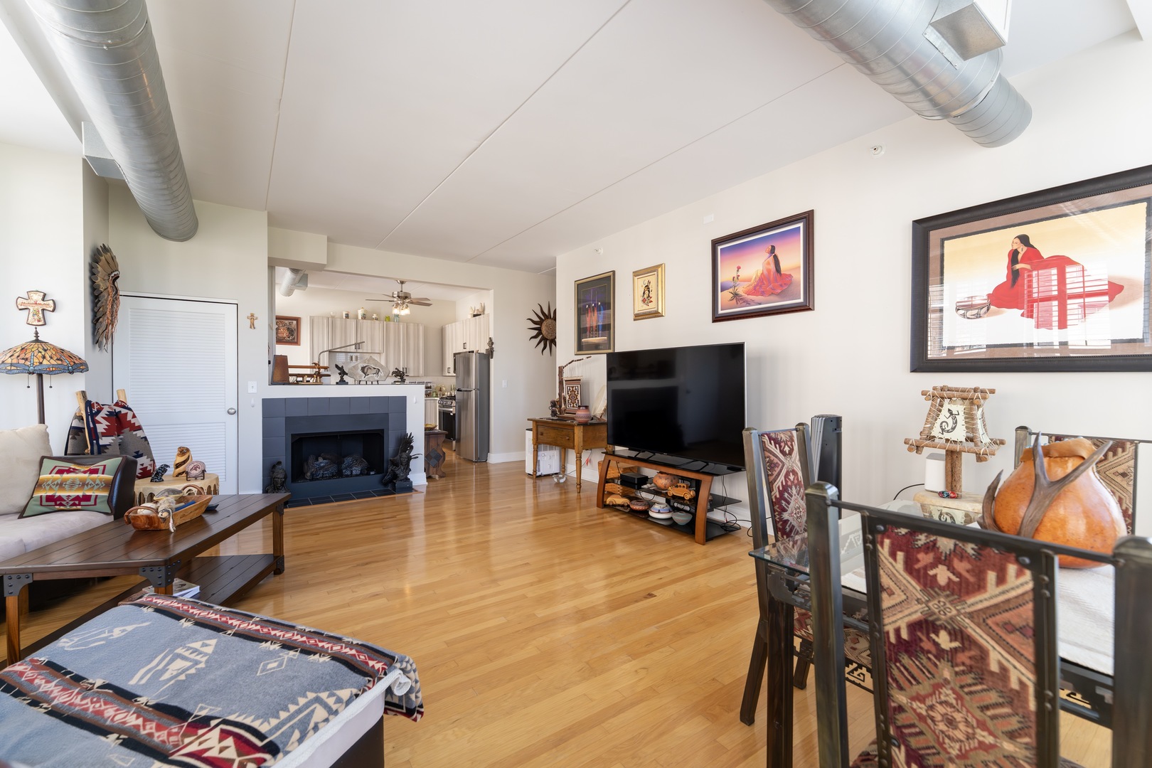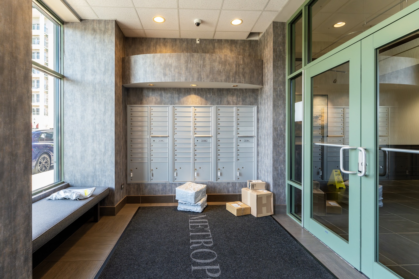 A lovingly maintained 2 bed, 2 bath corner unit at the Metropolis Place in the heart of downtown Arlington Heights. Conveniently located just steps away from the Metra, restaurants, entertainment, shopping, farmers market, Arlington Heights Memorial Library and local events; with easy access to I-90 and I-290. Experience seamless living with an open concept living room, dining room, and kitchen – the perfect floor plan for entertaining and everyday living. This corner unit boasts two stunning walls of floor-to-ceiling windows in the living room, with plantation shutters for added privacy. Enjoy beautiful sunsets and soft light throughout the day with a western and northern exposure. Recently remodeled in 2024, the kitchen features stainless steel appliances, a stainless steel apron sink, matching quartz countertops and backsplash and shaker-style cabinets. Adjacent to the kitchen is the balcony; a quaint outdoor space for grilling, container gardening, or simply enjoying some fresh air. Rest and relax in the master bedroom with floor-to-ceiling windows, recently remodeled custom dual closets, and an ensuite bathroom featuring a glass door shower/tub combo and newer Kohler toilet and shower head. A second bedroom, full hallway bathroom with a glass door walk-in shower, and laundry closet completes the unit. Timeless hardwood floors and 10ft ceilings throughout. Additional updates include: newer HVAC (2024), newer fireplace box (2024), new bedroom ceiling fans (2025) and new closet doors throughout (2025). Larger indoor storage unit is included. Attached parking garage with assigned parking spaces available for $40 per month per car. Building amenities include elevator access, a secured lobby area and mail receiving room.
