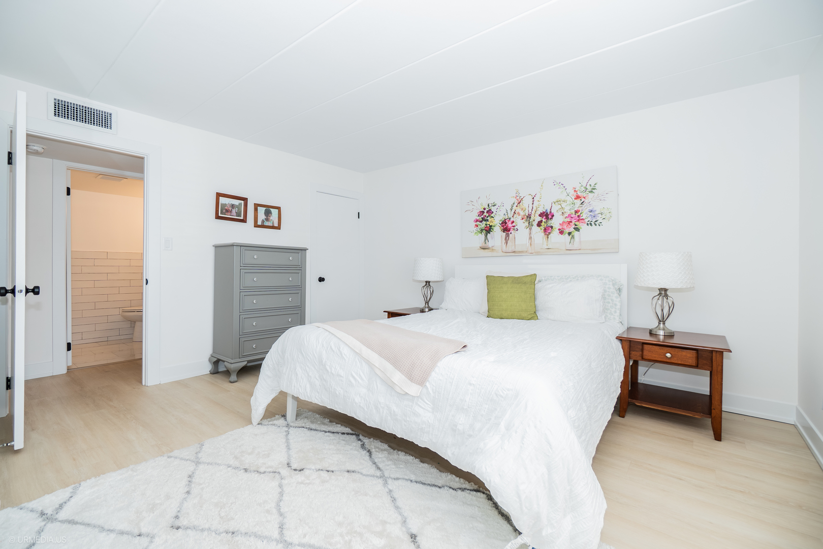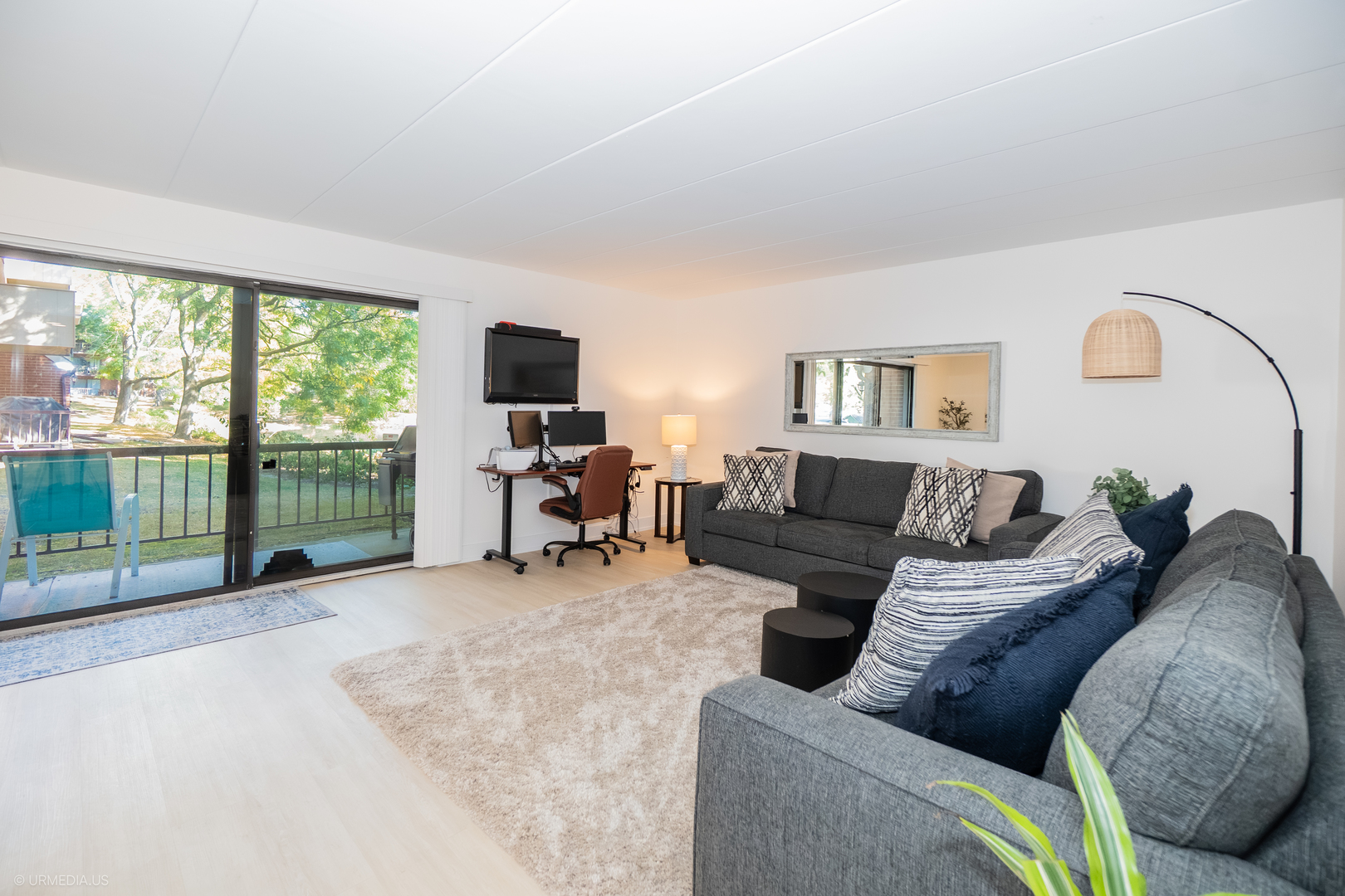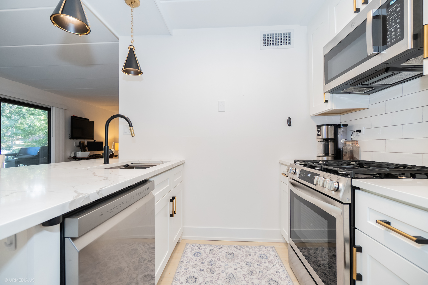 Ultra-chic and move-in ready! Recently fully remodeled, this spacious condo lives like a model home with bright open living, new flooring throughout, designer finishes, and tranquil pond views from your expansive balcony. The sleek kitchen boasts stainless steel appliances, quartz counters, a breakfast bar, custom cabinetry and walk in pantry. The spacious primary suite features an extra large walk-in closet. Updated spa-like bath comes complete with a rain shower and floating vanity w quartz countertop. Laundry in unit, central A/C, tons of storage and everything you could need with this turn key stunning unit. Convenient Lombard location with quick access to expressways, shopping, and entertainment. Assigned parking + extra guest spots included.