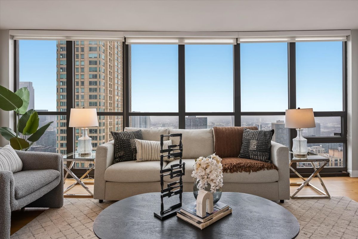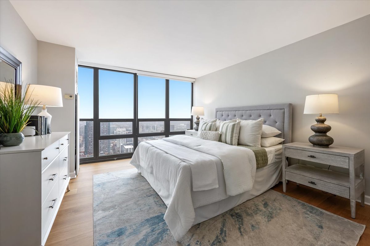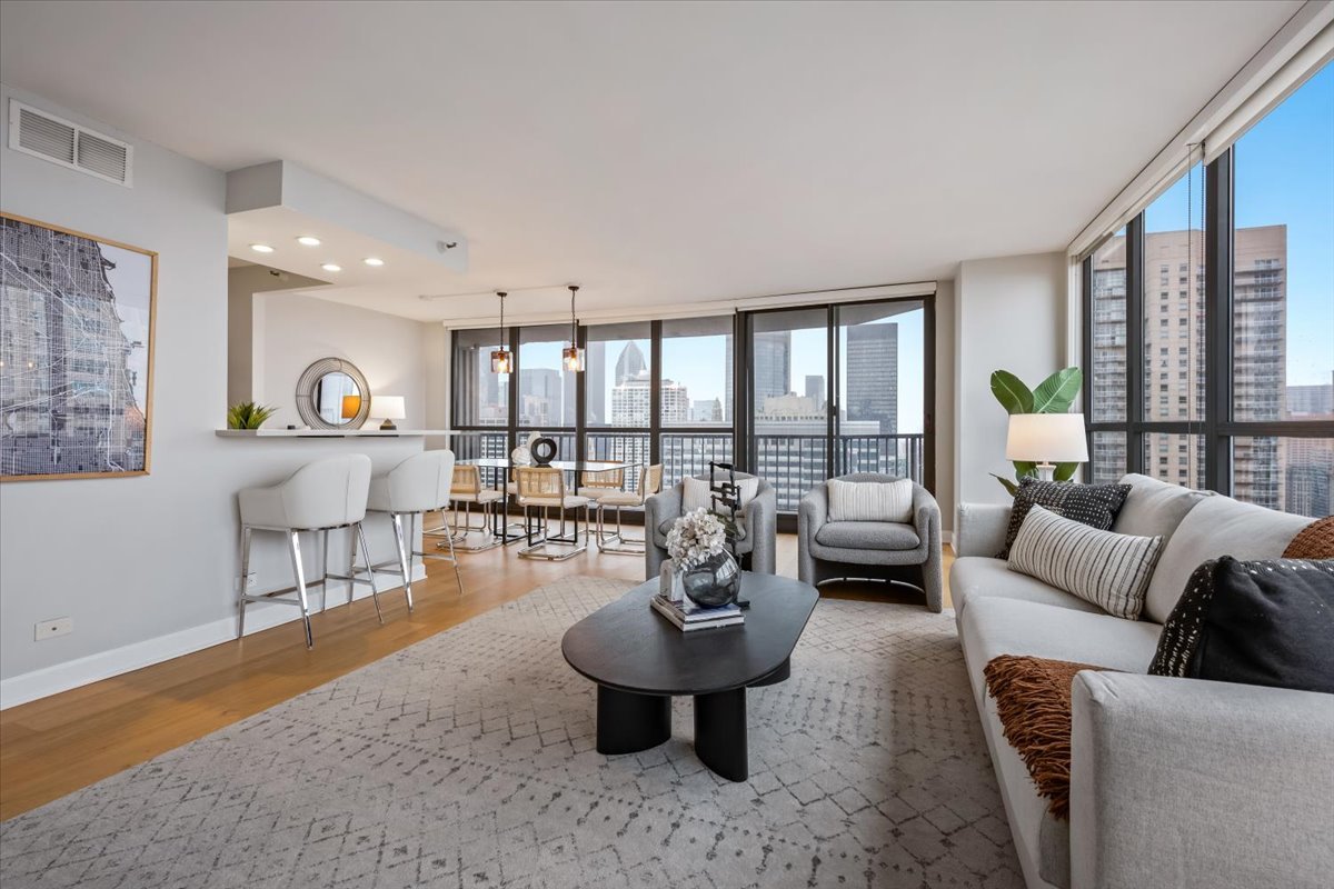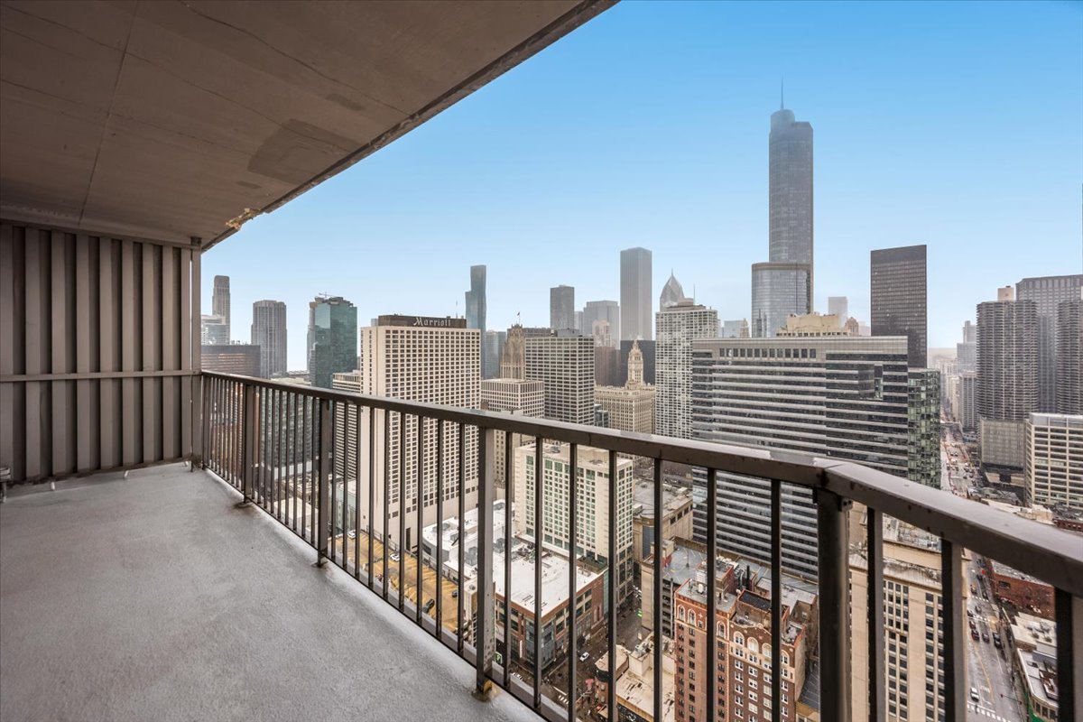 Welcome home to this fantastic 2BD/2BA corner unit in the heart of River North! Featuring 1,400 sq ft of living space, floor-to-ceiling windows, a covered private balcony with south and west exposure, in-unit laundry and renovated hardwood floors, this unit truly has it all. Walk in to a large foyer and inviting living room with incredible city views and a designated dining area to accommodate guests, which flows seamlessly into the open and renovated kitchen featuring quartz countertops, stainless steel appliances, and a breakfast bar. Two nice-sized bedrooms, with an ensuite primary bathroom and walk-in closet for the primary bedroom. Full amenity building that includes front door staff, an outdoor pool, indoor hot tub, sauna, dry cleaners, sundeck with grills and a fire pit, party room, 24-hour fitness center, AND a 24-hour business center! With a walking score of 100, this unit is located in a perfect, central location, only 0.1 miles from the Grand Red line, 0.5 miles from Chicago Brown & Purple line, easy access to 90/94, and walking distance to great restaurants, bars, shopping, and grocery stores. Deeded garage parking for an additional 25k.
