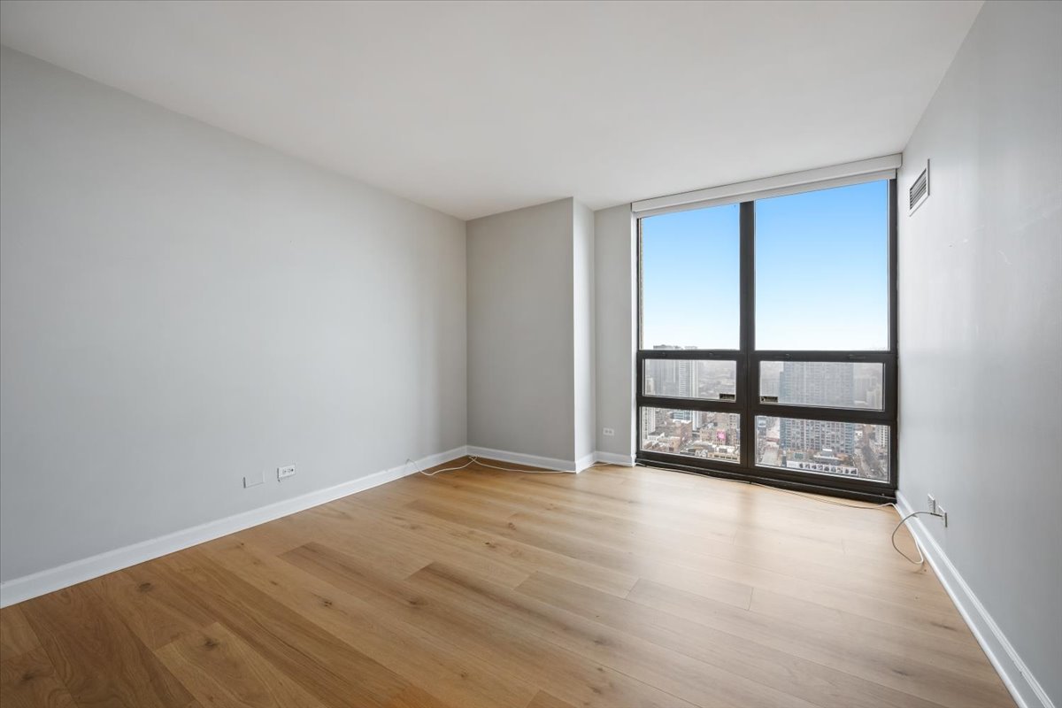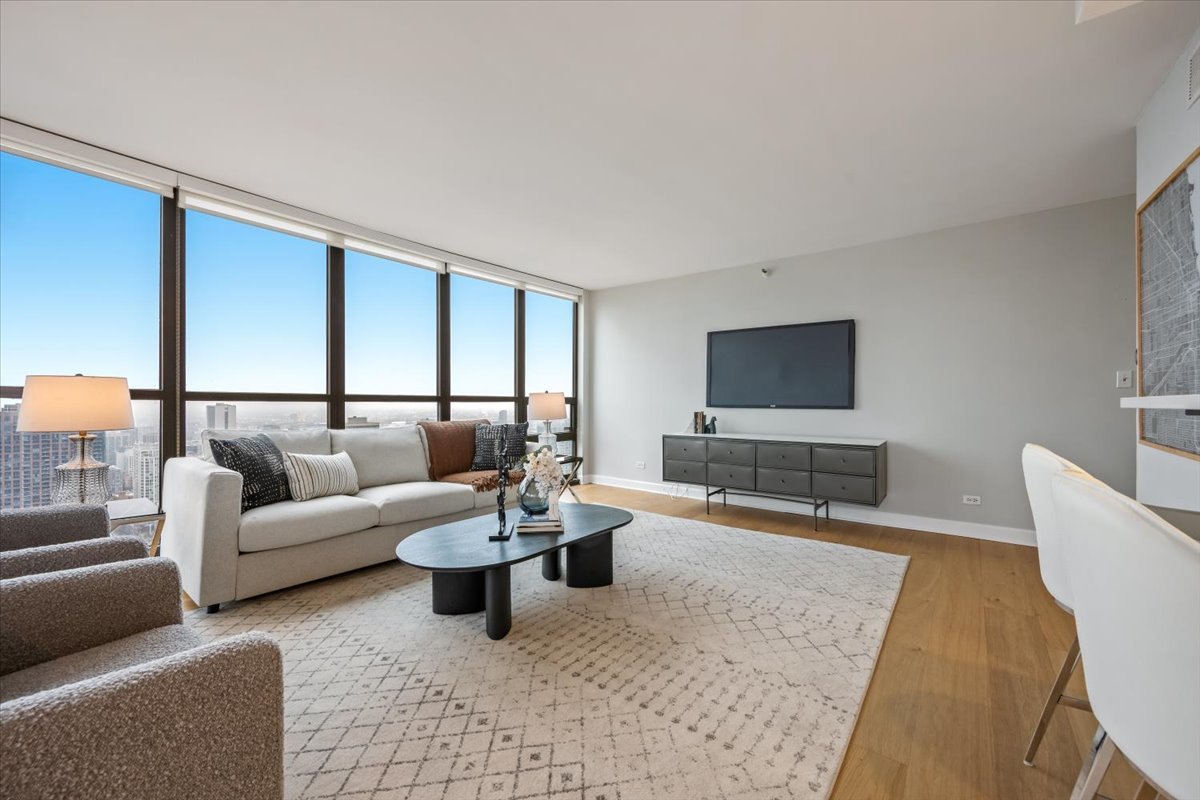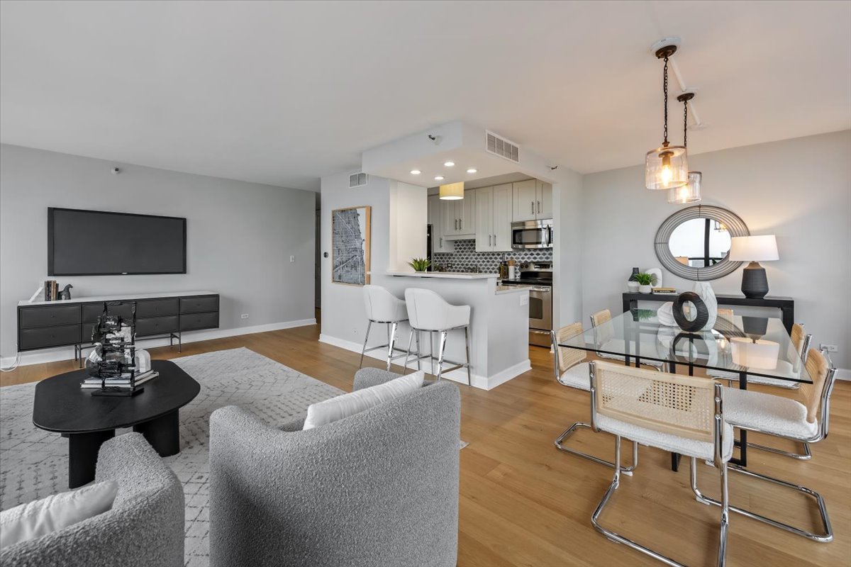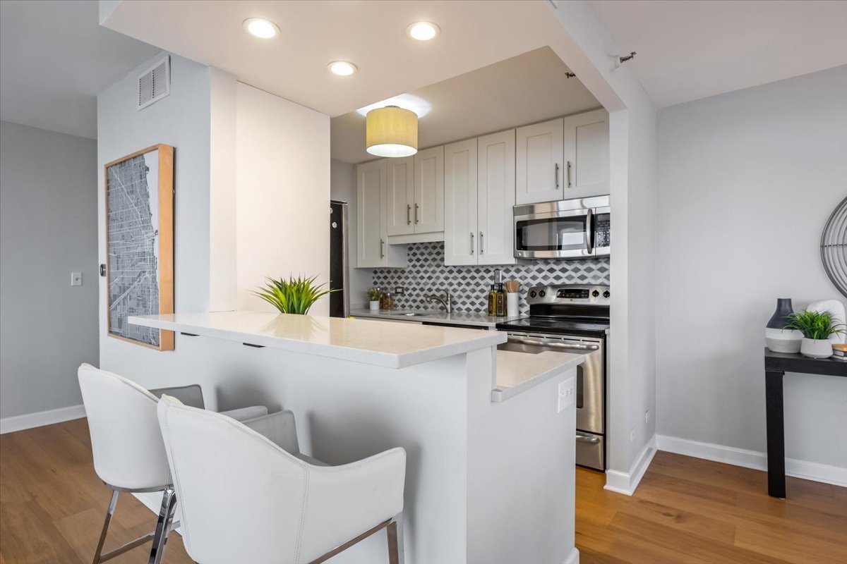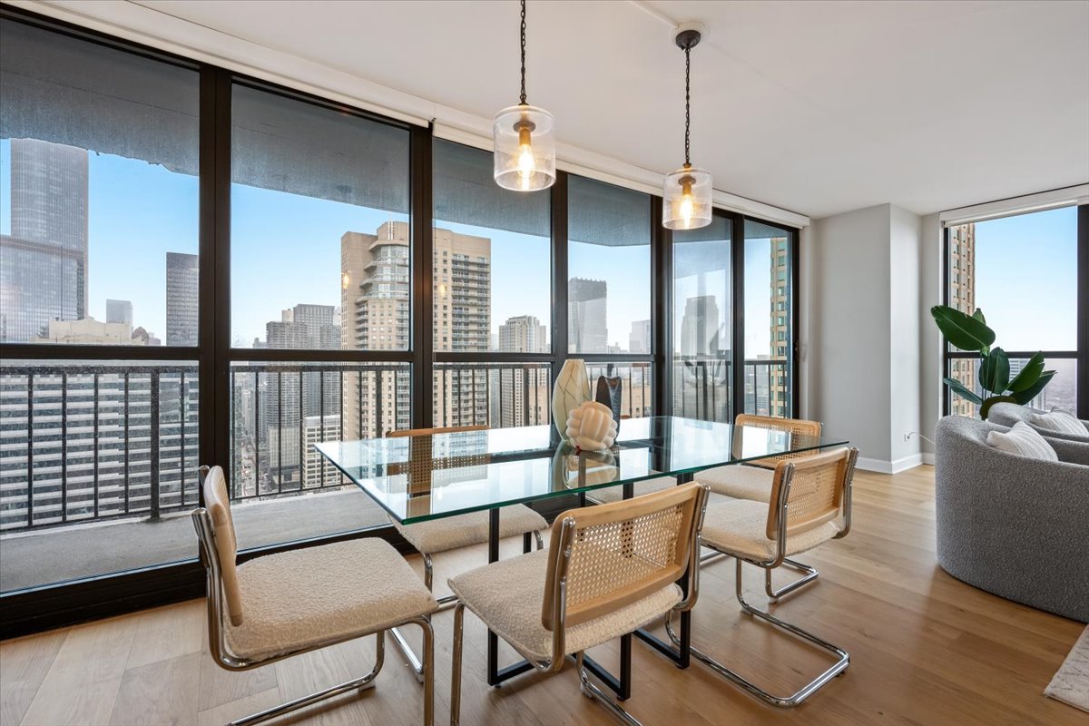 Welcome home to this fantastic 2BD/2BA corner unit in the heart of River North! Featuring 1,400 sq ft of living space, floor-to-ceiling windows, a covered private balcony with south and west exposure, in-unit laundry and renovated hardwood floors, this unit truly has it all. Walk in to a large foyer and inviting living room with incredible city views and a designated dining area to accommodate guests, which flows seamlessly into the open and renovated kitchen featuring quartz countertops, stainless steel appliances, and a breakfast bar. Two nice-sized bedrooms, with an ensuite primary bathroom and walk-in closet for the primary bedroom. Full amenity building that includes front door staff, an outdoor pool, indoor hot tub, sauna, dry cleaners, sundeck with grills and a fire pit, party room, 24-hour fitness center, AND a 24-hour business center! With a walking score of 100, this unit is located in a perfect, central location, only 0.1 miles from the Grand Red line, 0.5 miles from Chicago Brown & Purple line, easy access to 90/94, and walking distance to great restaurants, bars, shopping, and grocery stores. Deeded garage parking for an additional 25k.