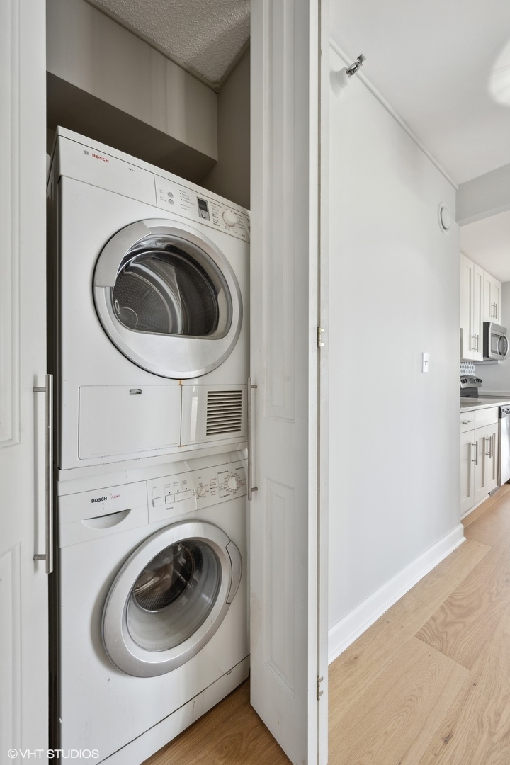 Welcome home to this fantastic 2BD/2BA corner unit in the heart of River North! Featuring 1,400 sq ft of living space, floor-to-ceiling windows, a covered private balcony with south and west exposure, in-unit laundry and renovated hardwood floors, this unit truly has it all. Walk in to a large foyer and inviting living room with incredible city views and a designated dining area to accommodate guests, which flows seamlessly into the open and renovated kitchen featuring quartz countertops, stainless steel appliances, and a breakfast bar. Two nice-sized bedrooms, with an ensuite primary bathroom and walk-in closet for the primary bedroom. Full amenity building that includes front door staff, an outdoor pool, indoor hot tub, sauna, dry cleaners, sundeck with grills and a fire pit, party room, 24-hour fitness center, AND a 24-hour business center! With a walking score of 100, this unit is located in a perfect, central location, only 0.1 miles from the Grand Red line, 0.5 miles from Chicago Brown & Purple line, easy access to 90/94, and walking distance to great restaurants, bars, shopping, and grocery stores. Deeded garage parking for an additional 25k. HOAs are $1,233/mo.