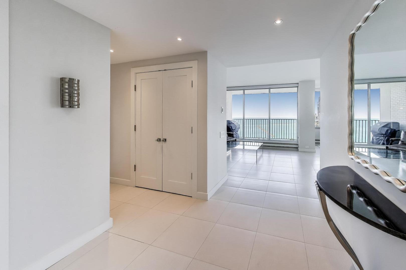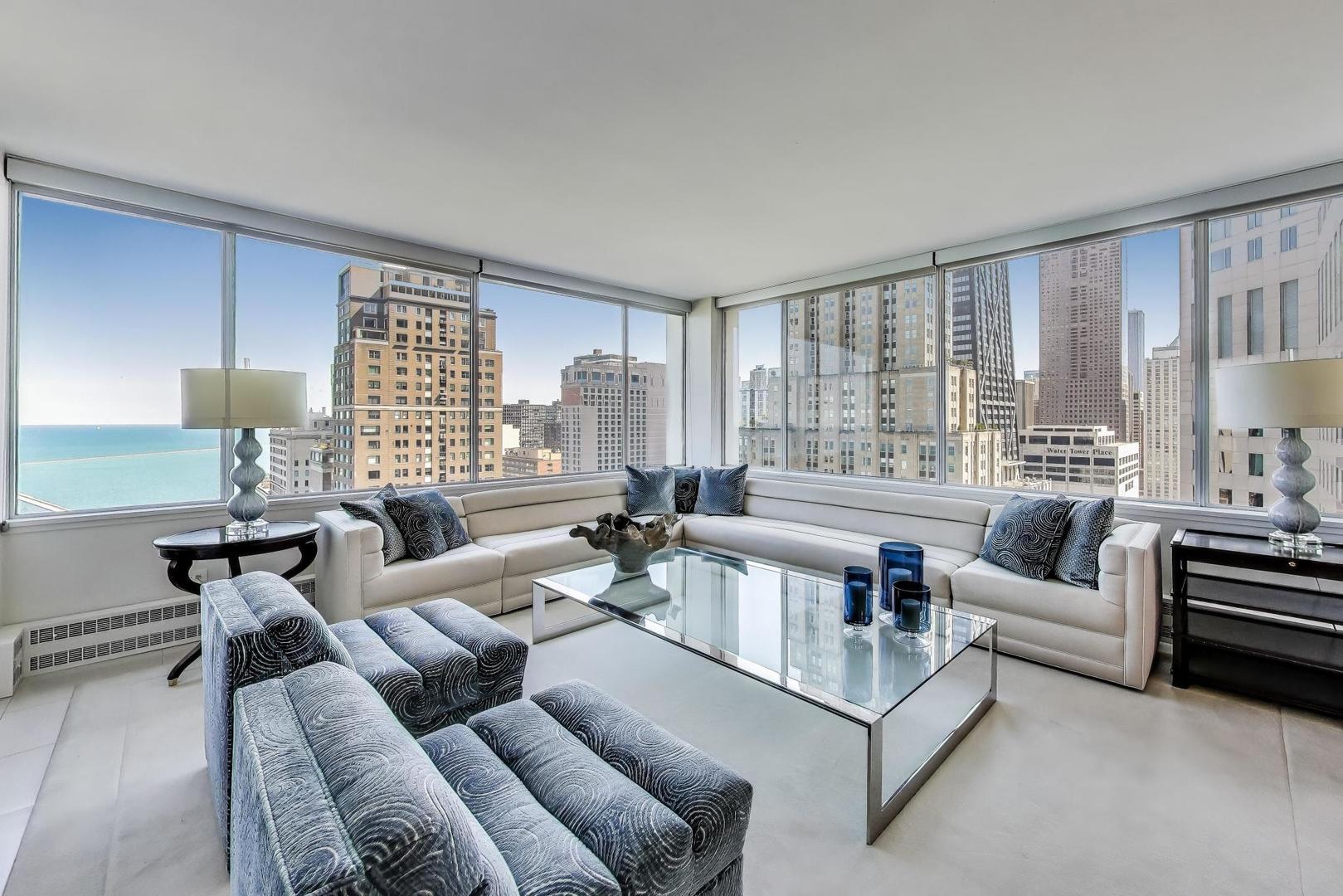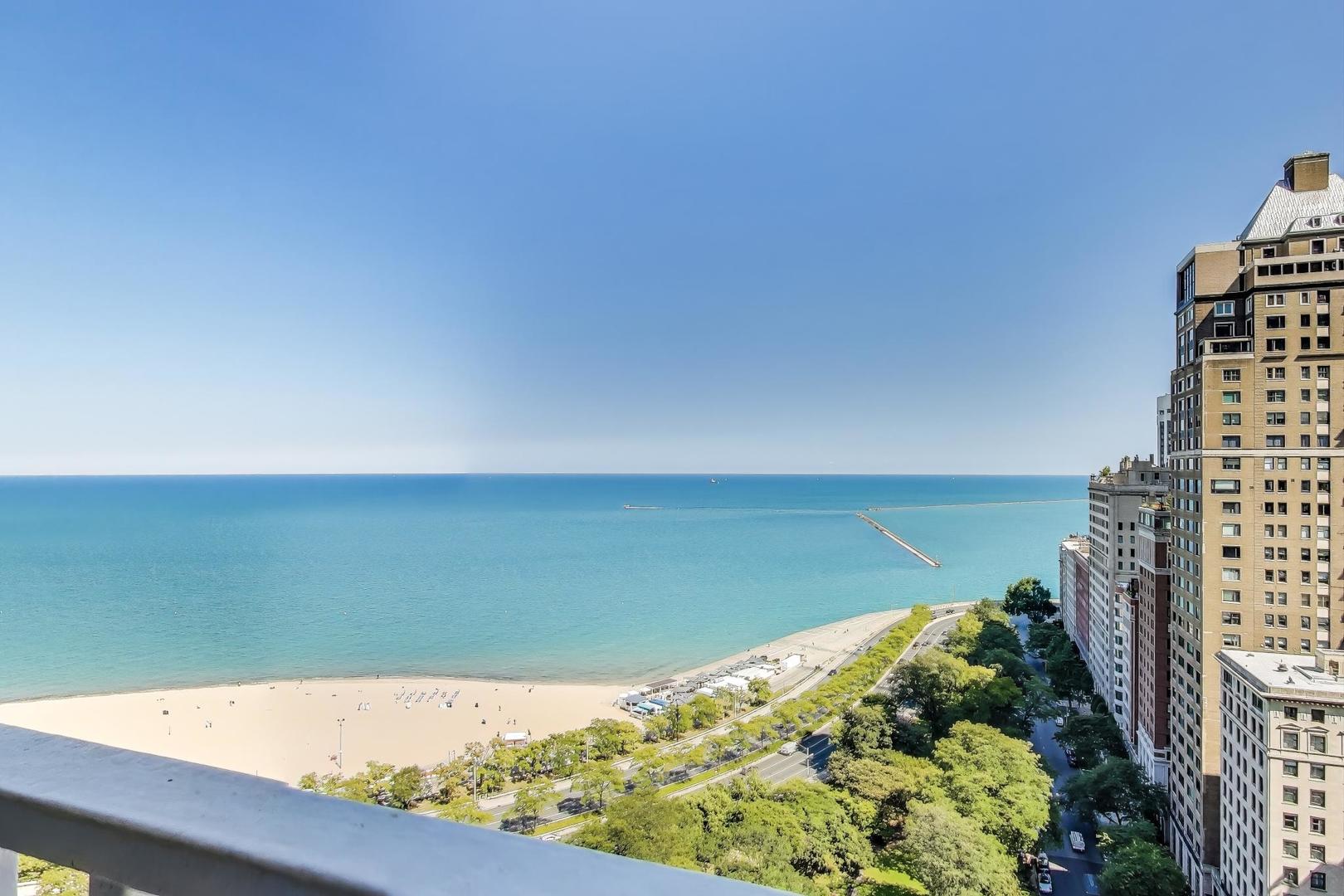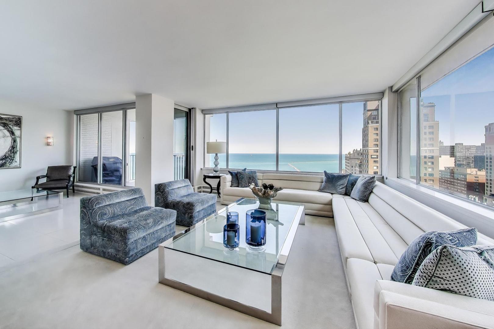 Stunning Lake & City Views from this Corner Gold Coast Condo! This rarely available tier offers breathtaking panoramic views and an unbeatable location at Oak St and Lake Shore Dr. Completely updated with top-of-the-line finishes, this residence features a Sub-Zero refrigerator, Wolf cooktop and double oven, Bosch washer and dryer, and a built-in surround sound system throughout. The thoughtfully designed floor plan includes a den open to the living room, which can be converted to a 3rd bedroom. The primary suite boasts a spa-inspired bath with a soaking tub, glass-enclosed shower, separate water closet as well as a large walk-in closet. An additional walk-in closet in the hallway offers exceptional storage. Step onto the east-facing terrace from the living room to enjoy serene lake views. Expansive picture windows flood the home with natural light, and spacious rooms provide a sense of elegance and comfort. The building offers 24-hour door staff, an indoor pool, a west-facing sundeck, a party room, a state-of-the-art fitness center, garage parking, and guest parking.