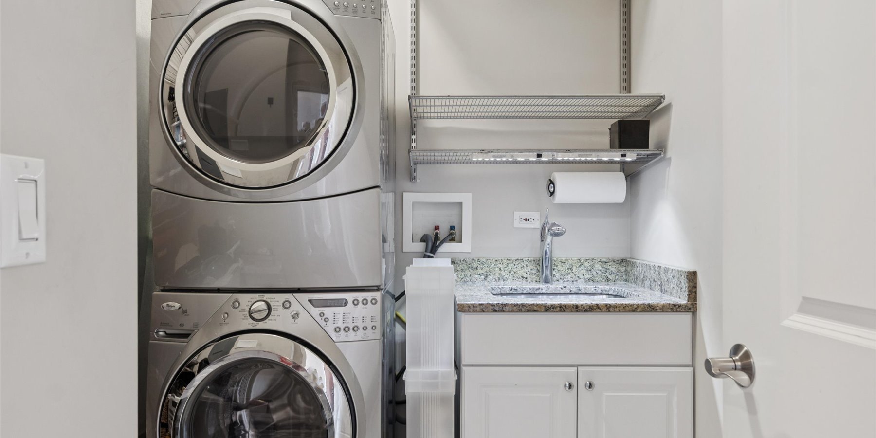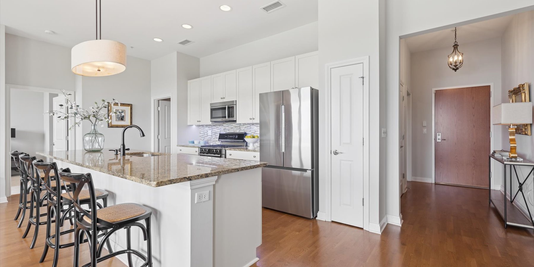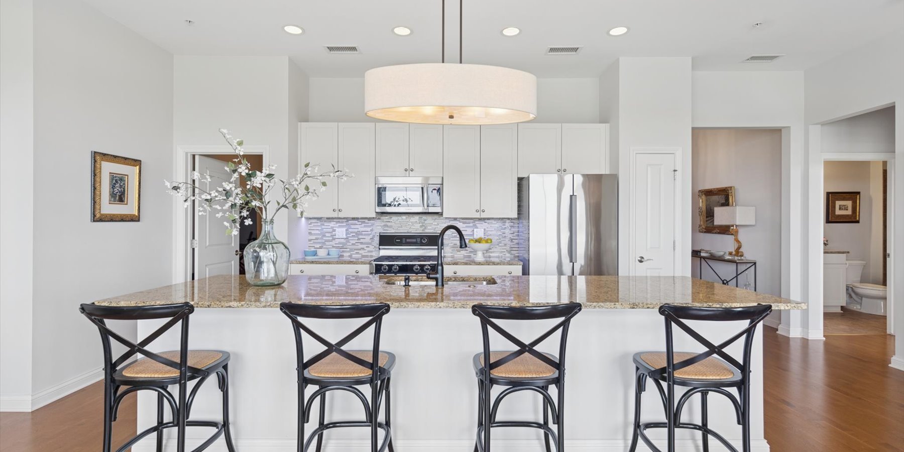 Luxury at the top! This lovely penthouse unit, in the Village Center’s exclusive all-residential building, has 2 beds/2baths plus a cozy den. The gracious open floorplan includes a gourmet kitchen with expansive island, spacious living and dining areas, plus a private balcony. Designer touches abound in the appealing neutral color palette. Upgrades and updates include high-end closet organization, recessed lighting, custom window treatments, new carpeting in bedrooms and den, and fresh paint. That’s not all…this unit comes with 2 parking spaces in the heated garage. Enjoy all that the Village Center has to offer, right outside your doors…fine and casual dining, shopping, a full-service spa and more.