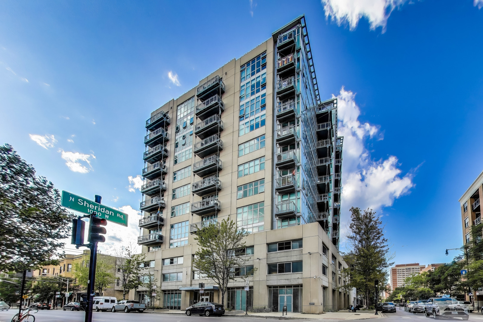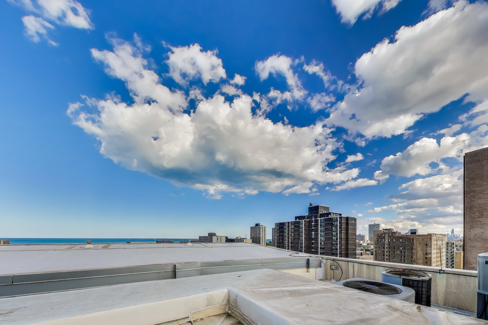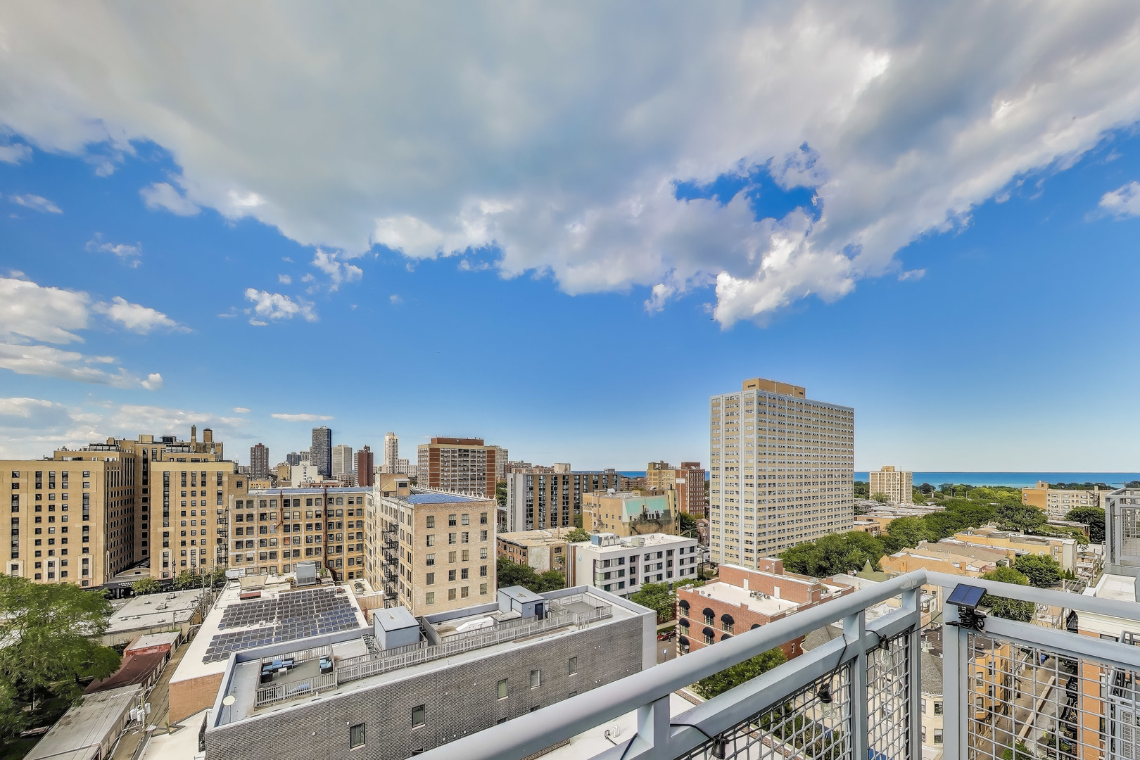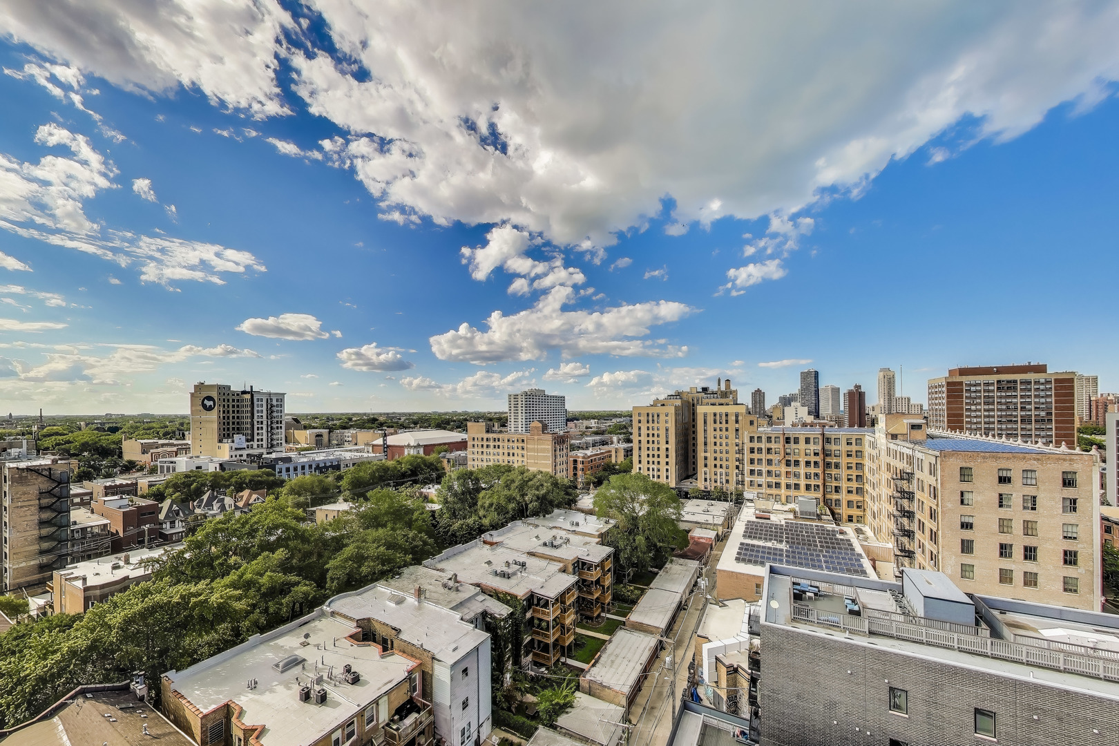 Enjoy sweeping skyline and lake views from this bright, top-floor, 2-bed, 2-bath corner condo at 1000 W Leland. The spacious living and dining area features floor-to-ceiling windows, hardwood floors, and a striking custom marble-surround fireplace that serves as the room’s focal point. Just off the living room, step onto the large private balcony for unobstructed northern city & lake views, perfect for relaxing or entertaining. The open layout flows into the updated kitchen with new white quartz countertops, black hardware, stainless steel appliances, an KitchenAid electric cooktop, and an island with seating. The primary suite includes floor-to-ceiling windows, a walk-in closet, and a stylish ensuite bath with a marble-accented walk-in shower and modern vanity. The bright second bedroom features large windows and can serve as a guest room, office, or workout space. A full guest bath, located on the opposite side of the unit for privacy, includes a tub/shower combo and updated finishes. Both baths and the primary bedroom have been freshly painted. Additional highlights include in-unit laundry with a stackable Bosch washer/dryer, carpet in the bedrooms, and multiple storage options. This boutique, pet-friendly building offers a fitness room, bike storage, package lockers, and a rooftop deck with panoramic views. One secured interior garage parking is included. Ideally located near shops, Target, Mariano’s, Aldi, restaurants, nightlife, and just blocks from Montrose Beach, lakefront trails, and Uptown’s iconic entertainment venues (with more on their way). Convenient access to the newly re-opened CTA Red Line stations and express buses makes commuting easy!