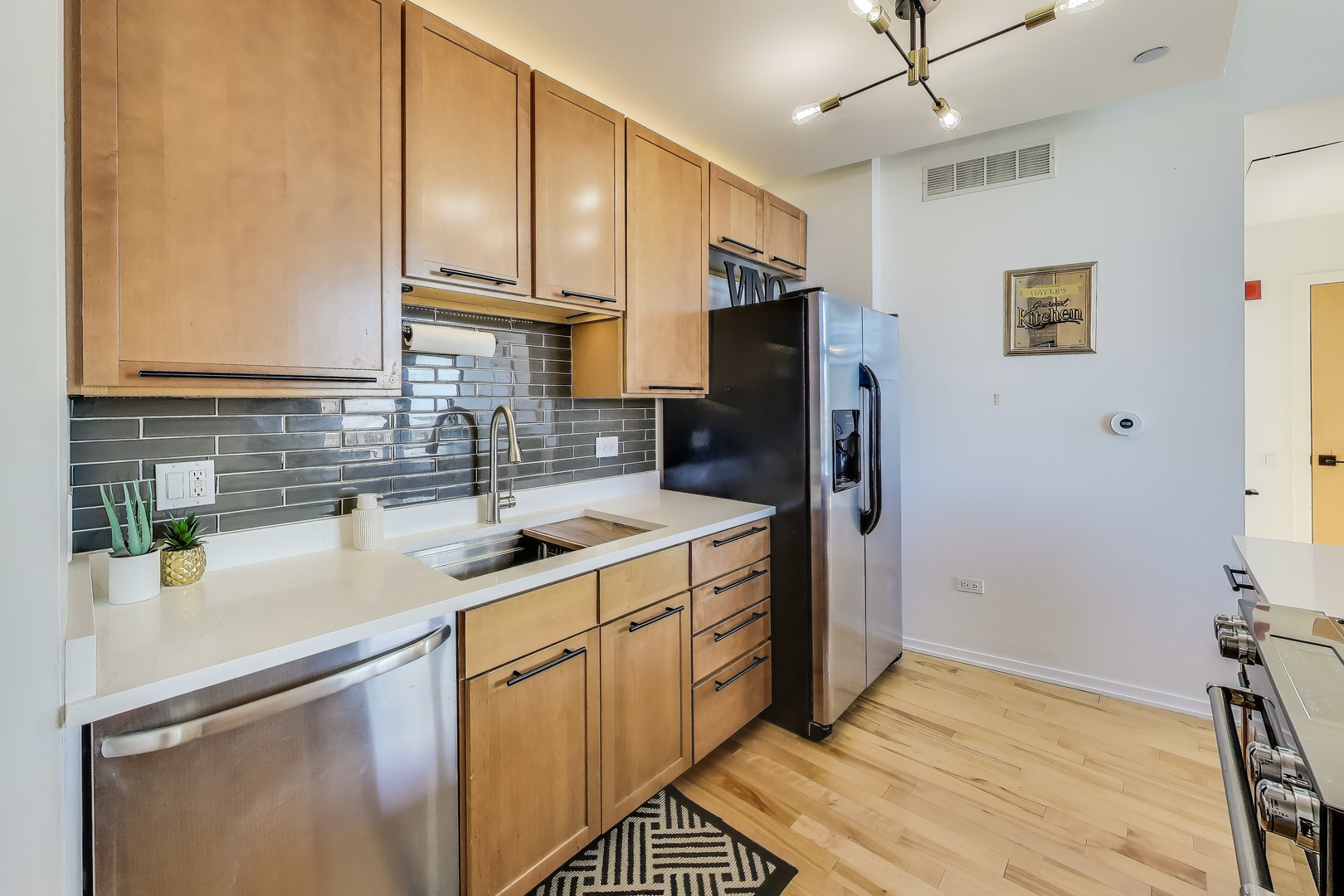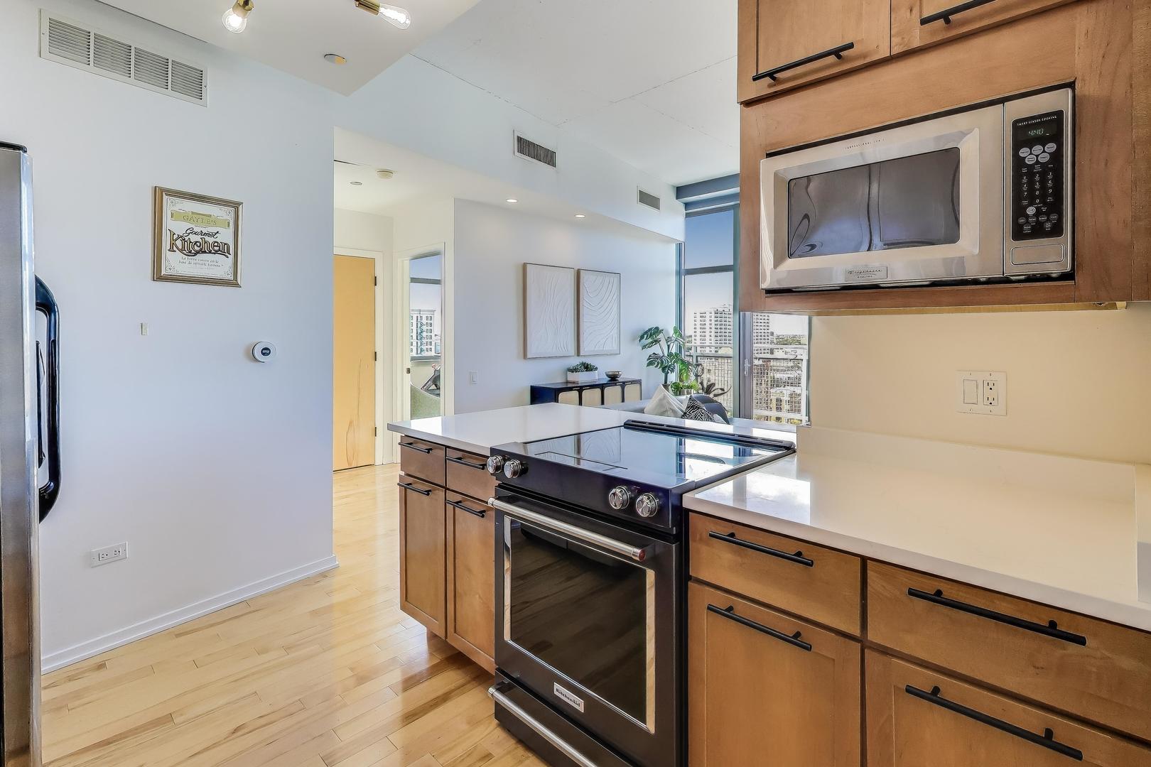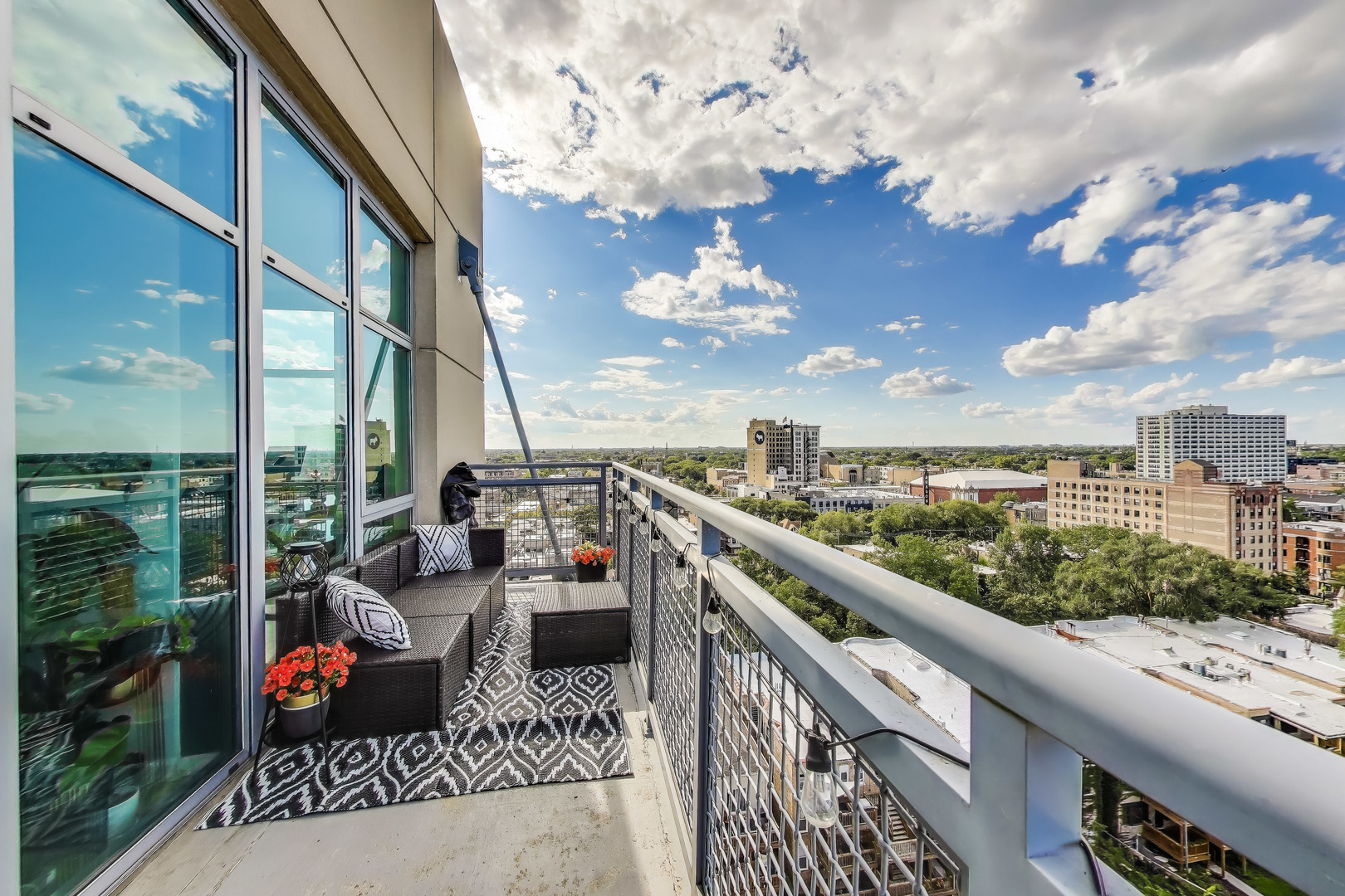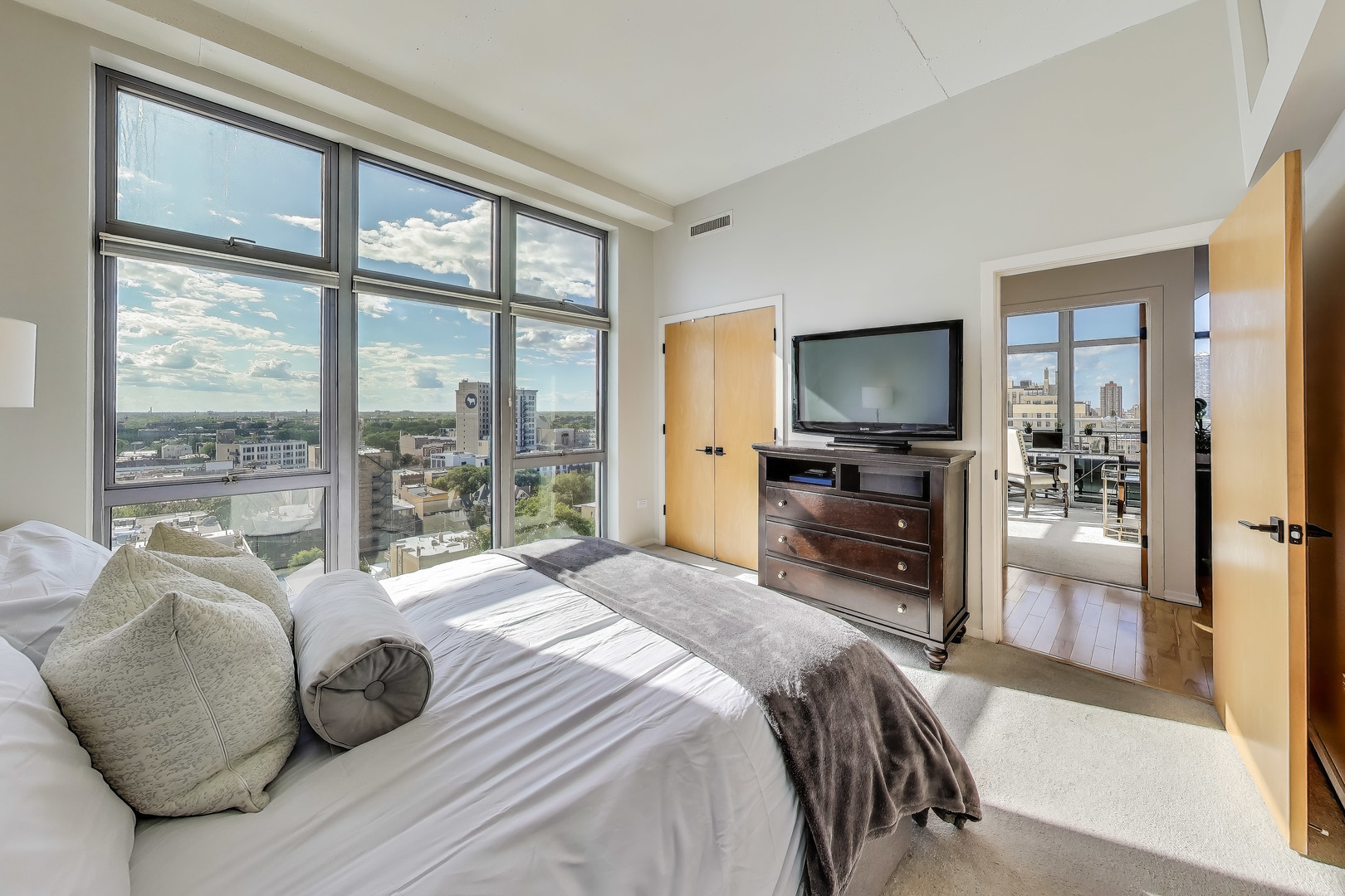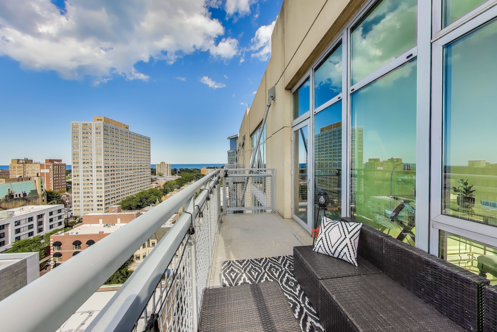 Enjoy sweeping skyline and lake views from this bright, top-floor, 2-bed, 2-bath corner condo at 1000 W Leland. The spacious living and dining area features floor-to-ceiling windows, hardwood floors, and a striking custom marble-surround fireplace that serves as the room’s focal point. Just off the living room, step onto the large private balcony for unobstructed northern city & lake views, perfect for relaxing or entertaining. The open layout flows into the updated kitchen with new white quartz countertops, black hardware, stainless steel appliances, an KitchenAid electric cooktop, and an island with seating. The primary suite includes floor-to-ceiling windows, a walk-in closet, and a stylish ensuite bath with a marble-accented walk-in shower and modern vanity. The bright second bedroom features large windows and can serve as a guest room, office, or workout space. A full guest bath, located on the opposite side of the unit for privacy, includes a tub/shower combo and updated finishes. Both baths and the primary bedroom have been freshly painted. Additional highlights include in-unit laundry with a stackable Bosch washer/dryer, carpet in the bedrooms, and multiple storage options. This boutique, pet-friendly building offers a fitness room, bike storage, package lockers, and a rooftop deck with panoramic views. One secured interior garage parking is included. Ideally located near shops, Target, Mariano’s, Aldi, restaurants, nightlife, and just blocks from Montrose Beach, lakefront trails, and Uptown’s iconic entertainment venues (with more on their way). Convenient access to the newly re-opened CTA Red Line stations and express buses makes commuting easy!