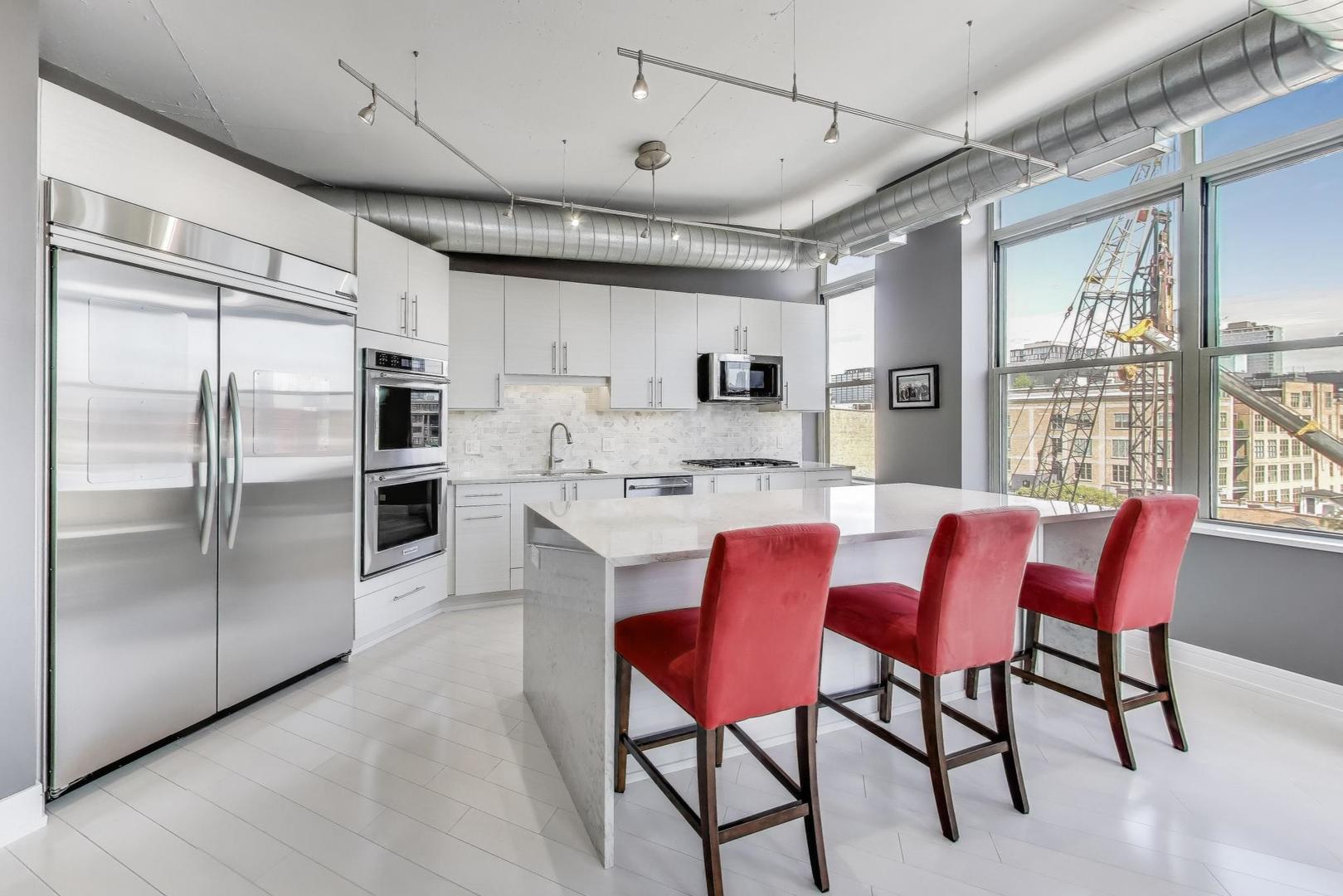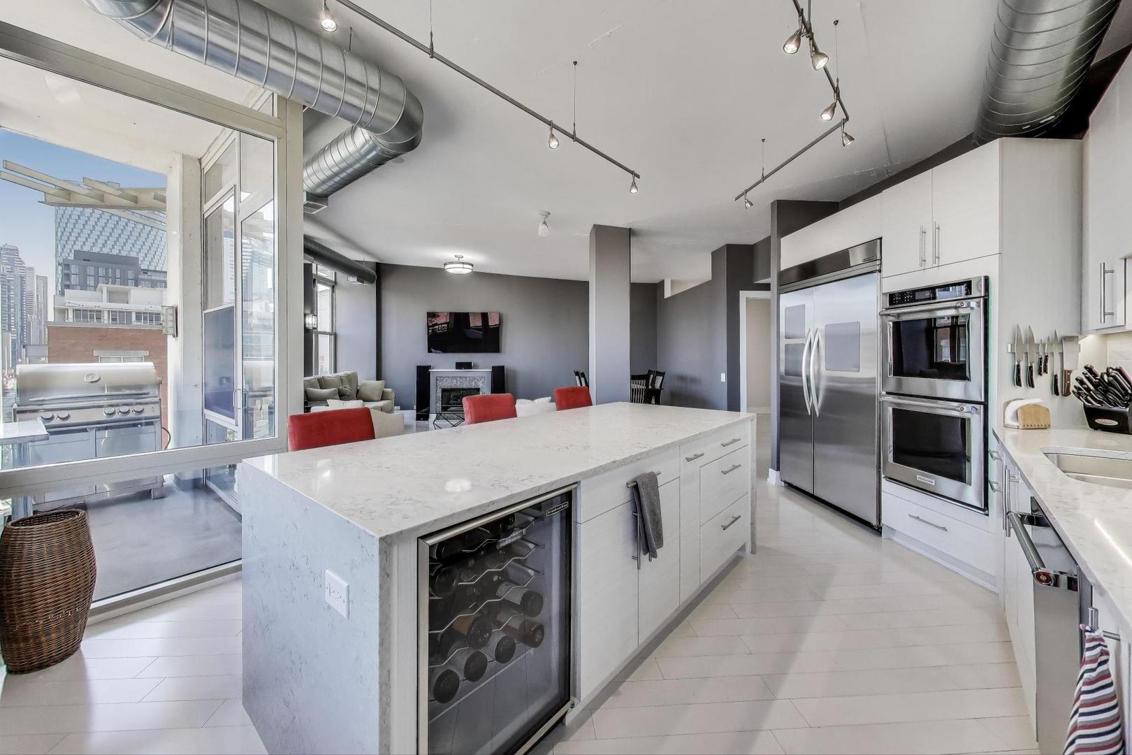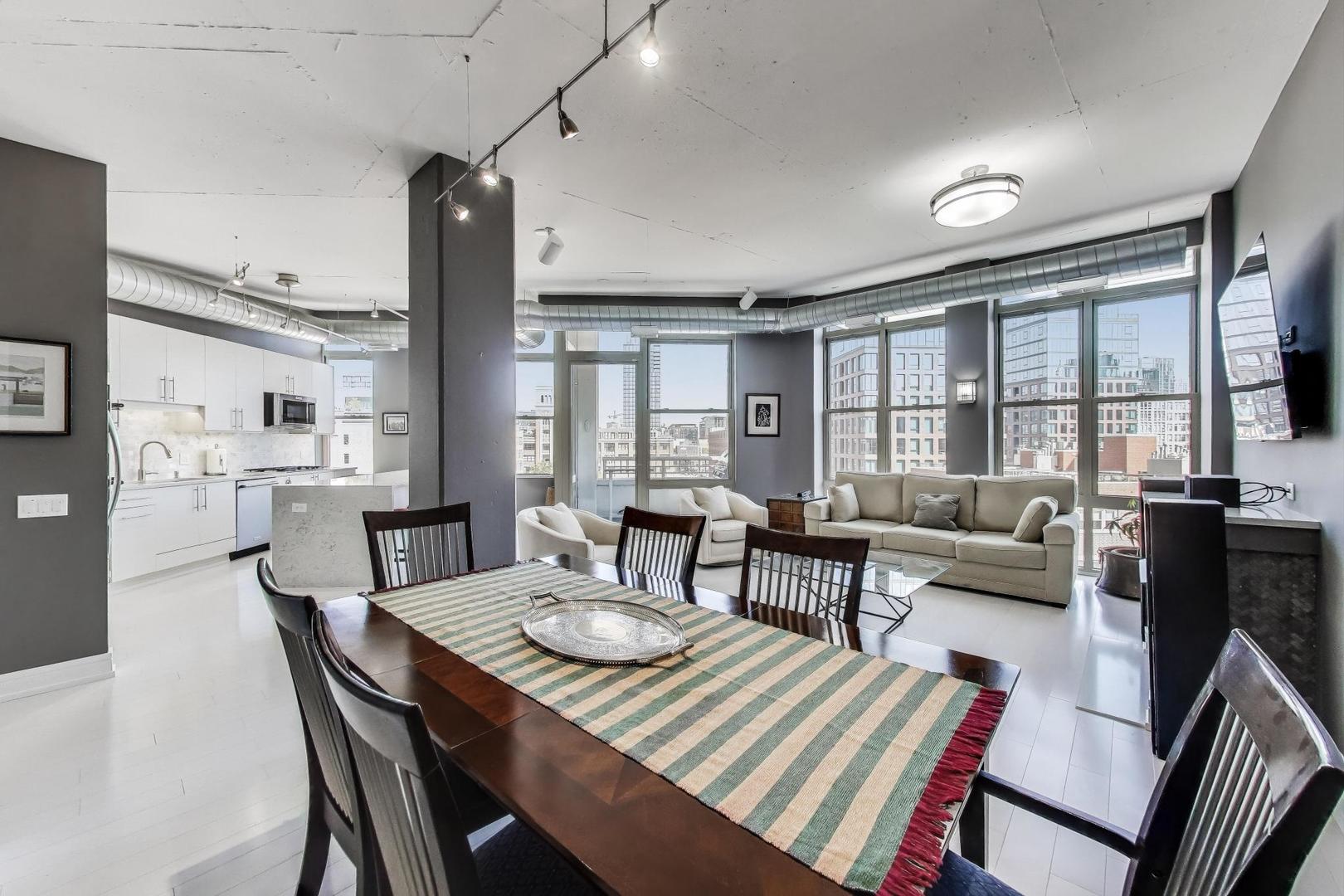 Exceptional West Loop corner penthouse — centrally located to the best of West Loop and walkable to Fulton Market, Downtown, Metra station, and CTA. Easy walk to Bartelme Park and Skinner Park. A 5-block drive to both I90 and I290. Great views of West Loop / downtown from all rooms. Floor-to-ceiling windows allow tons of natural light and highlight the penthouse experience. Remodeled by the current owner. No expense was spared. Generous bedroom sizes, open layout. Bedrooms located away from the living space — making this oversized 2400 sqft condo live like a single-family home. Walk-in pantry, hardwood flooring, grilling balcony off kitchen and high ceilings. The kitchen features contemporary cabinets, high-end appliances and an oversized kitchen island for storage, prep and entertaining — open to the living/dining area. Primary bedroom suite features a luxurious ensuite bath and a custom designed and appointed walk-in closet (large enough for 2 persons to share). Separate glass enclosed shower, huge whirlpool tub and double vanity highlight the spa-like bath. The primary bedroom is spacious, light-filled and features beautiful views of West Loop. The 2nd bedroom is generous in size, features tons of closet space, built-in shelving, and a murphy bed. 3rd bedroom (recently added back) perfect for guest room or office. Extra half bath near the entryway for guests/entertaining. Two balconies, two fireplaces and a separate laundry room with door. Surround sound speakers throughout. Additional huge 9’x8′ private storage room conveniently located in the garage. Premium extra wide deeded (accessible) parking space inside heated garage ($50,000 additional). Well-equipped exercise room and spacious outdoor common deck round out the amenities. Starbucks retail located in the building.