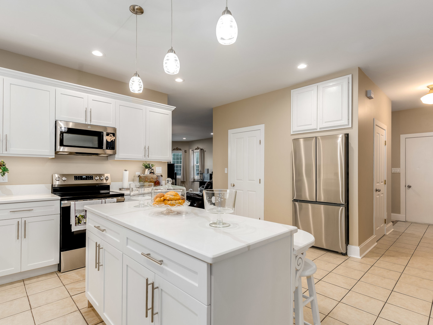 Custom ranch home with FULL BASEMENT! Welcoming covered front porch opens to the vaulted foyer/living room with hardwood flooring, white trimwork and NEW recessed LED lighting. Formal dining area has abundant windows for terrific natural light. Gourmet kitchen features ALL stainless steel appliances including electric stove and NEW dishwasher, NEW 42-inch white open top cabinets with crown moulding, beautiful NEW quartz counters, island breakfast bar with custom pendant lighting and HUGE walk-in pantry (please exclude the chest freezer). The master suite has hardwood floor, overhead light with fan, walk-in closet and private bath with dual sink vanity. Spacious secondary bedroom on the main floor has hardwood floor, NEW LED recessed lighting, ceiling fan and easy access to the full hall bath. Downstairs is a rec room/family room with ceramic tile flooring, 2 additional bedrooms, full bath and spacious storage with laundry area (please exclude washer and dryer). Professionally landscaped yard and private patio. So many NEWs and upgrades including NEW windows with NEW PVC trim, newer roof (2021), freshly painted wood siding, NEW 6″ gutters and downspouts; NEW aluminum fascia, and so much more. Attached garage. Perfect location that is easy to shopping and dining, walking distance to all three schools! Don’t miss this one!