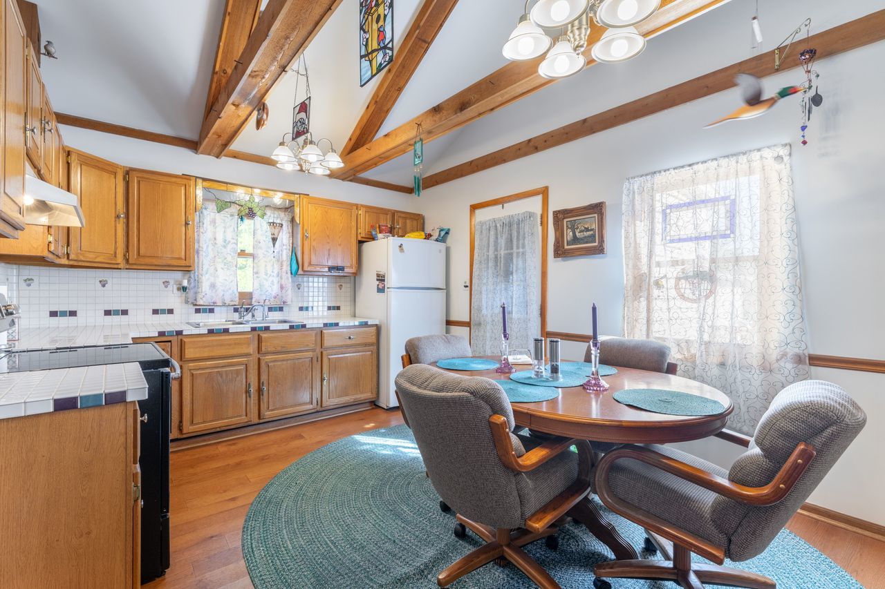 You will love this quaint historic home in Thornton. The built-in bookcase and fireplace invite a cozy feeling in the living room. The hall leading into the kitchen offer a dramatic view of the cathedral ceiling with timber beams. The oak cabinets in the kitchen with appliances. Beamed ceiling. Large yard with deck for entertaining. Newer A/C and furnace. Roof is 2 years new. Note none of the stained glass windows stay.