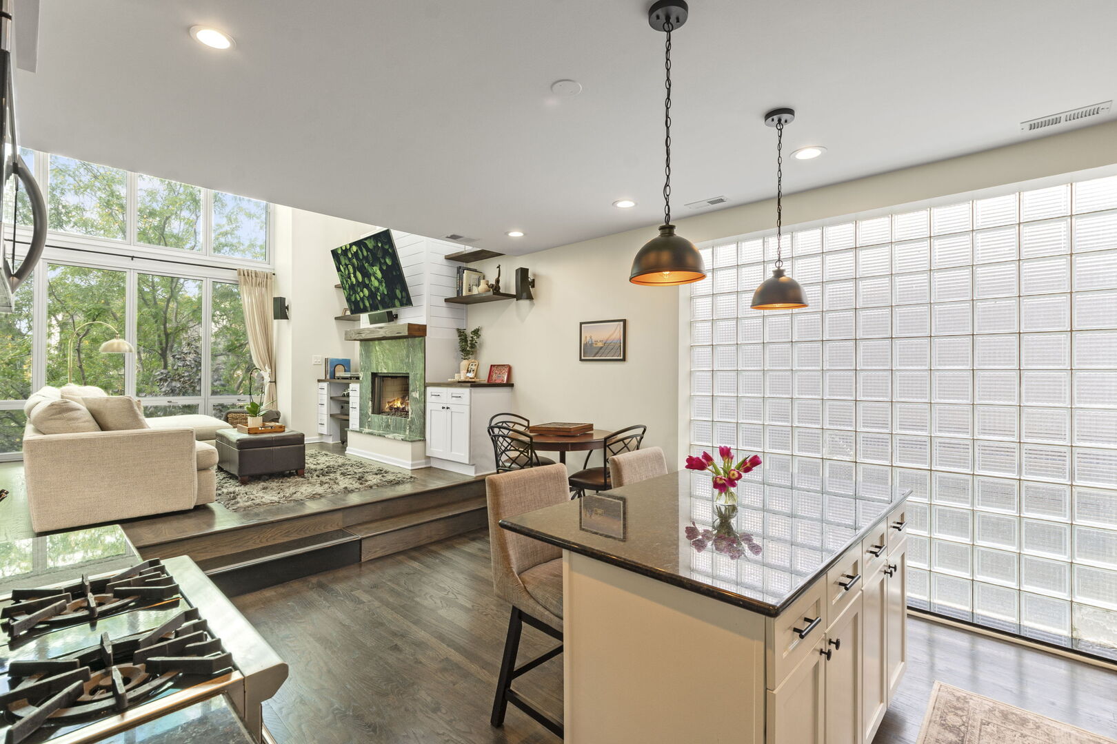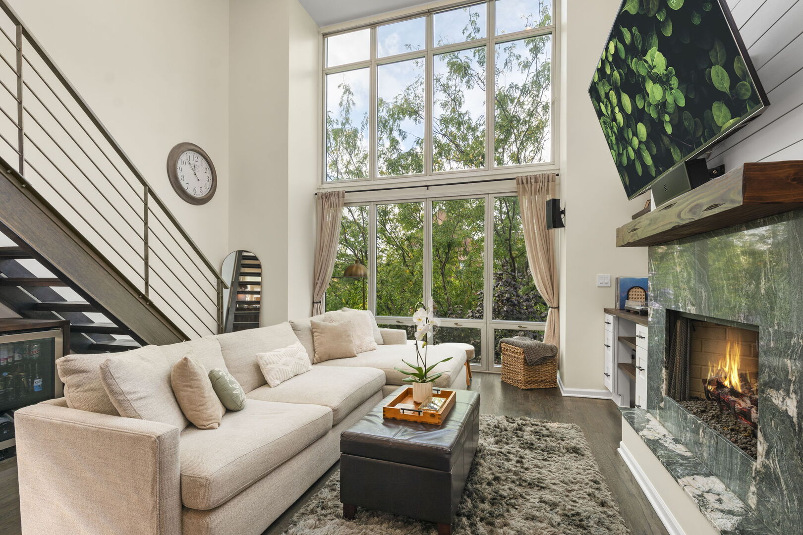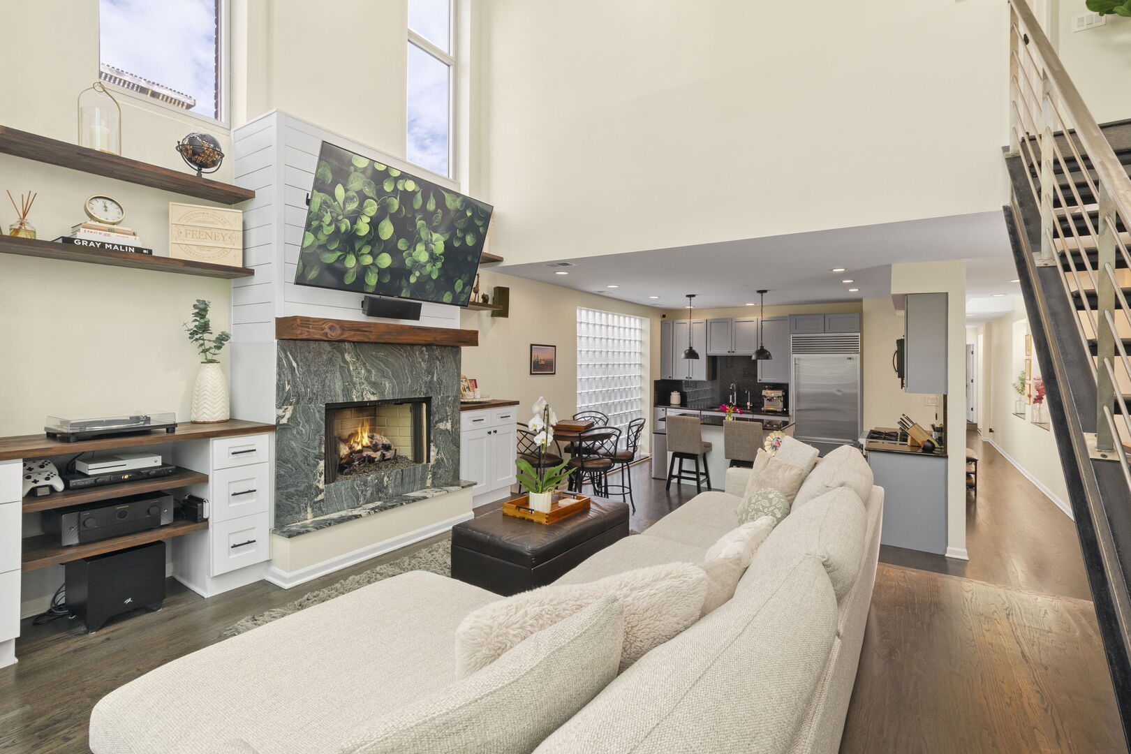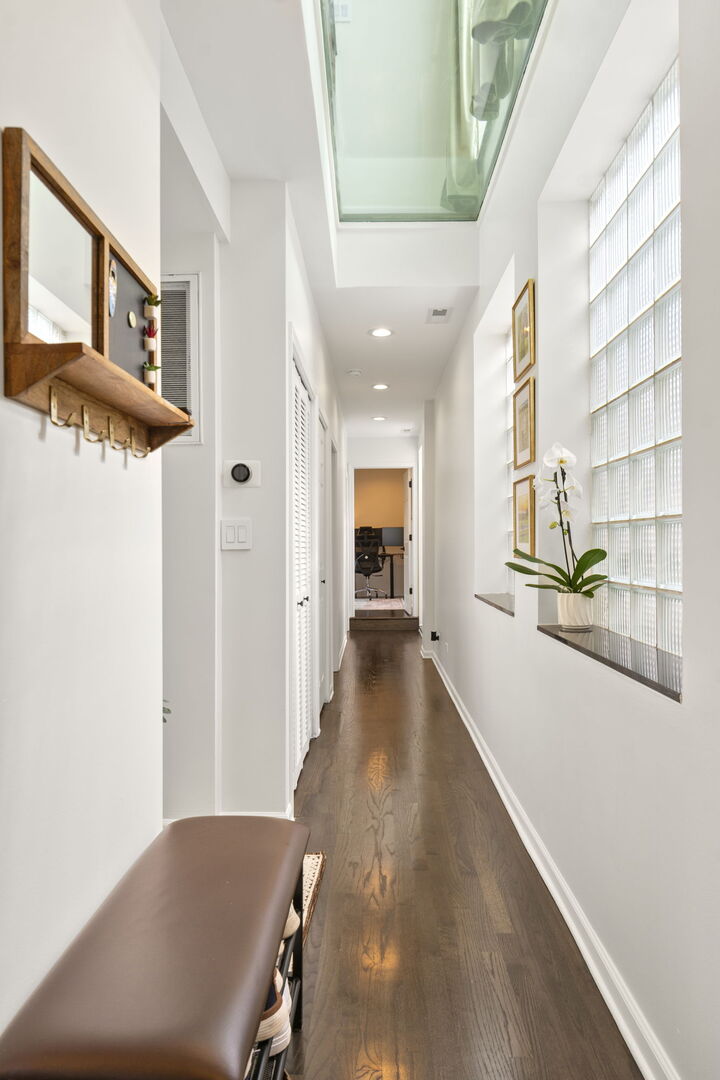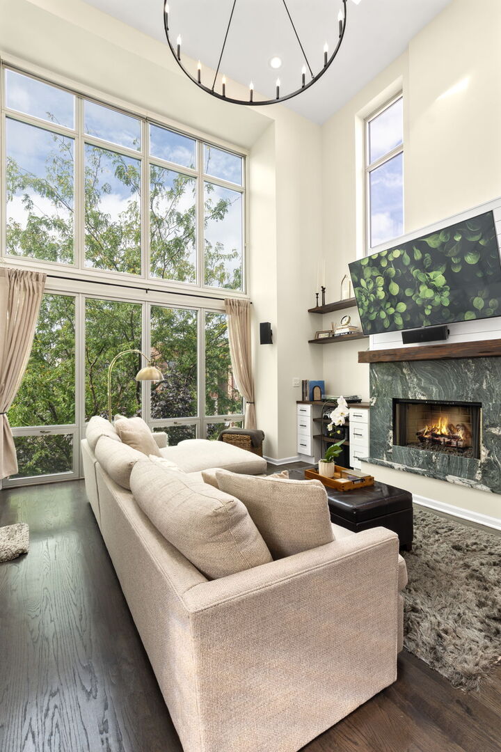 Live at the center of it all in this stunning duplex-up penthouse located in the heart of Wicker Park. This move-in ready, 3 bed, 2 bath home features a dramatic two-story living room with oversized windows, flooding the space with natural light and showcasing the open, airy layout with tree-top views. Living room has thoughtful built-ins maximizing storage including dry bar and 2 built-ins/shelving flanking the gas fireplace. Open kitchen features high-end appliances, island with breakfast bar, filtered water system & modern finishes. 2 bedrooms share newly redone bathroom on main level. Upstairs welcomes the gorgeous, completely renovated primary suite featuring high ceilings, custom built-in with quartz counters, ample closets. Beautiful primary bathroom features double sinks, glass shower, free standing tub and picture window highlighting the fantastic views. Enjoy two private outdoor spaces, including an ideal rooftop deck with jaw-dropping skyline views, perfect for entertaining or as your relaxing city oasis. 1 garage parking space included. Hardwood floors throughout. In-unit washer & dryer. Private entrance. Numerous updates throughout. Don’t miss this special home!