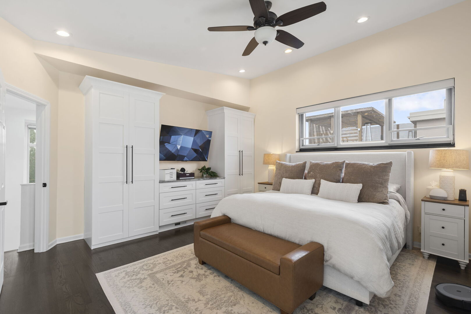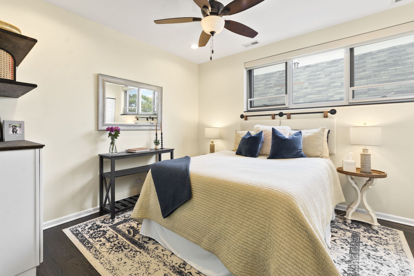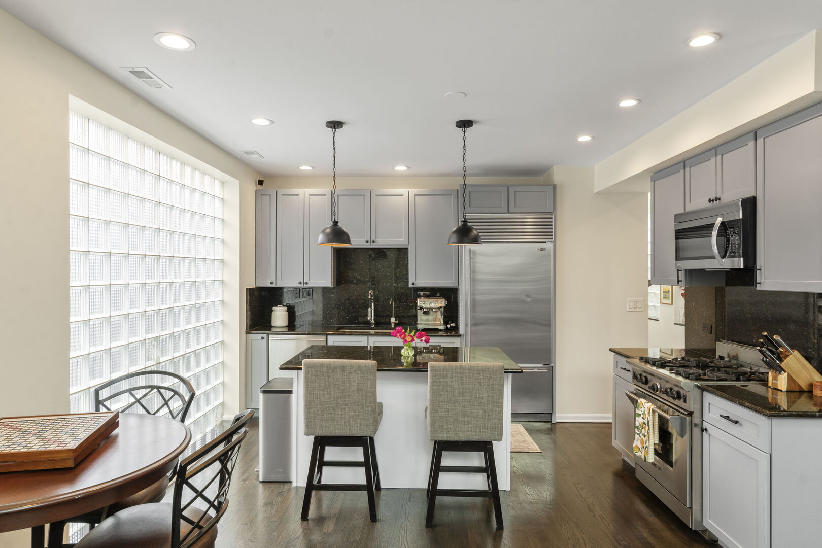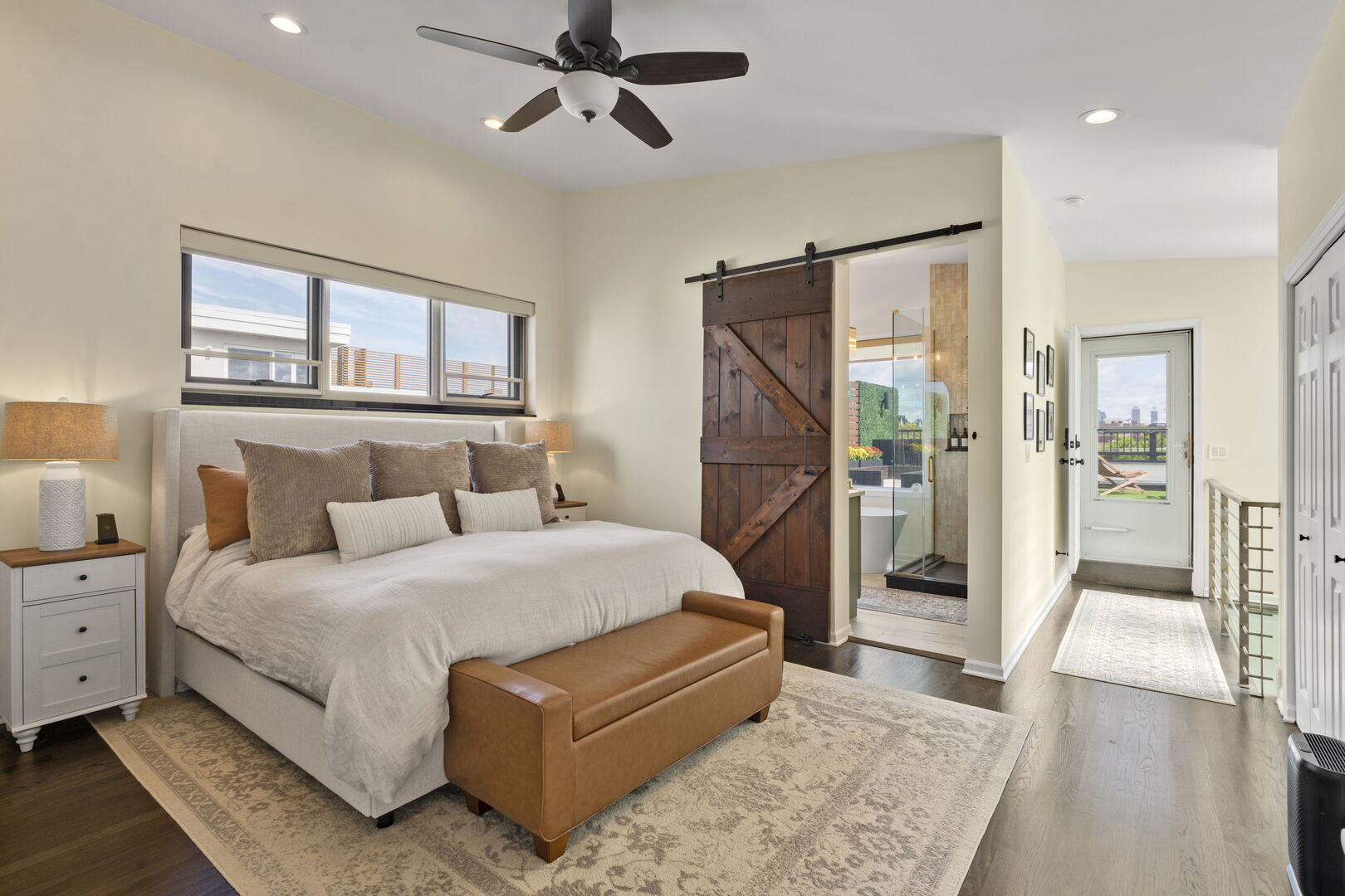 Live at the center of it all in this stunning duplex-up penthouse located in the heart of Wicker Park. This move-in ready, 3 bed, 2 bath home features a dramatic two-story living room with oversized windows, flooding the space with natural light and showcasing the open, airy layout with tree-top views. Living room has thoughtful built-ins maximizing storage including dry bar and 2 built-ins/shelving flanking the gas fireplace. Open kitchen features high-end appliances, island with breakfast bar, filtered water system & modern finishes. 2 bedrooms share newly redone bathroom on main level. Upstairs welcomes the gorgeous, completely renovated primary suite featuring high ceilings, custom built-in with quartz counters, ample closets. Beautiful primary bathroom features double sinks, glass shower, free standing tub and picture window highlighting the fantastic views. Enjoy two private outdoor spaces, including an ideal rooftop deck with jaw-dropping skyline views, perfect for entertaining or as your relaxing city oasis. 1 garage parking space included. Hardwood floors throughout. In-unit washer & dryer. Private entrance. Numerous updates throughout. Don’t miss this special home!