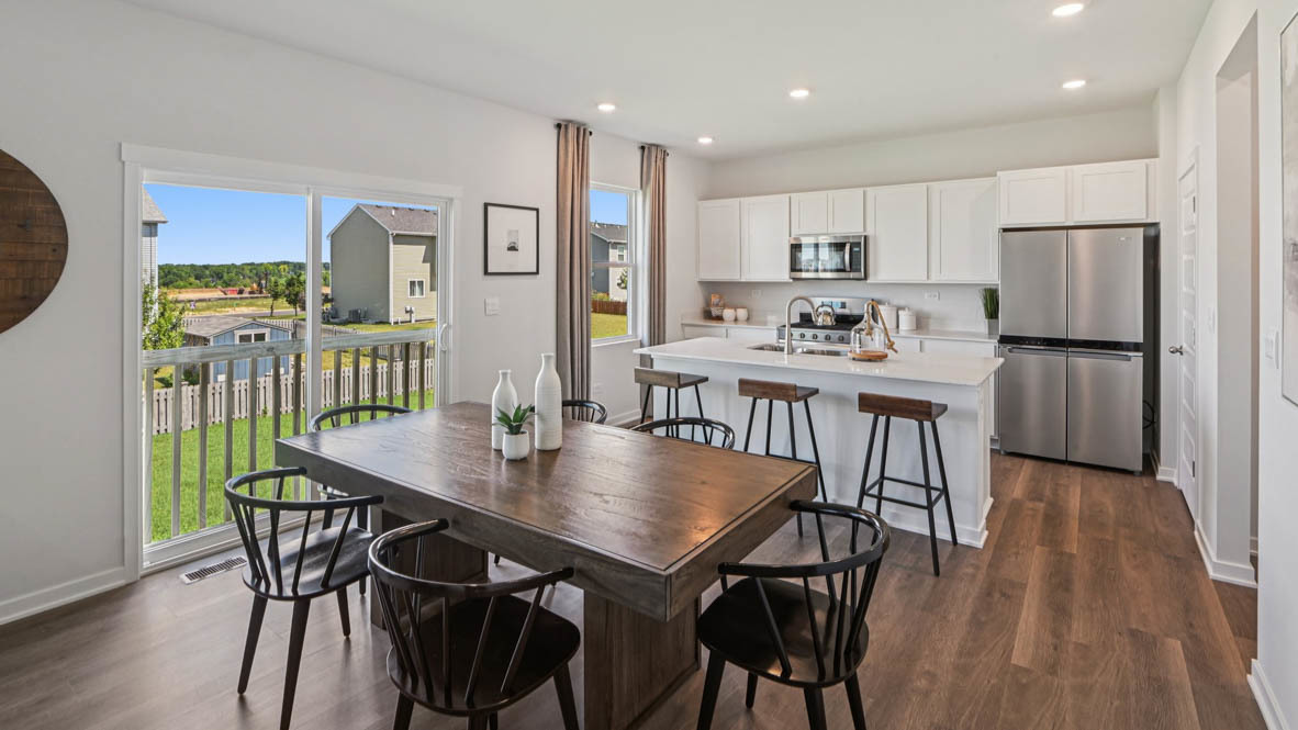 Discover yourself at 1038 Emerald Drive in Montgomery, Illinois, a charming new home in our Marquis Pointe community. This home is move-in ready NOW! This homesite includes beautiful brick on the front of the home, fully sodded yard, and wooded rear view. The Bellamy plan offers 2,051sqft, 2 story, 4 bedrooms, 2.5 baths, 9-foot ceilings on first level, and a full basement with look-out. Entertaining will be easy in this open-concept kitchen and family room layout with a large island and an overhang for stools, 36-inch designer cabinetry with soft close doors and drawers. Additionally, the kitchen features a walk-in pantry, modern stainless-steel appliances, sparkling quartz countertops, and easy-to-maintain luxury vinyl plank flooring. Heading up the staircase you will find your private getaway with your extra-large primary bedroom and en-suite bathroom with a raised height dual sink, quartz top vanity, and walk-in shower with spacious walk-in closet. Convenient laundry room on the second level, 3 additional bedrooms with a full second bath and a linen closet completes the second floor. Marquis Pointe is in Montgomery, IL, a charming historic town that evokes a family atmosphere with countless options for shopping, dining and entertainment. All Chicago homes include our America’s Smart Home Technology, featuring a smart video doorbell, smart Honeywell thermostat, smart door lock, Deako smart light switched, Builder Warranty 1-2-10 and more. Photos are of similar home and model home. Actual home built may vary.