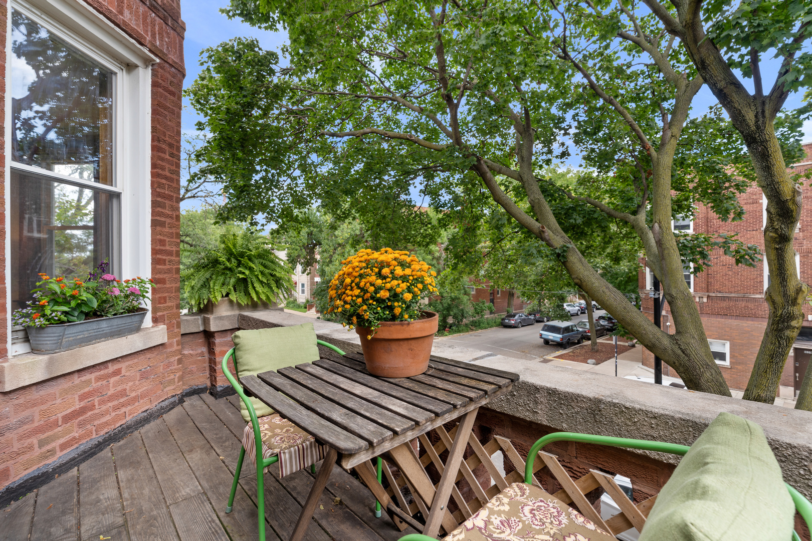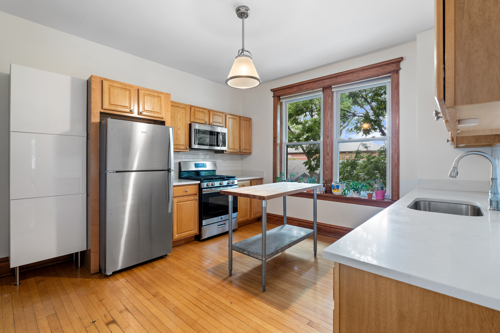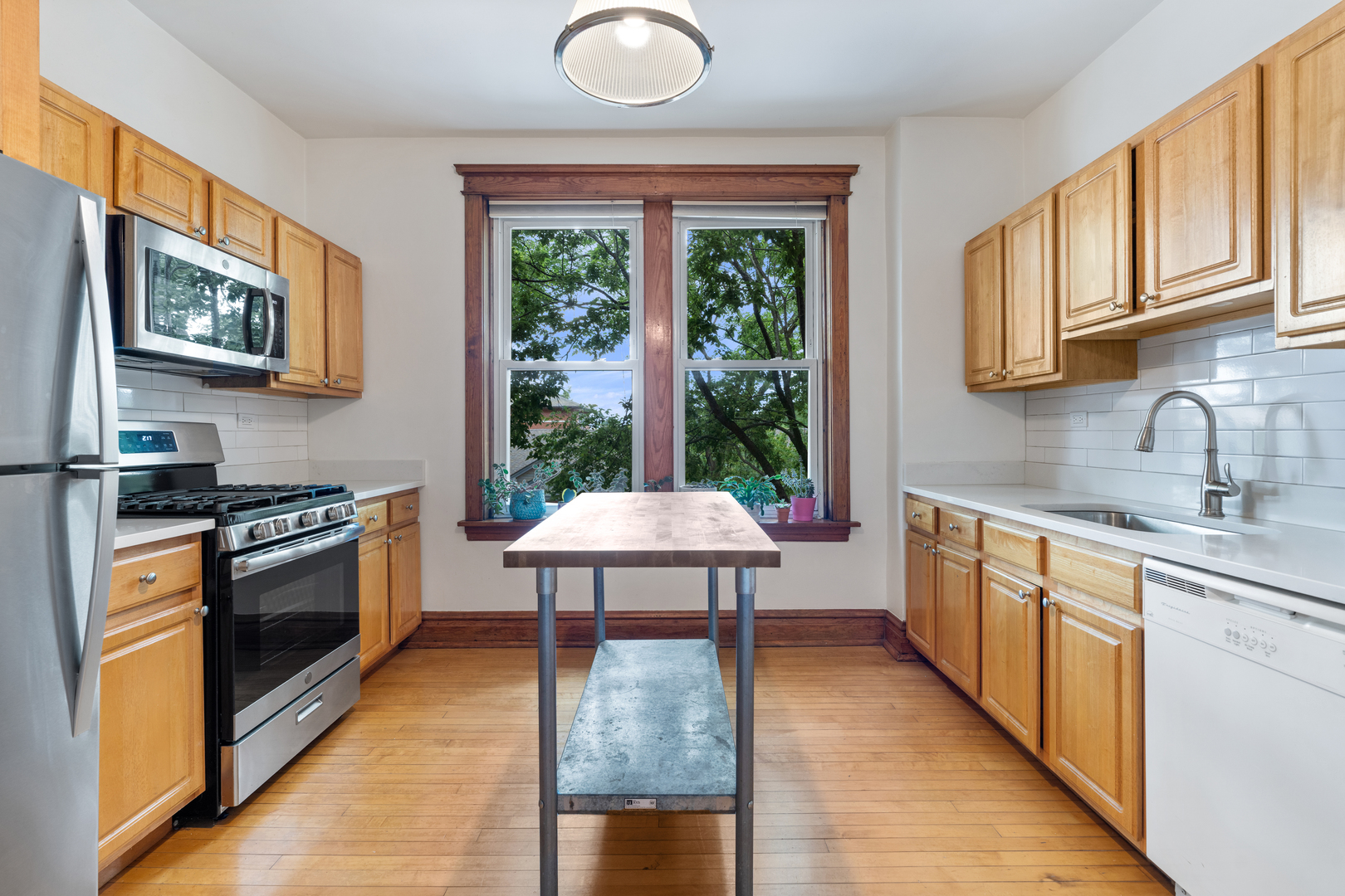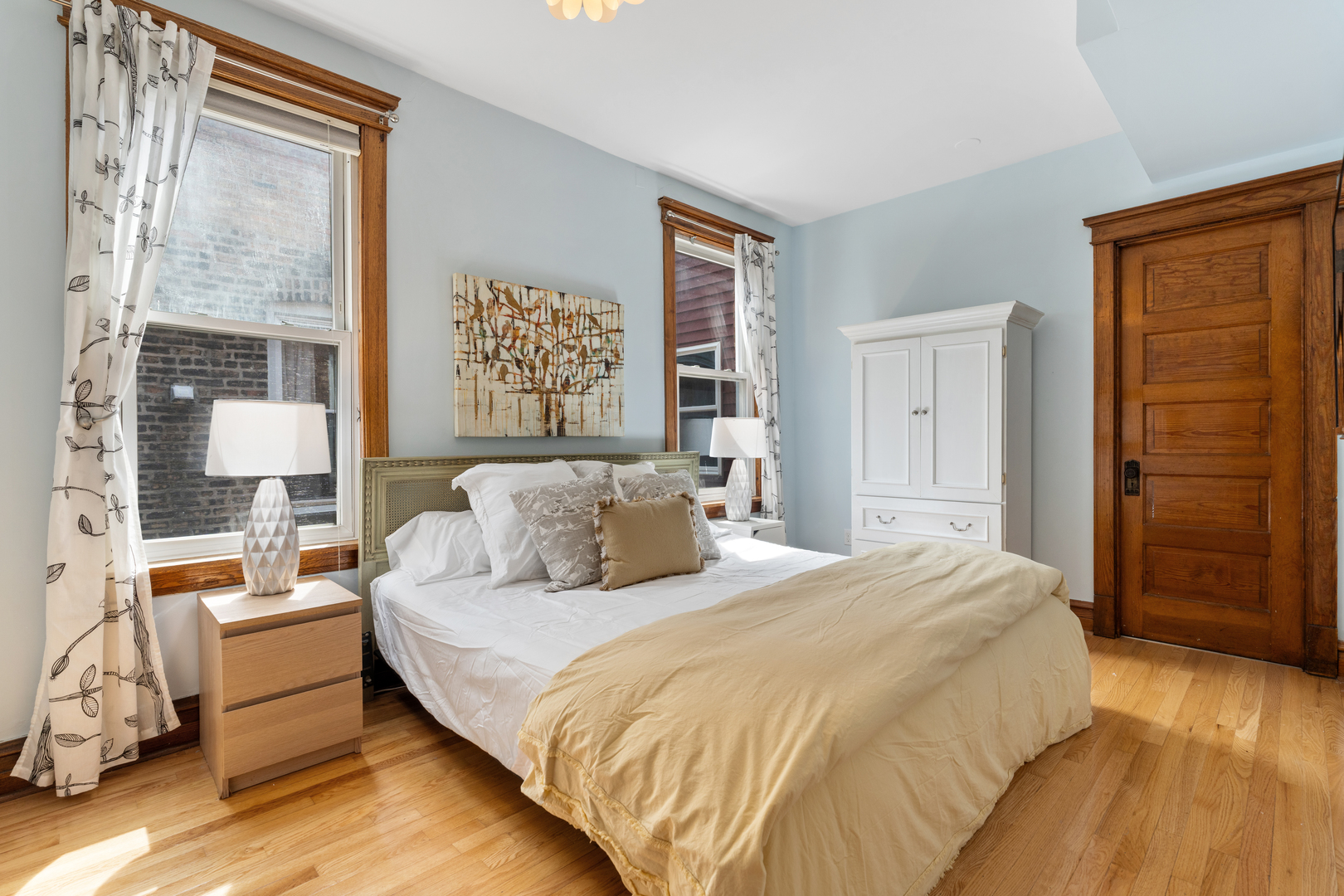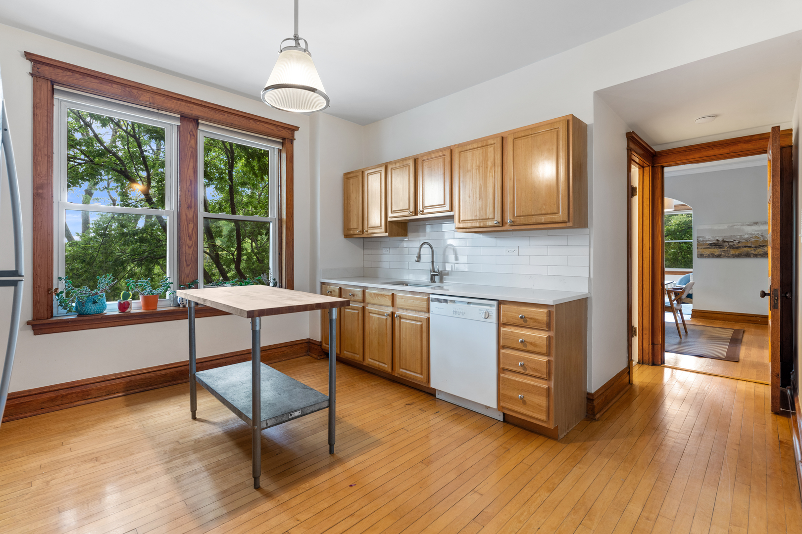 Tucked along a quiet, tree-lined street in the vibrant Ukrainian Village neighborhood, this beautifully updated top-floor 2-bed, 1-bath home seamlessly blends timeless charm with modern sophistication. Bathed in natural light from south, east, and north-facing windows, the interior showcases rich crown moldings, original woodwork, and a stunning built-in buffet that adds architectural character to the dining area. The chef’s kitchen features new quartz countertops, a prep island, new stainless steel appliances, and a pantry. The bright, inviting living room – anchored by an elegant bay window – flows seamlessly into the dining space, creating an effortless setting for both relaxed evenings and lively entertaining. The spacious primary bedroom includes a large walk-in closet, south-facing natural light, and plenty of room for a king-size bed. The second bedroom opens onto a private front porch with peaceful views of the tree-lined street. The second bedroom has a nice-sized walk-in closet, which doubles as a hall closet. A beautifully updated bathroom offers classic details with white tile, a built-in window shelf, and a linen closet. Thoughtful updates include an in-unit washer/dryer, central heating and air conditioning, a large walk-in pantry, and a private storage area perfect for bikes and seasonal items. With Division Street’s renowned restaurants, boutique shopping, and vibrant nightlife just steps away, this residence offers an exceptional blend of historic character and modern comfort. After these photos were taken, a brand new stainless steel dishwasher was installed.