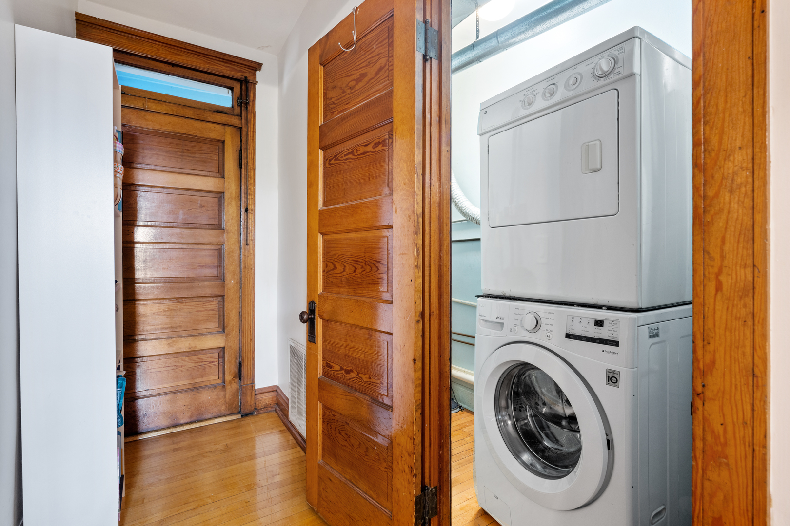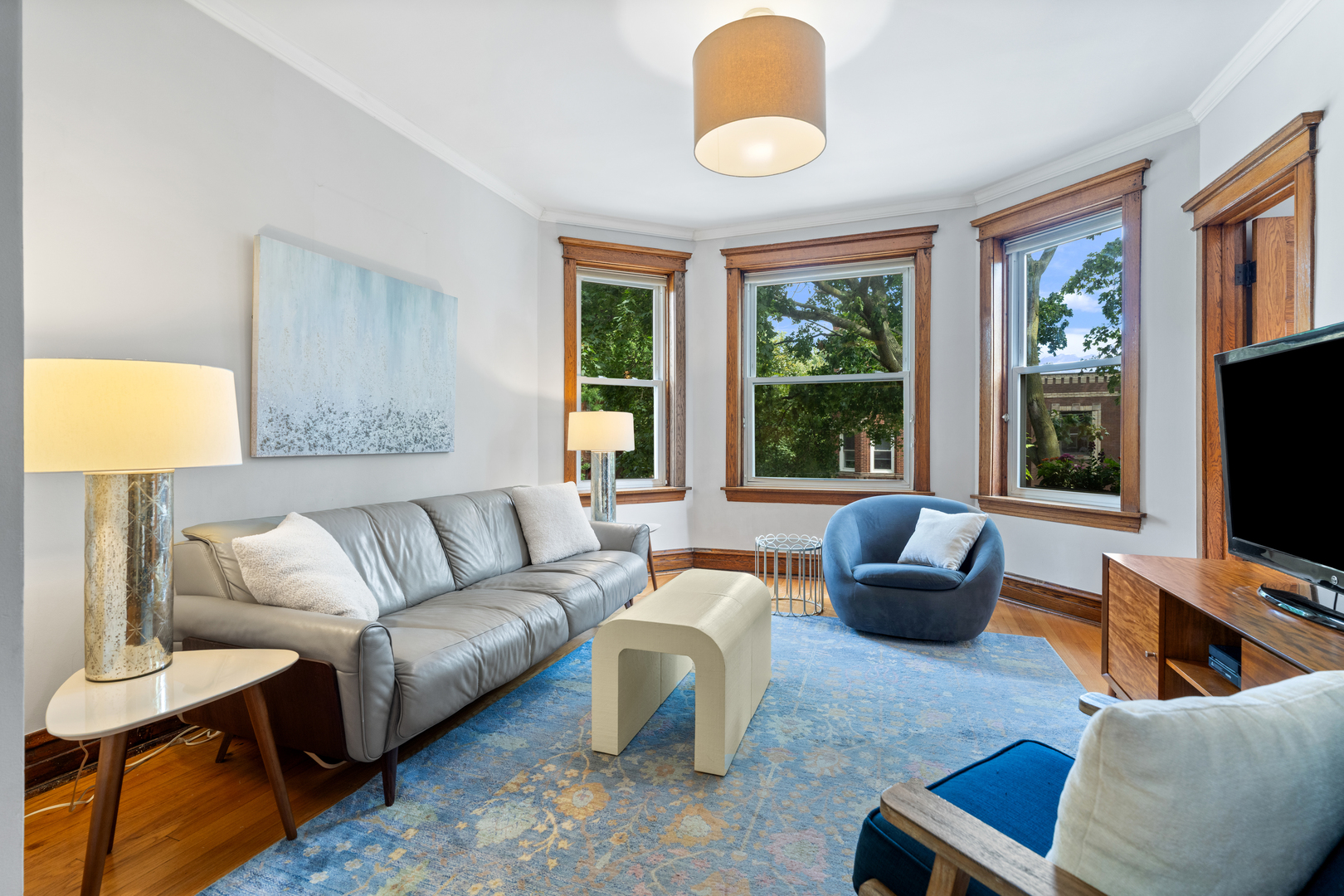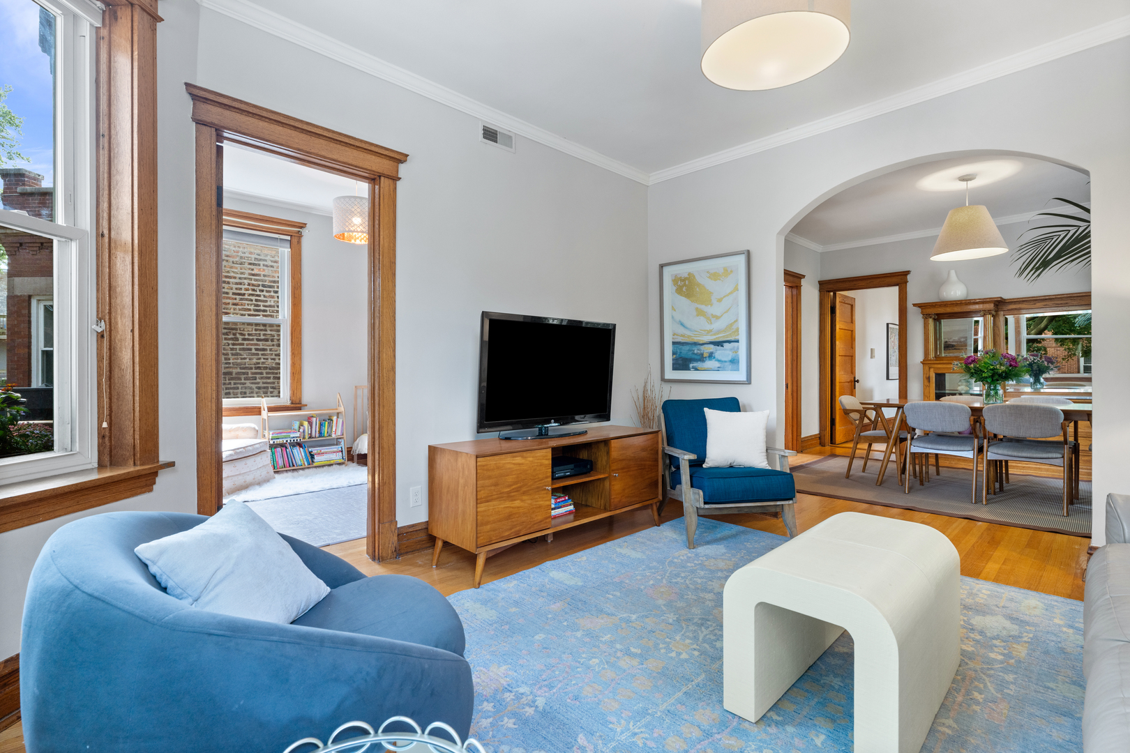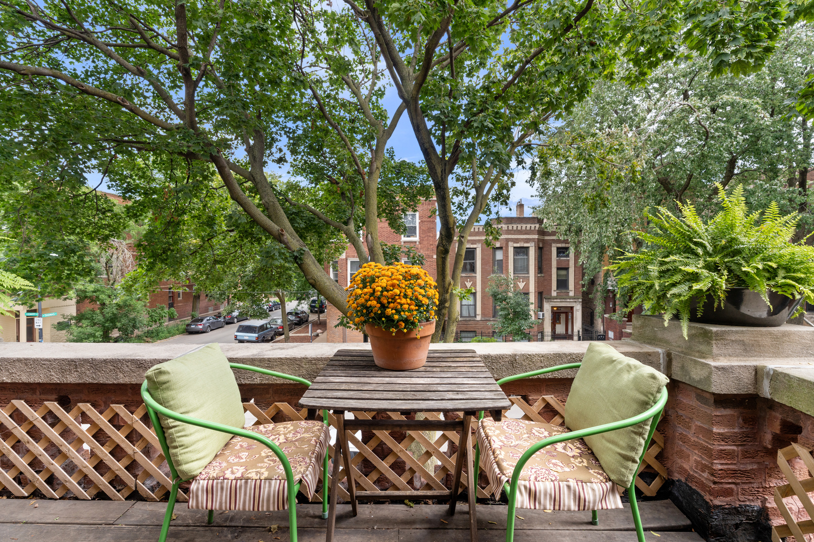 Tucked along a quiet, tree-lined street in the vibrant Ukrainian Village neighborhood, this beautifully updated top-floor 2-bed, 1-bath home seamlessly blends timeless charm with modern sophistication. Bathed in natural light from south, east, and north-facing windows, the interior showcases rich crown moldings, original woodwork, and a stunning built-in buffet that adds architectural character to the dining area. The chef’s kitchen features new quartz countertops, a prep island, new stainless steel appliances, and a pantry. The bright, inviting living room – anchored by an elegant bay window – flows seamlessly into the dining space, creating an effortless setting for both relaxed evenings and lively entertaining. The spacious primary bedroom includes a large walk-in closet, south-facing natural light, and plenty of room for a king-size bed. The second bedroom opens onto a private front porch with peaceful views of the tree-lined street. The second bedroom has a nice-sized walk-in closet, which doubles as a hall closet. A beautifully updated bathroom offers classic details with white tile, a built-in window shelf, and a linen closet. Thoughtful updates include an in-unit washer/dryer, central heating and air conditioning, a large walk-in pantry, and a private storage area perfect for bikes and seasonal items. With Division Street’s renowned restaurants, boutique shopping, and vibrant nightlife just steps away, this residence offers an exceptional blend of historic character and modern comfort. After these photos were taken, a brand new stainless steel dishwasher was installed.