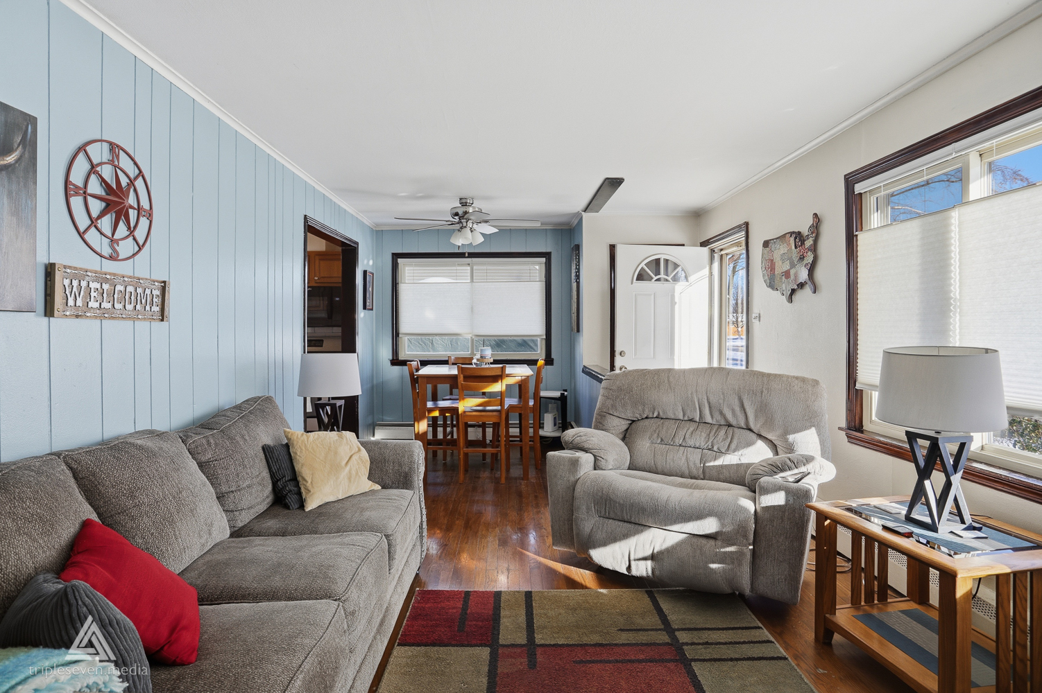 PRICE DROP!!! Welcome to this well-maintained and inviting older home, filled with character and a warm farmhouse feel. Beautiful hardwood floors flow throughout, enhancing the home’s charm. Offering two bedrooms and one full bath, the layout also includes a versatile den/game room that can easily be transformed into a nursery, office, or additional bedroom to suit your needs. The primary bedroom features a generous closet, while the bright second bedroom brings in plenty of natural light. The kitchen is equipped with oak cabinets, a newer refrigerator, and a newer microwave-ready for everyday cooking and entertaining. The hot water heater and whole house boiler have been recently updated, giving you added peace of mind. A standout feature of this home is the spacious attic, offering approximately 8-10 feet of clearance, providing excellent potential for future living space or storage. Step outside to a fully fenced backyard, vibrant with colorful perennials in the spring and summer. Enjoy evenings by the fire pit or relax under the outdoor lighting-an ideal space for gatherings and quiet nights alike. The detached garage includes a workbench, shelving, and additional attic storage, perfect for hobbies or extra organization. Conveniently located near schools, parks, and the library, this home also offers easy access to the train station, bus stops, shopping, and major interstates-everything you need just moments away. Don’t miss out on this beautiful home with incredible potential and timeless charm! COME SEE THIS HOUSE TODAY!!!!