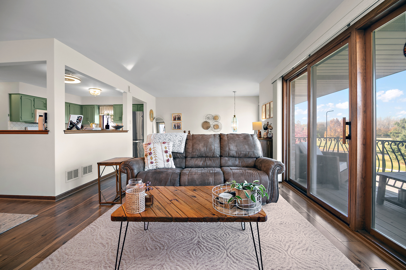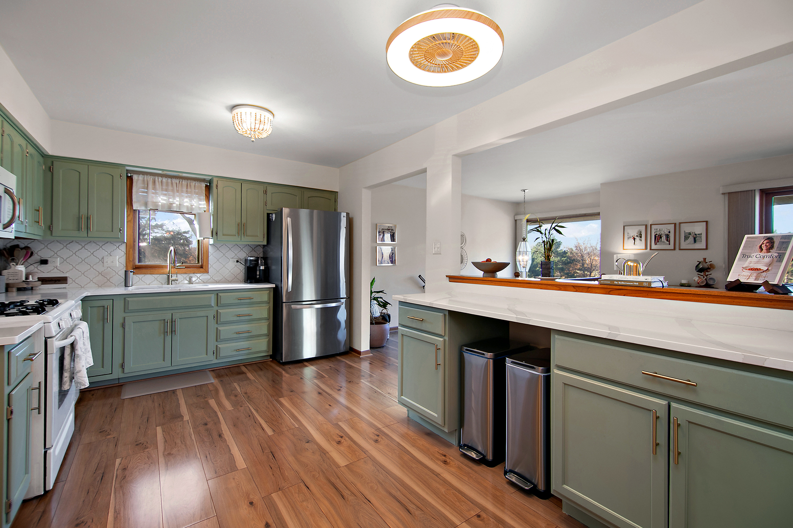 A Magazine-Worthy End Unit Overlooking the Park! This stunning, end-unit townhome, located in the highly desirable Eagle Ridge, offers a lifestyle of sophistication and comfort. Meticulously updated throughout, this 2-bedroom, 2.5-bath residence exudes a chic, mid-century modern flair that feels curated from the pages of a design magazine. The moment you enter the main living space, you are greeted by gorgeous, extra-wide luxury vinyl plank flooring and an expansive atmosphere enhanced by a fresh, warm white color palette. The custom-painted kitchen cabinets, topped with pristine quartz counters and a designer backsplash, create a culinary haven. Every detail has been considered, right down to the array of designer-selected light fixtures. The amazement continues on the finished lower level. From the two-car garage entry, discover an extra-large recreation room, perfect for entertaining, featuring new carpeting, a charming brick fireplace, and a custom bar. This level is completed by an updated half-bath, an oversized laundry/mudroom, and ample storage solutions, making this home as functional as it is beautiful. This is a MUST SEE!