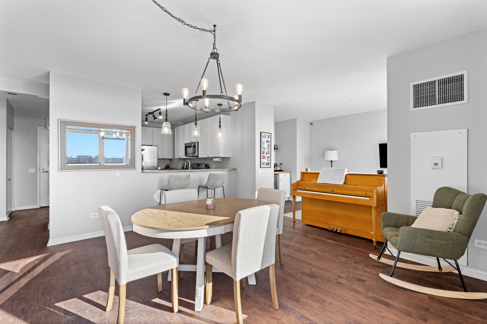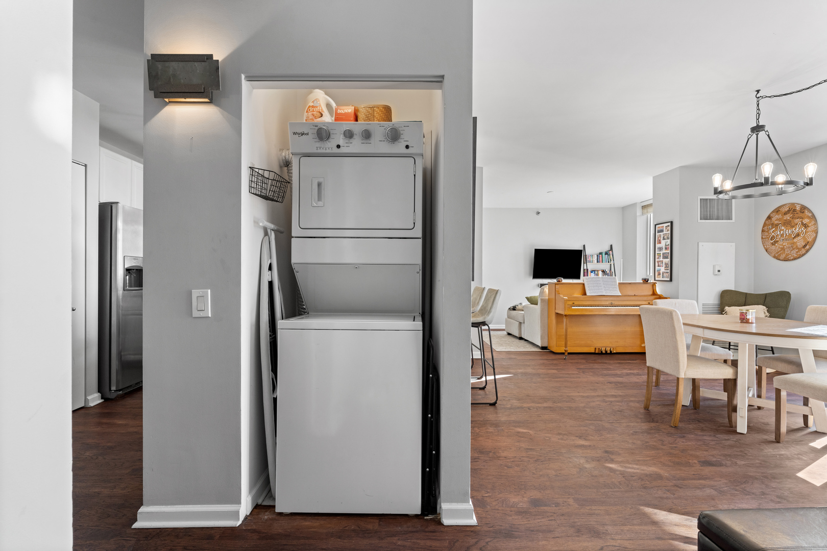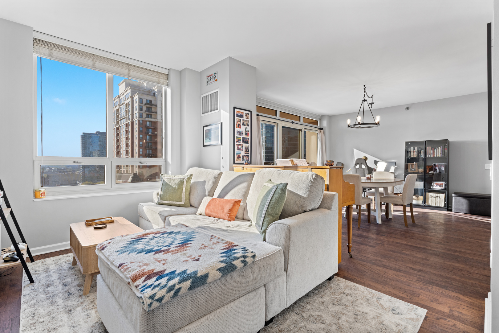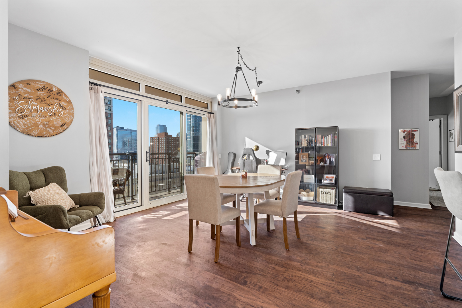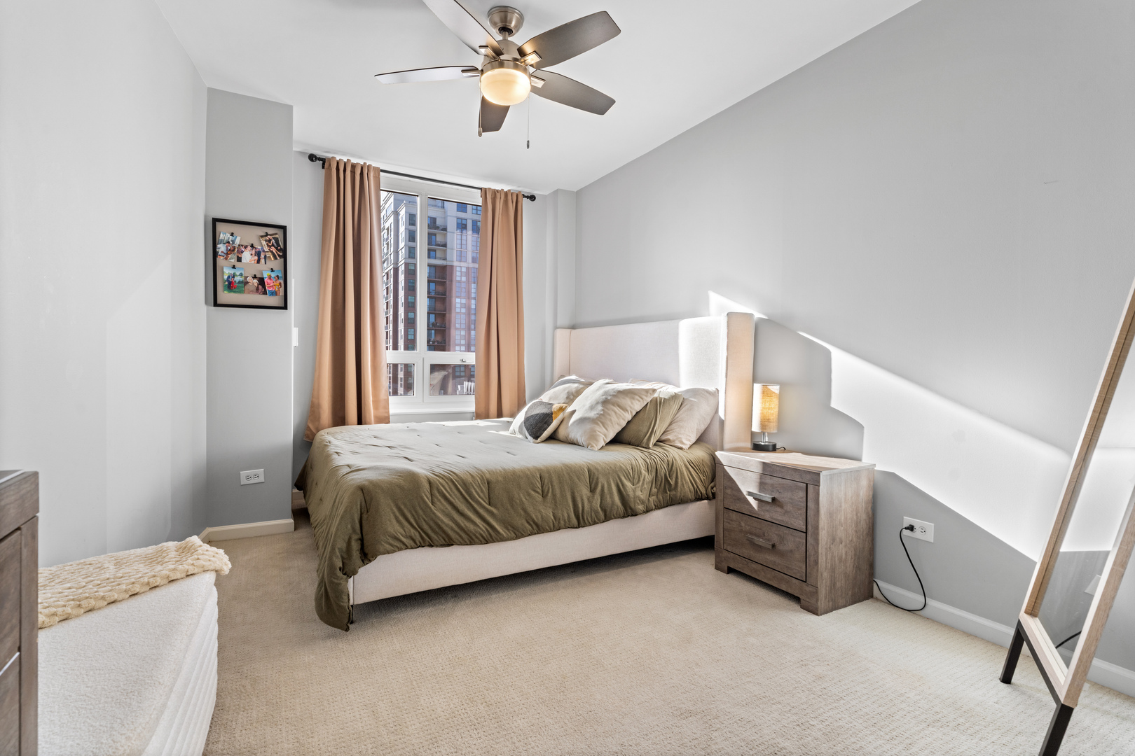 Enjoy bright city views and amazing sunsets from this sunny, west facing, 1300sf 2bed/2bath unit in Chicago’s South Loop neighborhood. Upon entering, you’re greeted by a chefs’ kitchen which has stainless steel appliances, 42″ white cabinets, solid stone counter tops and pantry. The open kitchen/dining/living room flows seamlessly and is the perfect entertaining home, with a custom built-in bar, all of which leads directly out to your large 18 ft long balcony. The Primary bedroom is nicely sized with blackout shades, a large/professionally organized walk in closet, and bath with both a deep soaking tub and separate shower. The second bedroom is very nicely sized also. Both bedrooms have plush carpeting and the home has been recently painted. Newer stackable washer/dryer in unit as well. Building features a gym and locker rooms, swimming pool, business center, receiving room, bike room, on-site engineer team, 24 hour door person, on site property manager and more! Indoor garage parking and Storage locker included in price. Building has very healthy financials with approximately $2.9M in building reserves and is walkable to all of your daily needs, including grocery options, locally favorited restaurants, Chicago’s Grant Park/lakefront and public transportation. HOA includes heat, AC, gas, RCN cable TV/internet access…everything but electric. This is the perfect city home!