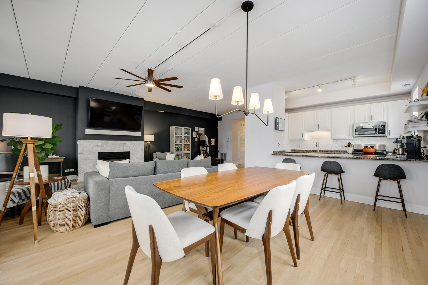 Perfectly positioned in a boutique elevator building in the heart of the West Loop, this exceptional northwest-corner two-bedroom, two-bath residence offers a rare combination of light, scale, and thoughtful design. The expansive living room is anchored by a gas fireplace and intelligently designed with distinct alcoves ideal for a home office, reading nook, or fitness space-offering flexibility that suits modern city living. Just beyond, a dedicated dining area is flanked by an oversized kitchen peninsula on one side and a private, tree-lined balcony overlooking Madison Street on the other, creating an inviting environment for both everyday living and entertaining. The kitchen is bathed in natural light from a large window and offers abundant storage, including a separate pantry, classic white shaker cabinetry, granite countertops, and newer stainless-steel appliances-timeless, functional, and well executed. A welcoming foyer provides a formal sense of entry along with additional storage, enhancing the home’s flow and functionality. Privately tucked away, both bedrooms enjoy sunny southern exposures and have been elevated with wainscoting, designer lighting, and custom shelving. The generously sized primary suite exudes understated sophistication, complete with an organized walk-in closet and a refreshed ensuite bath featuring a separate tub and walk-in shower. Soaring 9+-foot ceilings and unobstructed north, west, and south exposures flood the extra-wide interiors with natural light throughout the day, highlighting the beautifully restored light oak hardwood floors that run seamlessly throughout the home. Refined updates throughout and important mechanical improvements such as a newer A/C condenser, hot water heater, and washer and dryer. Additional storage and one large exterior gated parking space are included. Enjoy an unparalleled West Loop lifestyle with convenient access to acclaimed restaurants, boutique shopping, grocery stores, parks, fitness studios, and nightlife, along with effortless connectivity to the Kennedy and Eisenhower Expressways and Ogilvie and Union Stations. A refined urban residence where light, location, and livability converge.