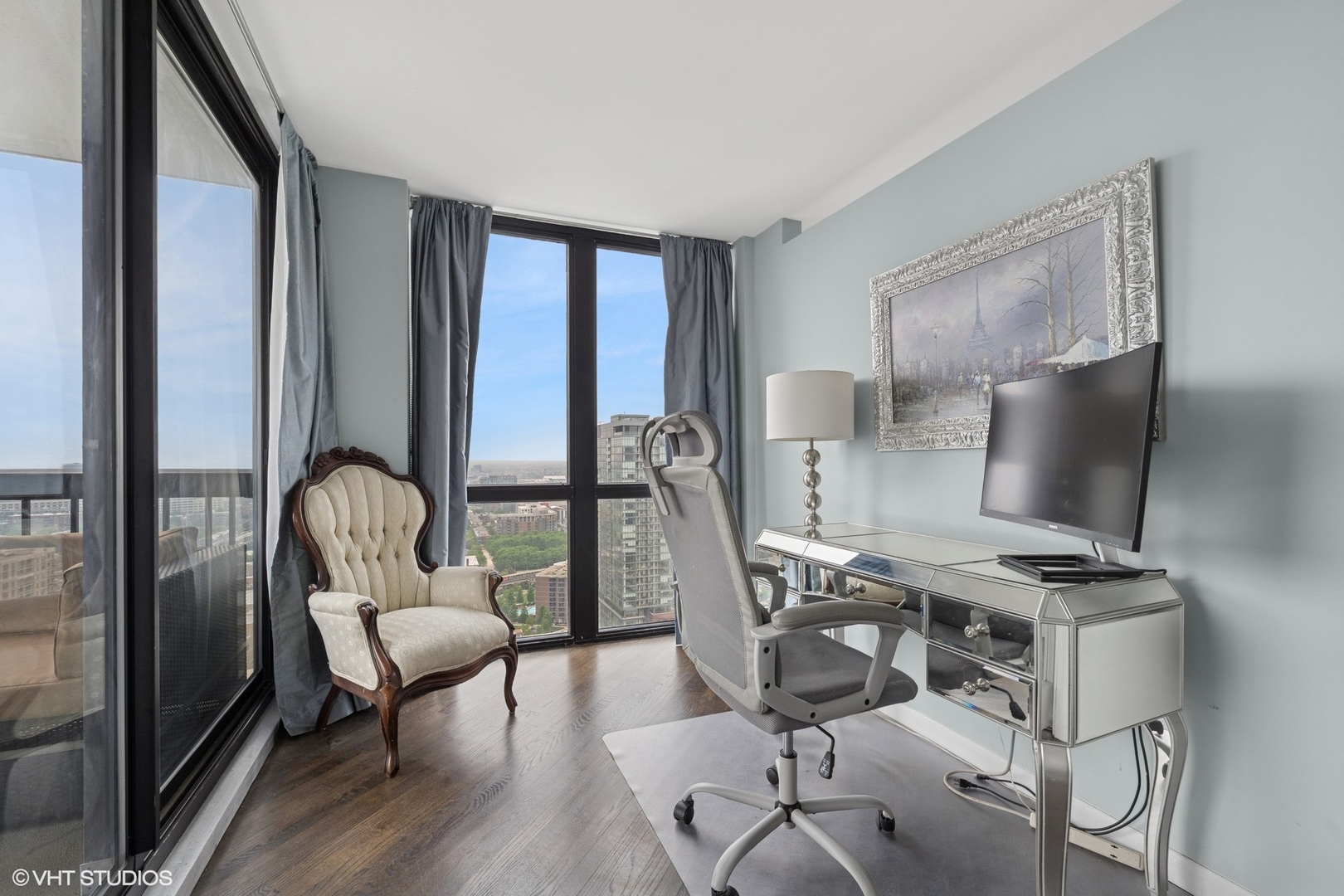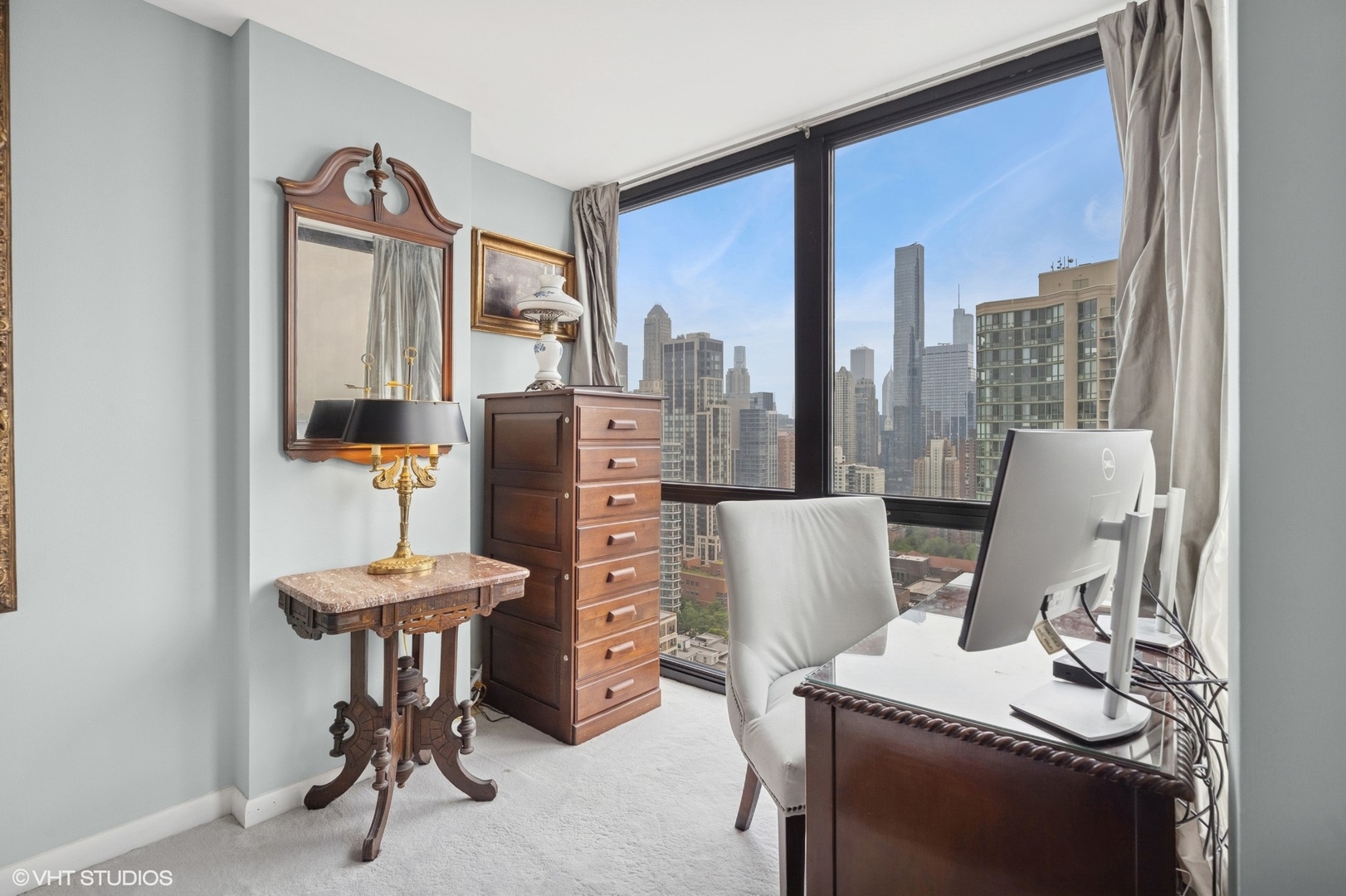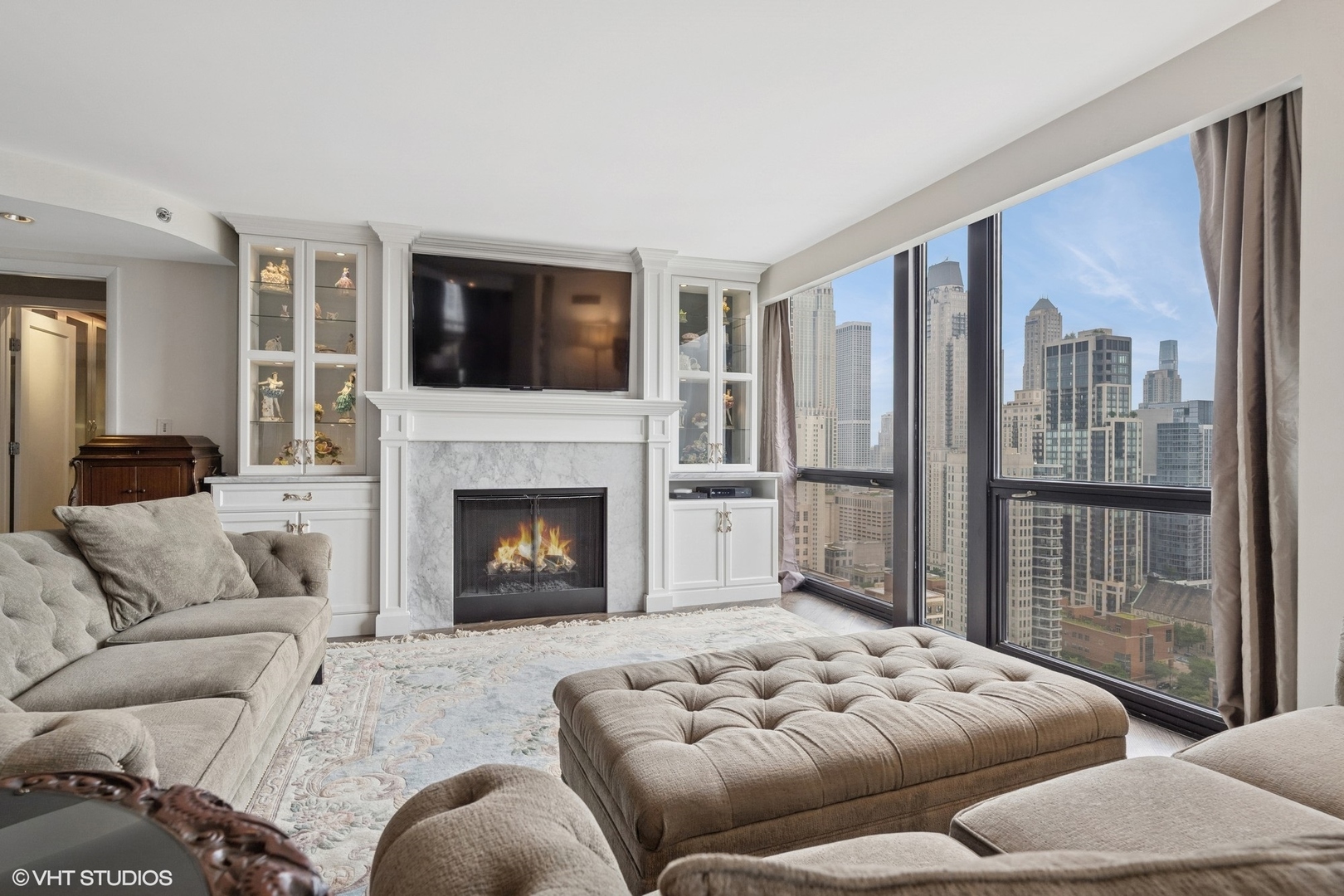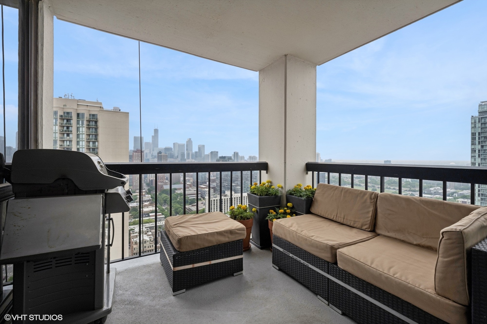 Enjoy beautiful panoramic city views from the southwest corner of one of the top floors at The Elm at Clark. This 3bed+den/3 full bath open concept home has 1800 SQFT of living space and is great for entertaining. Floor-to-ceiling windows showcase stunning city views while the open floorplan floods the home with natural light. An entry foyer has enough space to accommodate a baby grand piano. The living room features a fireplace flanked by built-in bookcases. An upgraded kitchen has granite counters, Sub-Zero, Wolf, Dacor, and Bosch appliances, and a breakfast bar. Conveniently located just off the kitchen, a large, covered balcony is the ideal place to grill, dine, and relax. The living space also offers a den/office, with fantastic views, perfect for working from home. The primary bedroom features porcelain tile flooring, a sitting “nook,” and an ensuite bathroom with double sinks and shower. The second bedroom has an ensuite bath and the third bedroom has a large, walk-in closet. A third full bath is accessible to both the third bedroom and to guests. A laundry room with washer and dryer completes this residence. Two storage cages included in the price. Deeded parking space (P216) available for an additional $40,000. Professionally managed building with 24hr doorman, outdoor pool, fitness room & party room. Steps to the lake, Wells Street, shopping, restaurants, grocery stores, gyms, public transportation, and all the Gold Coast has to offer!