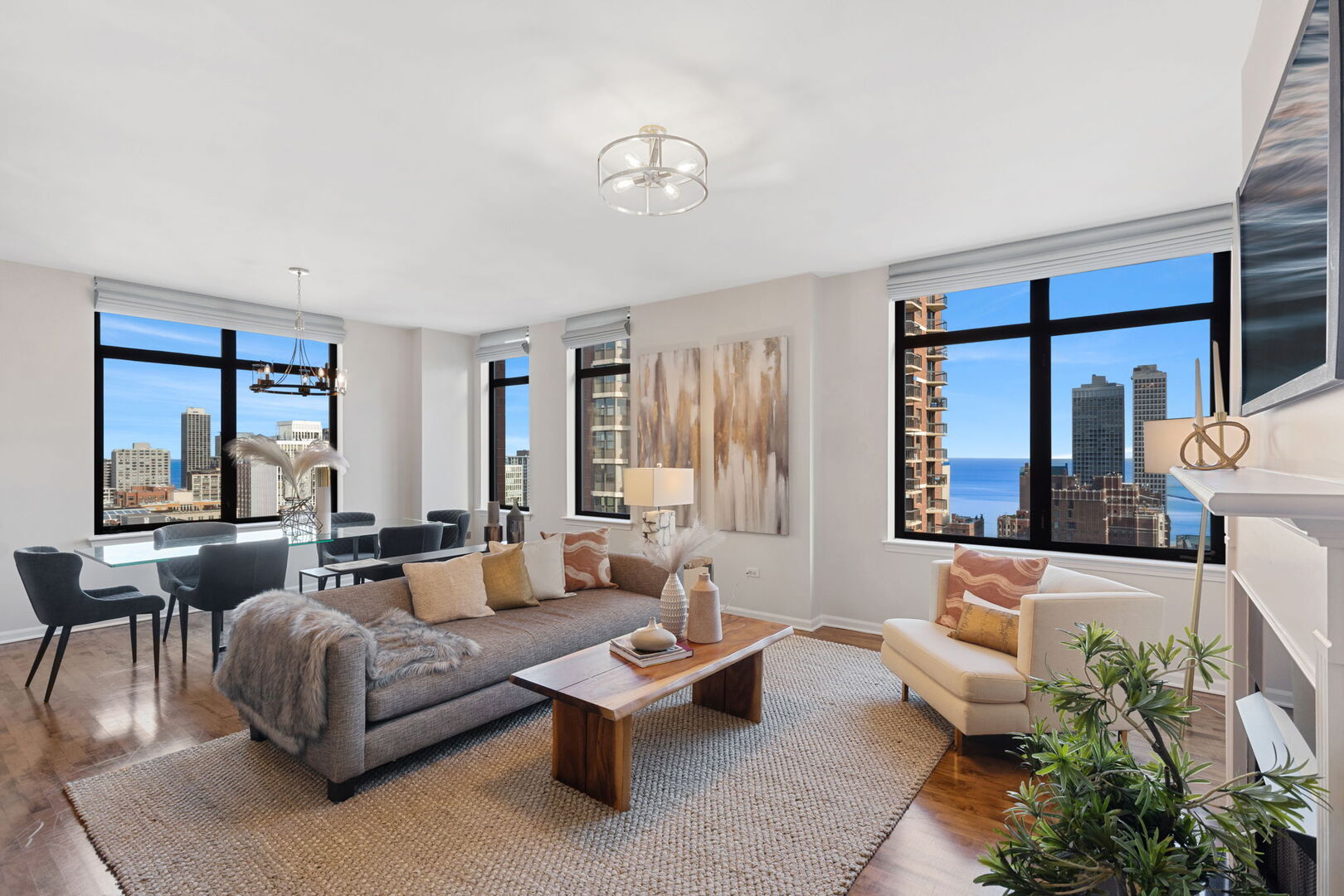 Sophisticated 3-Bedroom / 2.1-Bath “H” Tier Residence in Chicago’s Prestigious Gold Coast. Set on picturesque, tree-lined Dearborn Street, this rare 3-bedroom, 2.1-bath home offers an elevated urban lifestyle in one of the Gold Coast’s premier boutique buildings. Enjoy stunning Lake Michigan and city skyline views from an open-concept floor plan with a desirable split-bedroom layout, 9-foot ceilings, and a private 20′ x 5′ balcony. The expansive living and dining area features wrap-around windows, a fireplace, beautiful hardwood floors, and custom-designed lighting scheme. The stunning custom designed OBrian Harris kitchen boasts premium appliances, reverse osmosis water system with instahot a pantry, and abundant built-ins, making it perfect for both entertaining and everyday living. The primary suite captures lake views and includes a very large professionally organized walk-in closet and a luxurious en-suite bath custom designed by OBrian Harris. This spa-like retreat offers heated floors, a steam and rain shower, and extensive custom storage. A welcoming foyer with two large closets leads to a powder room, full-size side-by-side laundry with extra storage, and a bonus linen closet, completing this impeccably maintained home. Residents enjoy 24-hour door staff, on-site management, a fitness center, party room, and a rooftop deck with panoramic views. Steps from world-class dining, shopping, the farmer’s market, and the lakefront, this home offers the very best of Gold Coast living. Additional storage and one prime garage parking space included.