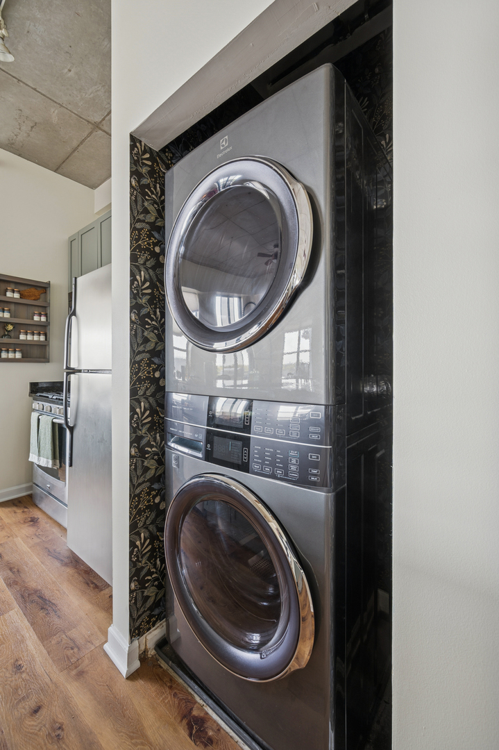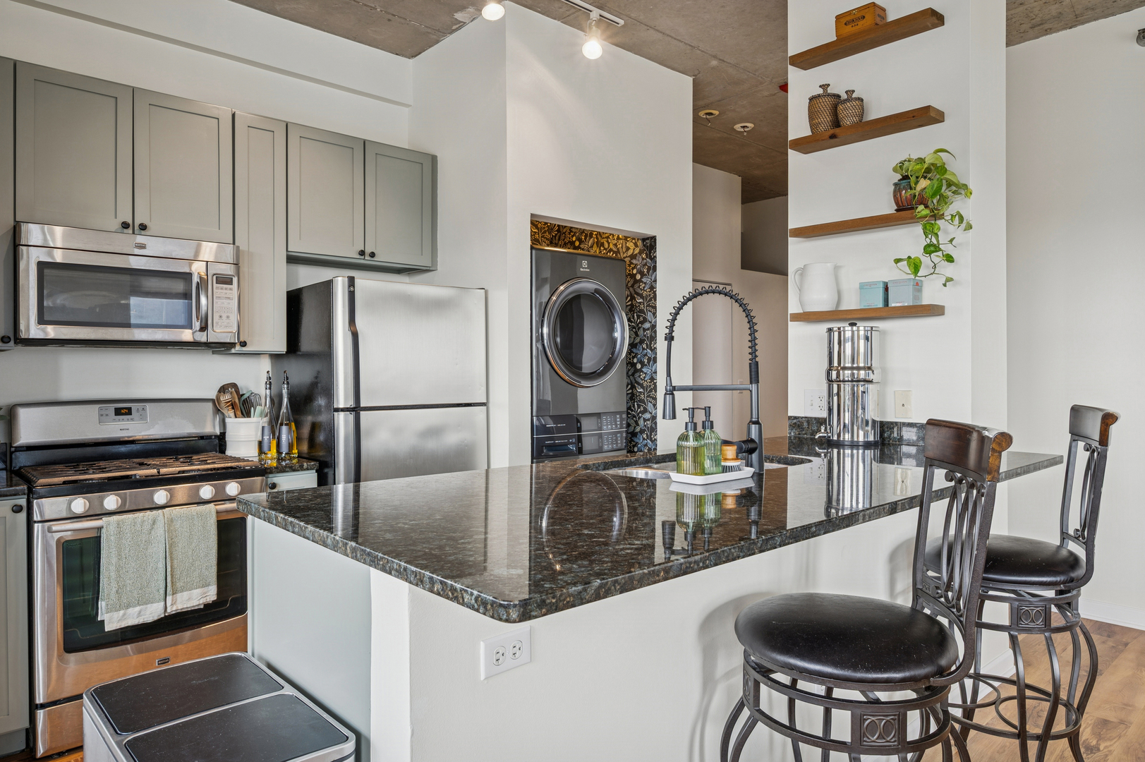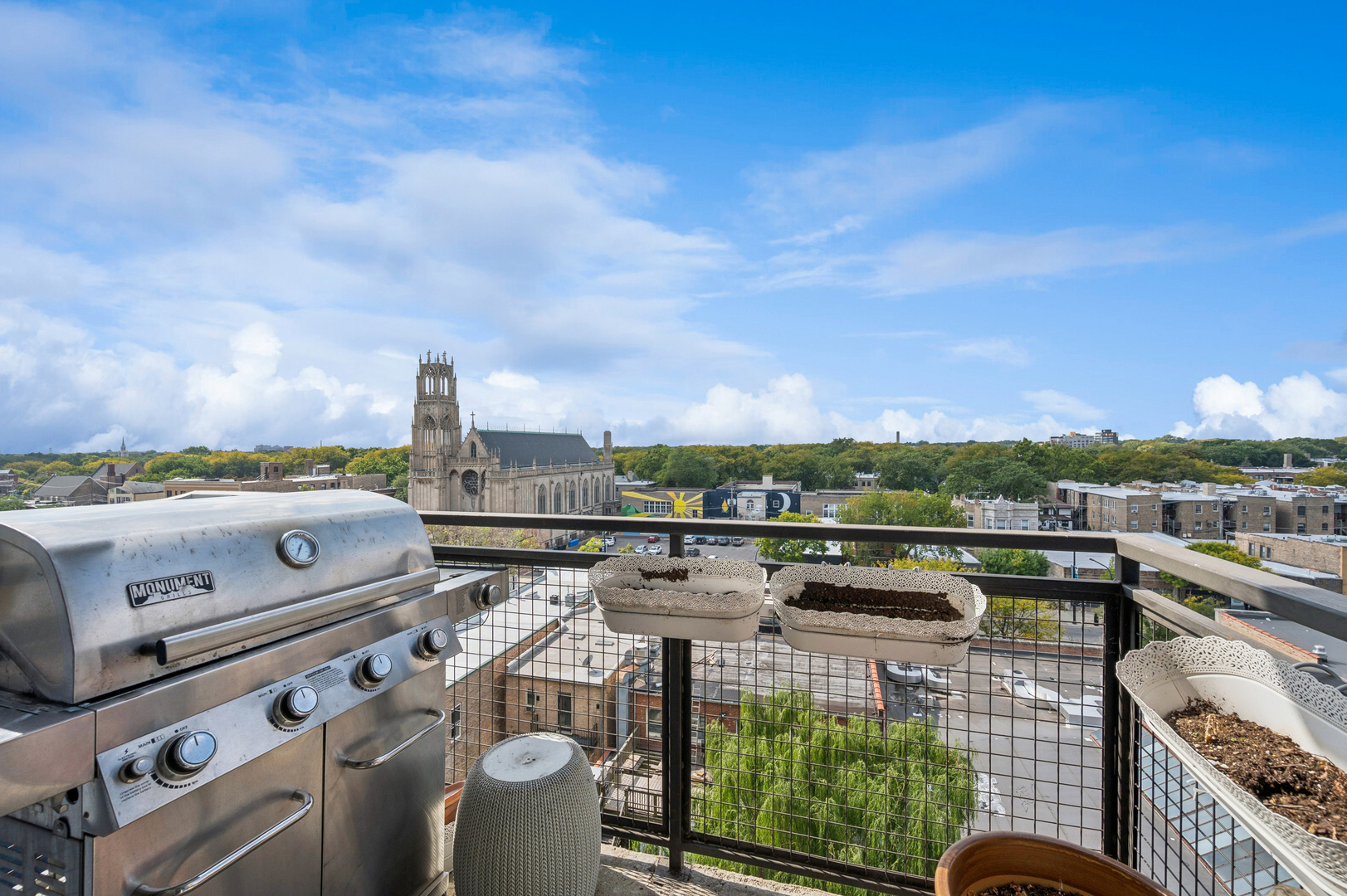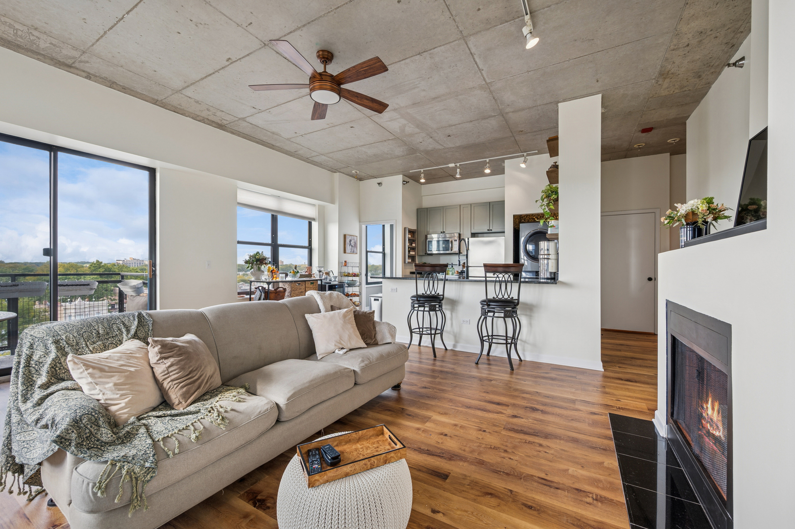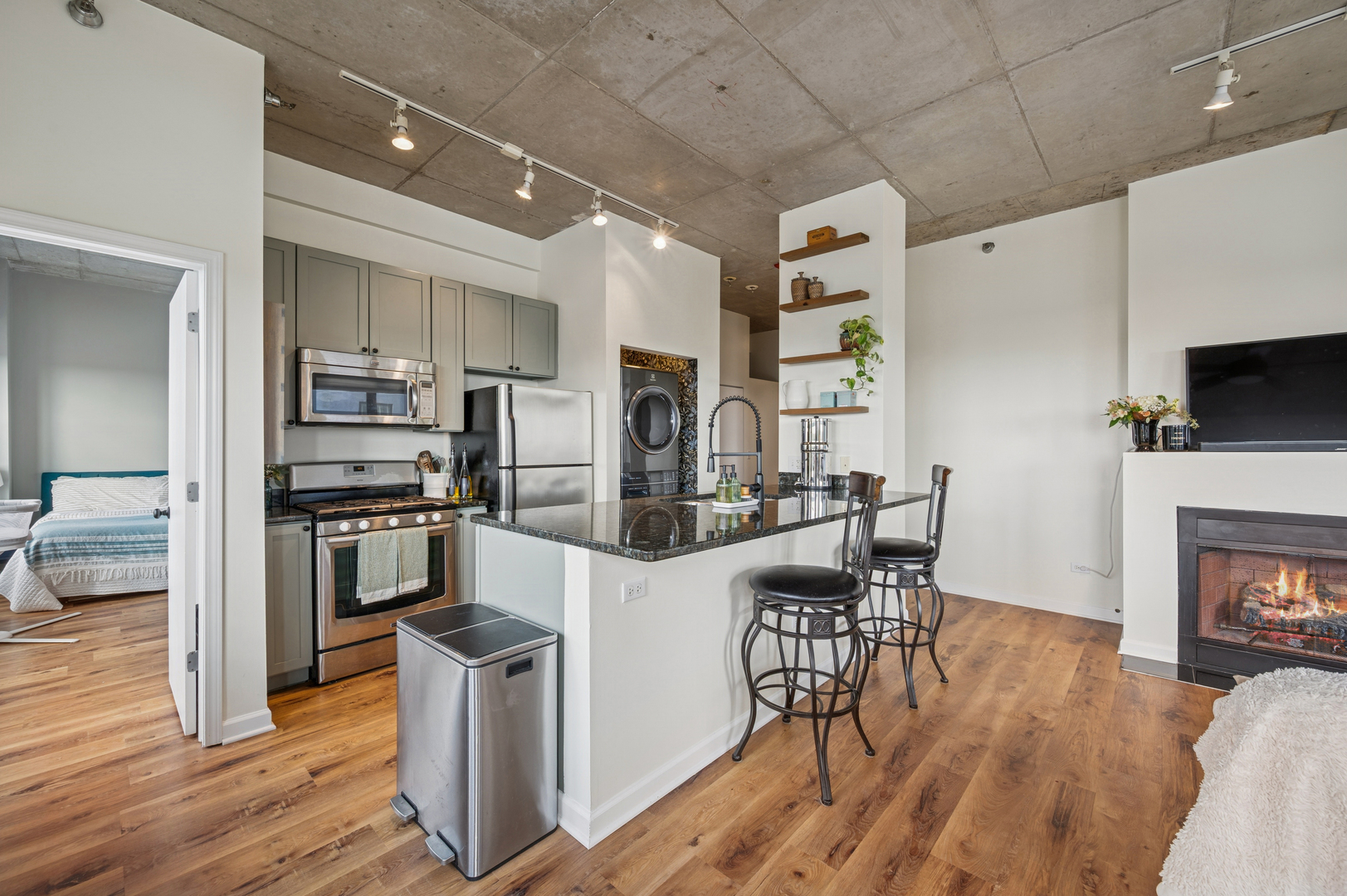 Edgewater modern loft living with sweeping west-facing views and incredible natural light! This corner unit boasts an open floor plan with 10′ ceilings, oversized windows, and a cozy gas fireplace that anchors the living space. Step out to your private balcony for sunset views or entertain around the updated kitchen featuring tall custom cabinets, stainless steel appliances with a 5-burner stove, granite breakfast bar, and plenty of storage. The spacious primary suite includes a walk-in Elfa closet and a refreshed spa bath with new vanities, mirrors, and lighting, plus a soaking tub/shower. Brand-new luxury wide-plank vinyl floors run throughout, adding warmth and style. Additional highlights include in-unit laundry, a proper foyer, and a storage unit. The building offers a fitness center with lake views, a huge common rooftop deck, party room, dog run, on-site management, and a receiving room. Heated garage parking with private bike rack included. Conveniently located near Andersonville, Whole Foods, Jewel, Bryn Mawr restaurants, and just one block from the newly renovated Red Line.