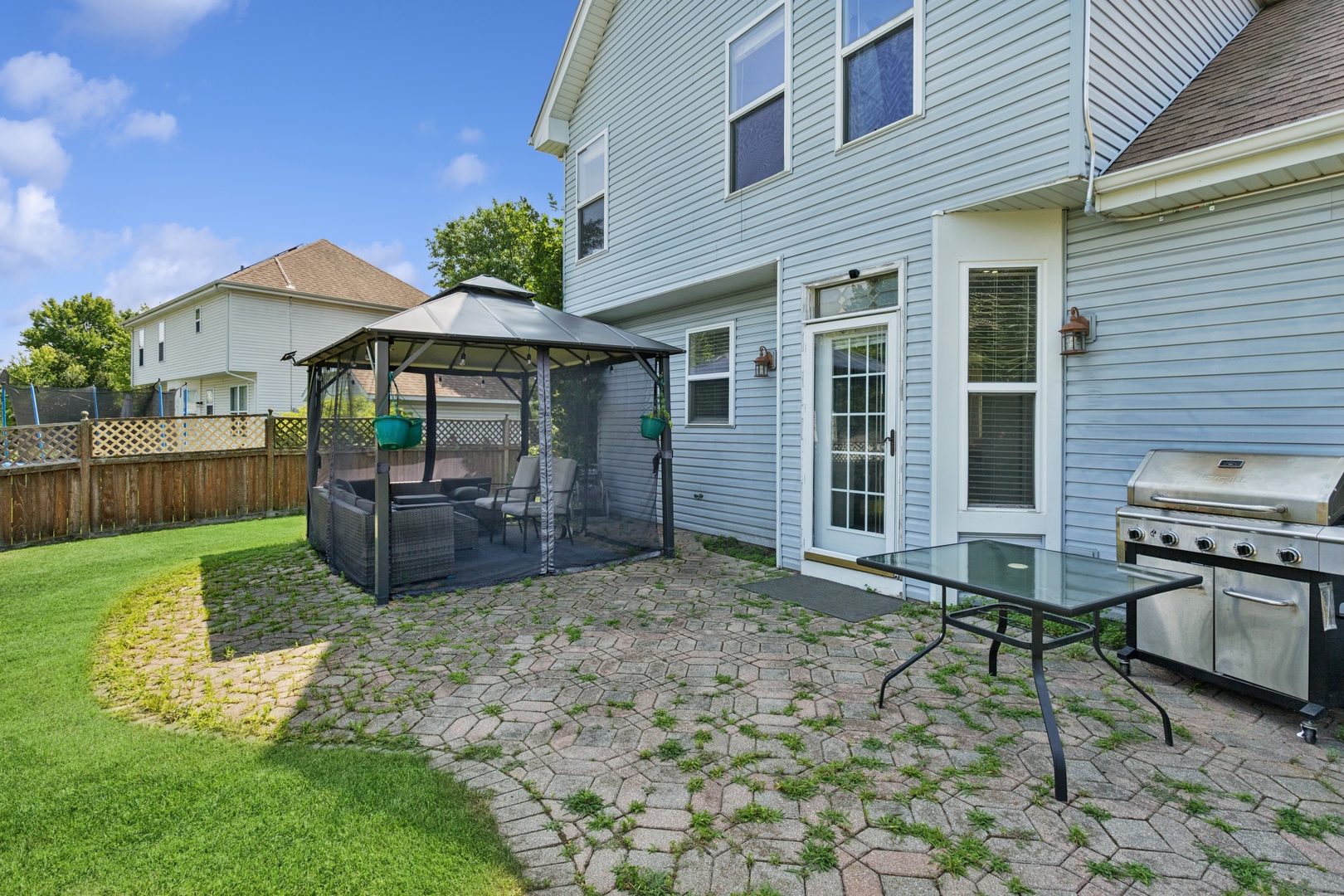 Discover this charming 3-bedroom, 2.1-bath home in Champion Creek. The main floor features stylish hard-surface flooring and a kitchen equipped with abundant cabinet space and a convenient pantry. The family room impresses with a vaulted ceiling and a beautiful view of the backyard. Upstairs, the primary suite also offers a vaulted ceiling and an en-suite bath for added comfort. Step outside to enjoy a fully fenced yard, complete with a paver patio and a handy storage shed-ideal for outdoor living and entertaining. This well-maintained home combines comfort, functionality, and great outdoor space in a desirable neighborhood.