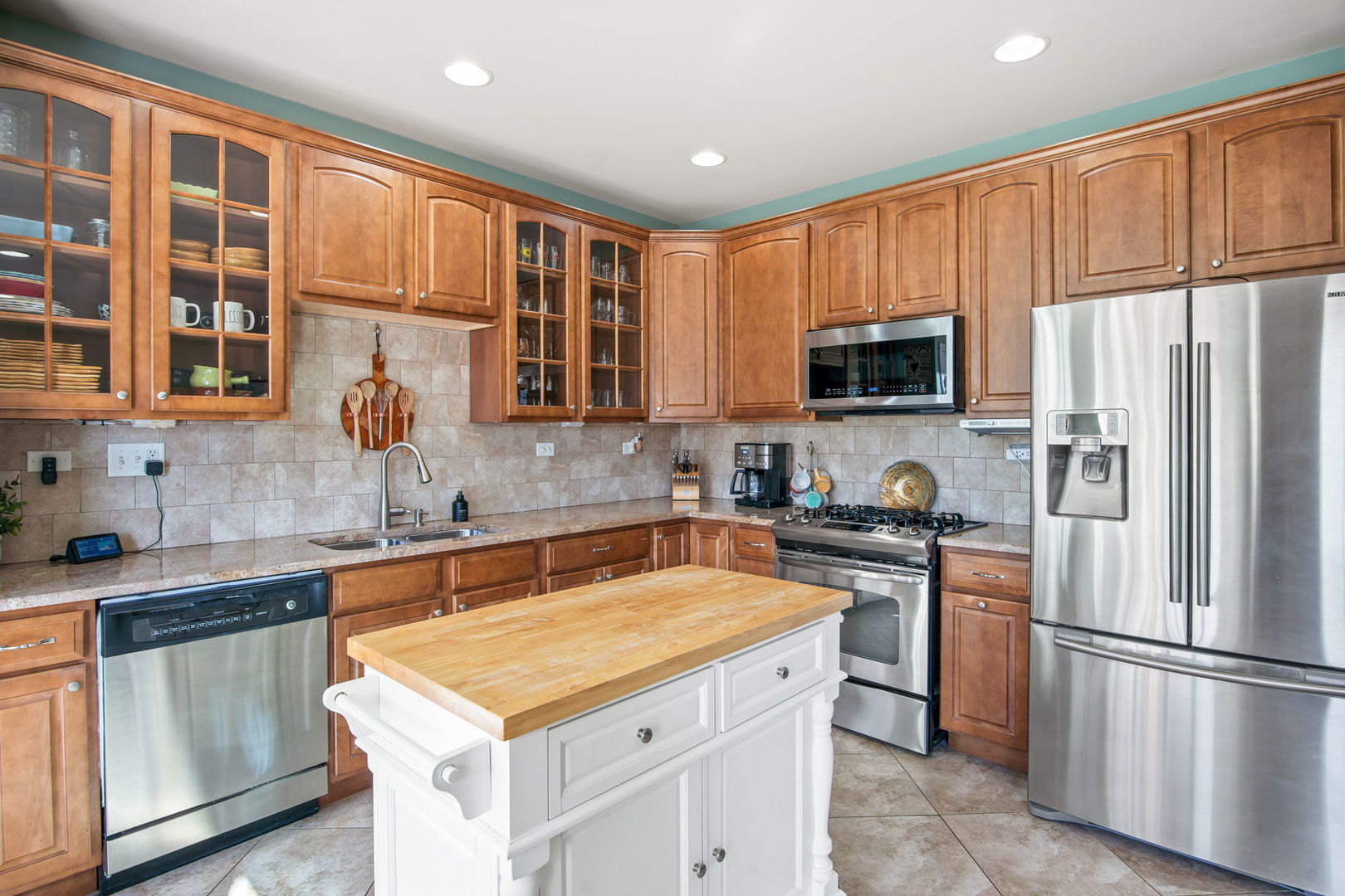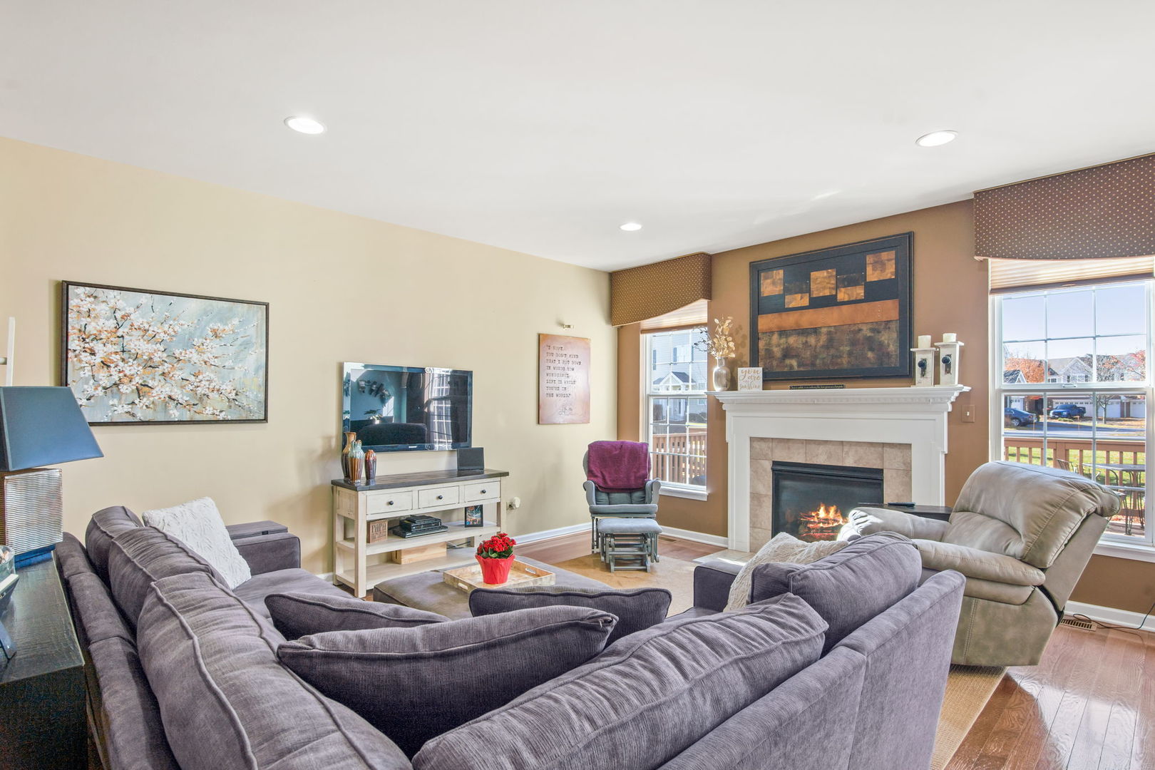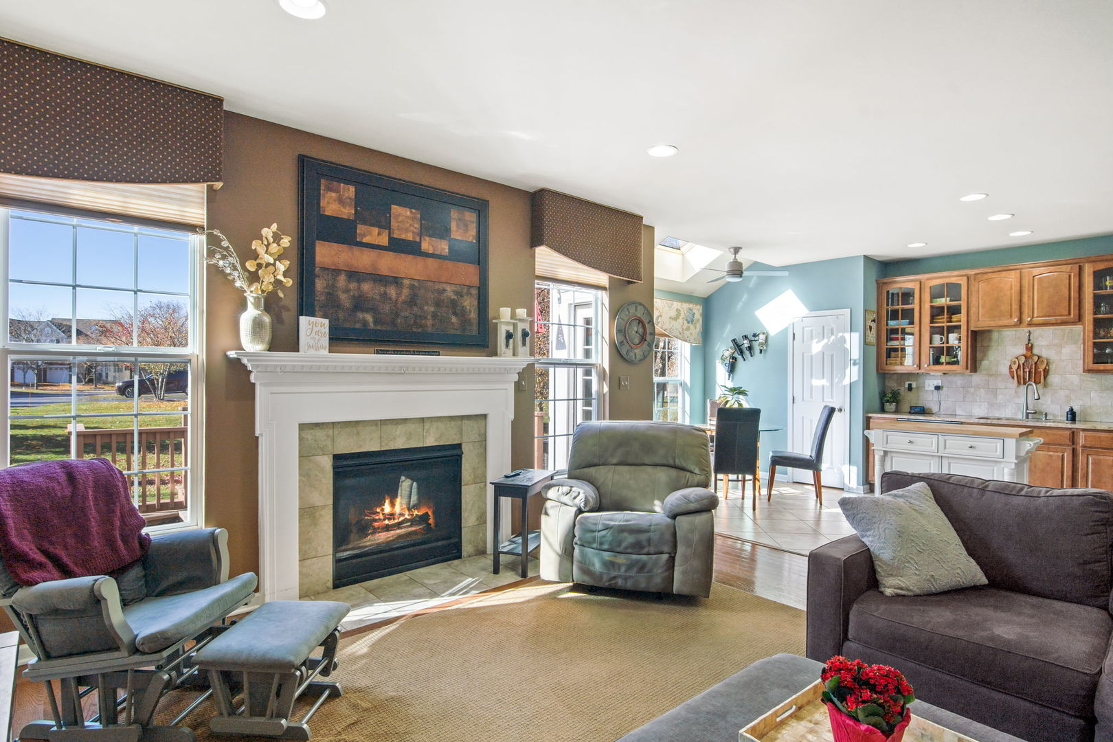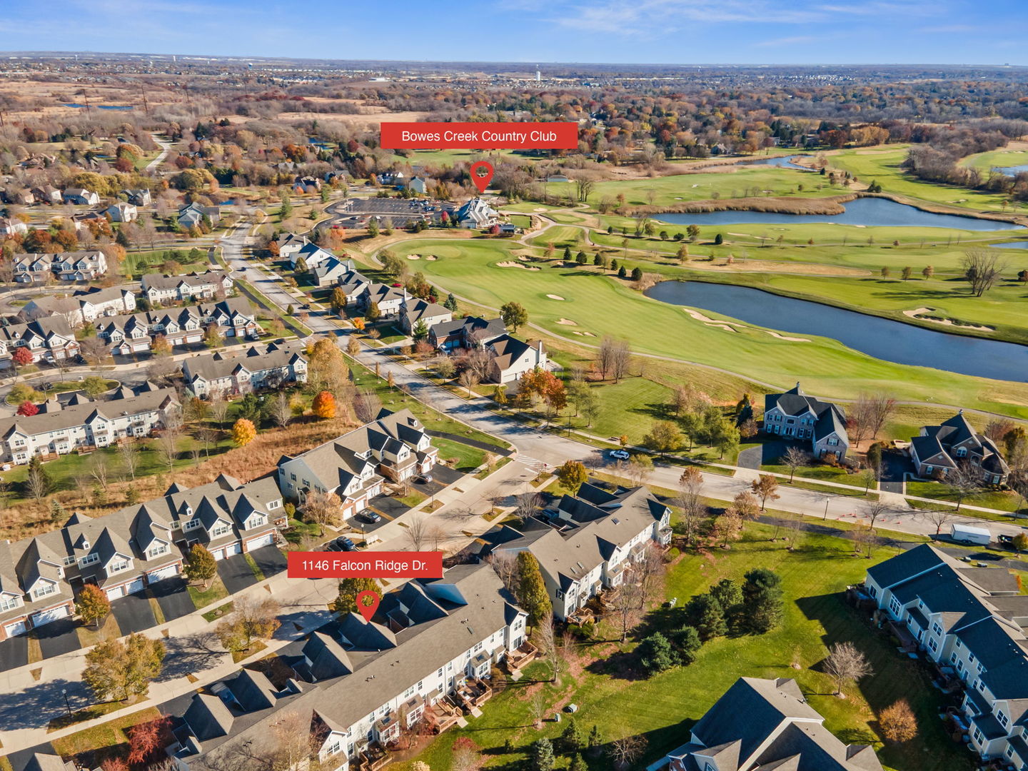 Set in the sought-after Bowes Creek Country Club community, this spacious Pentwater model townhome blends comfort, style and a prime Elgin location with access to the award-winning golf course, clubhouse and restaurant. The landscaped lot is framed by mature trees and features a welcoming front porch, backyard deck and an attached 2-car garage. Inside, the open layout includes a hardwood-floored living room with a gas log fireplace, an eat-in kitchen with stainless steel appliances and tile backsplash, and a vaulted breakfast room brightened by a skylight, along with a first floor home office with hardwood. Upstairs, three bedrooms include a vaulted primary suite with a walk-in closet and a deluxe bath offering a double bowl vanity, oversized whirlpool tub and separate walk-in shower, two bedrooms feature custom closets. The finished basement adds a huge rec room and half bath, and recent updates include custom window treatments, professional painting, custom can lighting, a tankless water heater installed in 2023 and new AC in 2025. Minutes from schools, shopping, dining and entertainment along the Randall Road corridor with easy access to Metra and major highways, this home offers a standout combination of lifestyle, amenities and convenience.