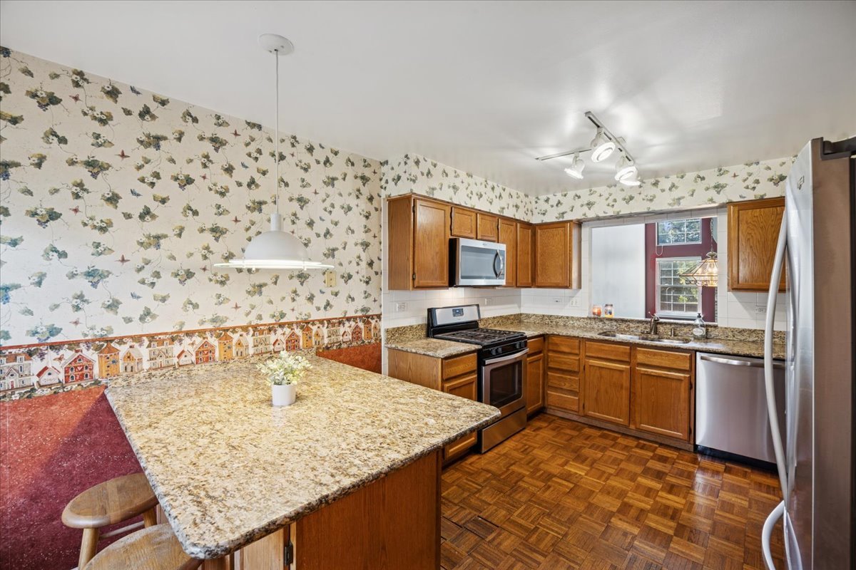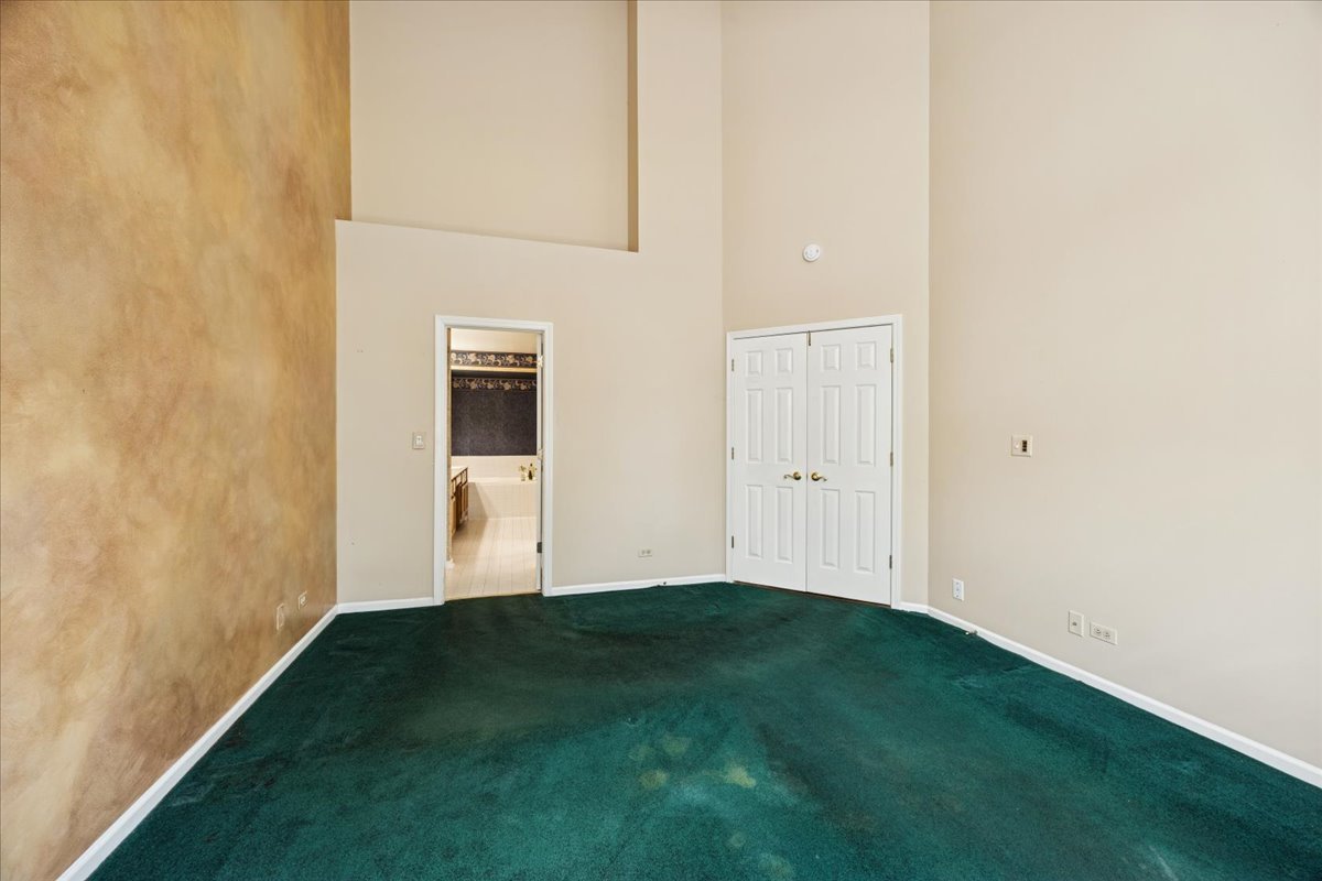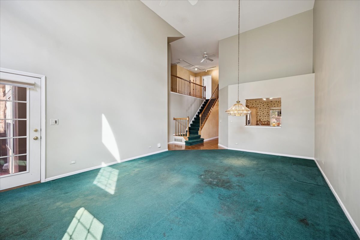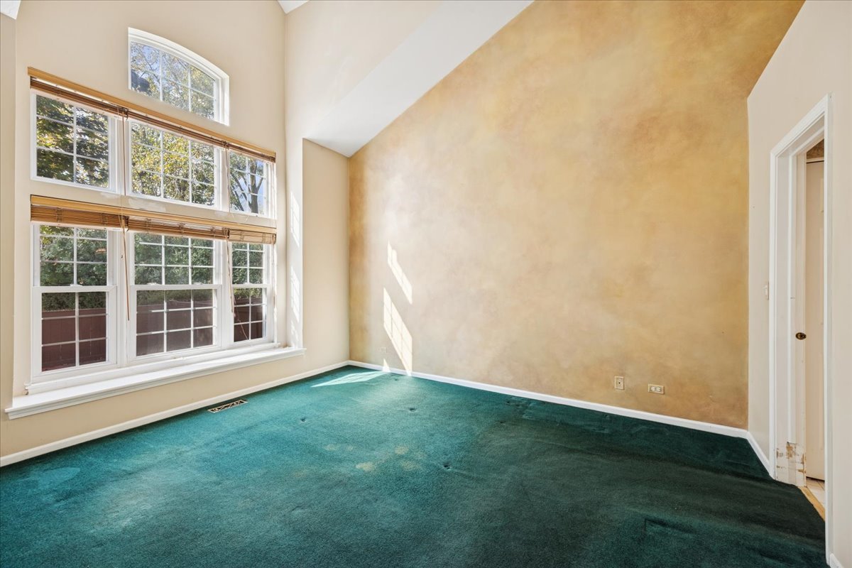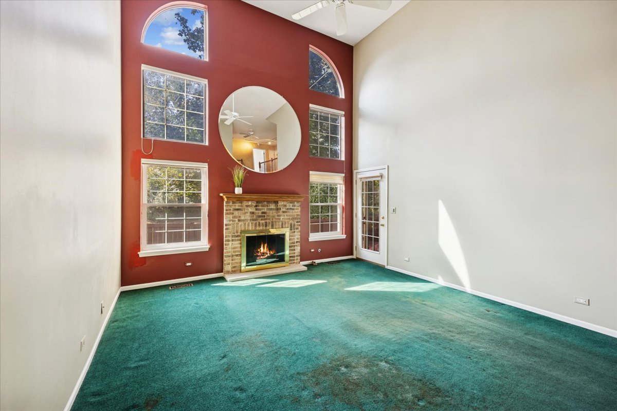 First floor primary bedroom in Prescott Square offers great potential! Original owners have lovingly maintained this brick townhome. The eat-in kitchen offers oak cabinetry including a pantry cabinet, granite countertops, tile backsplash, peninsula for extra seating, stainless steel appliances and opens to the dining room/living room combination. The living room showcases cathedral ceilings, floor to ceiling south-facing windows with great natural light, and a brick gas log fireplace. Enter the primary bedroom through double doors and additional cathedral ceilings. This suite offers a walk-in-closet, linen closet, double sinks, jacuzzi tub, and separate shower. The main level conveniently provides a powder room, mud room, access to the fenced back deck, and attached two car garage. Second floor brings two additional bedrooms, a full bathroom, and loft open to the living room below. Full finished basement expands the living space and offers great additional storage with closets and cabinetry, laundry room (can be moved into mudroom), and utility room. Back deck has great views of open land. Amazing location with easy access to major expressways, commuter trains, and both airports. Blocks away from Prairie and Forest Preserve trails, Mariano’s, golf courses, and more. Come check the opportunity in this Prescott Square townhome!