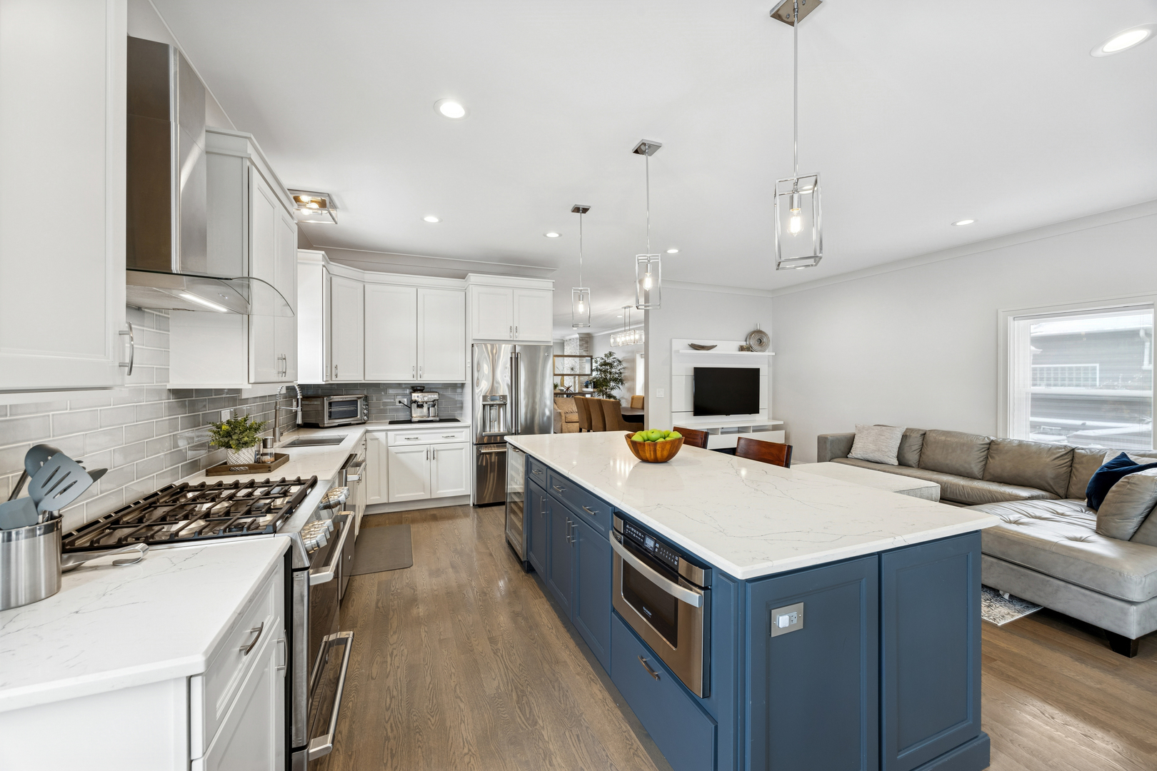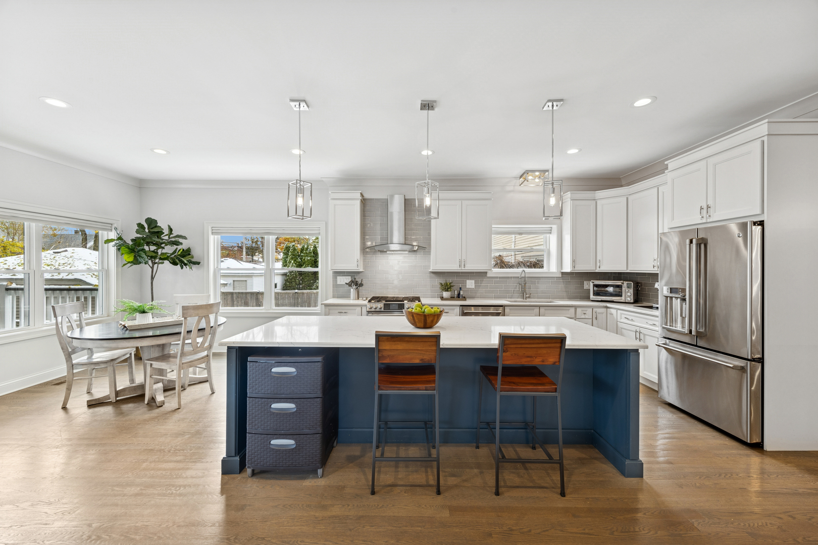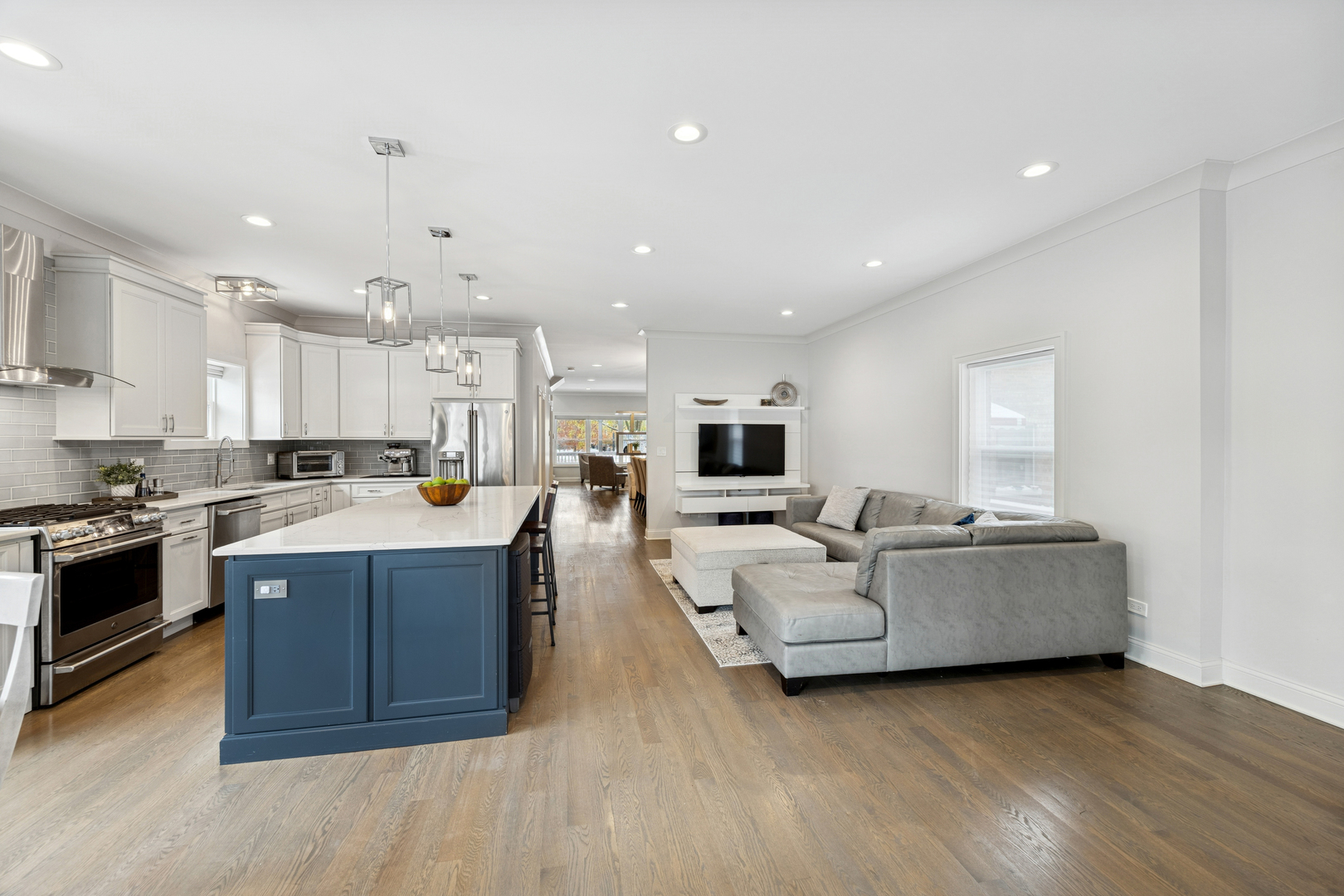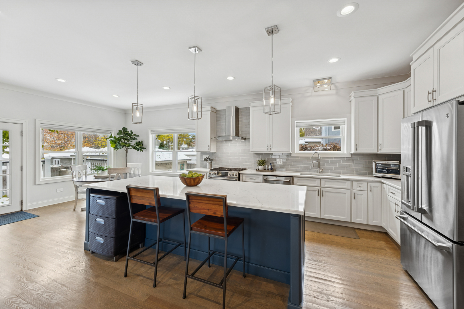 Welcome to 1156 Wesley, a 4,000 sq ft completely renovated showpiece in Oak Park’s historic village that offers effortless modern living across from the beautiful Euclid Square Park, with tennis courts, a baseball diamond, and a playground right outside your door. With every system, fixture and finish fully rebuilt in 2017 and still feeling brand new, this stunning 5-bedroom, 4-bath three-story home features soaring high ceilings, an open concept layout, and gorgeous grey oak hardwood floors throughout. The chef’s kitchen is an entertainer’s dream with a 9-foot island, custom cabinetry, GE Cafe appliances, custom lighting, and a wine/beverage fridge. The main floor offers flexible living with a bedroom or office plus a full bathroom. Upstairs, the luxurious primary suite includes a private balcony for morning coffee, a huge walk-in closet, and a spa-like bathroom with both a soaking tub and walk-in shower. Second-floor laundry includes a sink and extra storage. The finished basement elevates entertainment with a wet bar featuring its own beverage fridge, a great theater area, an additional bedroom, full bathroom, home gym and large storage area. Modern amenities include zoned heating and cooling with Amazon Alexa Ecobee thermostats, all-updated electrical and plumbing, French doors, solid-core interior doors, and a gas fireplace. With large, plentiful closets, a two-car garage, a fenced yard, and an unbeatable location where you can walk to restaurants, shops, and transit or drive to the city in minutes, 1156 Wesley truly offers the perfect blend of luxury, convenience, and community-just unpack and relax!