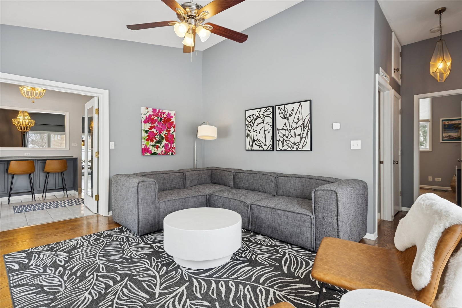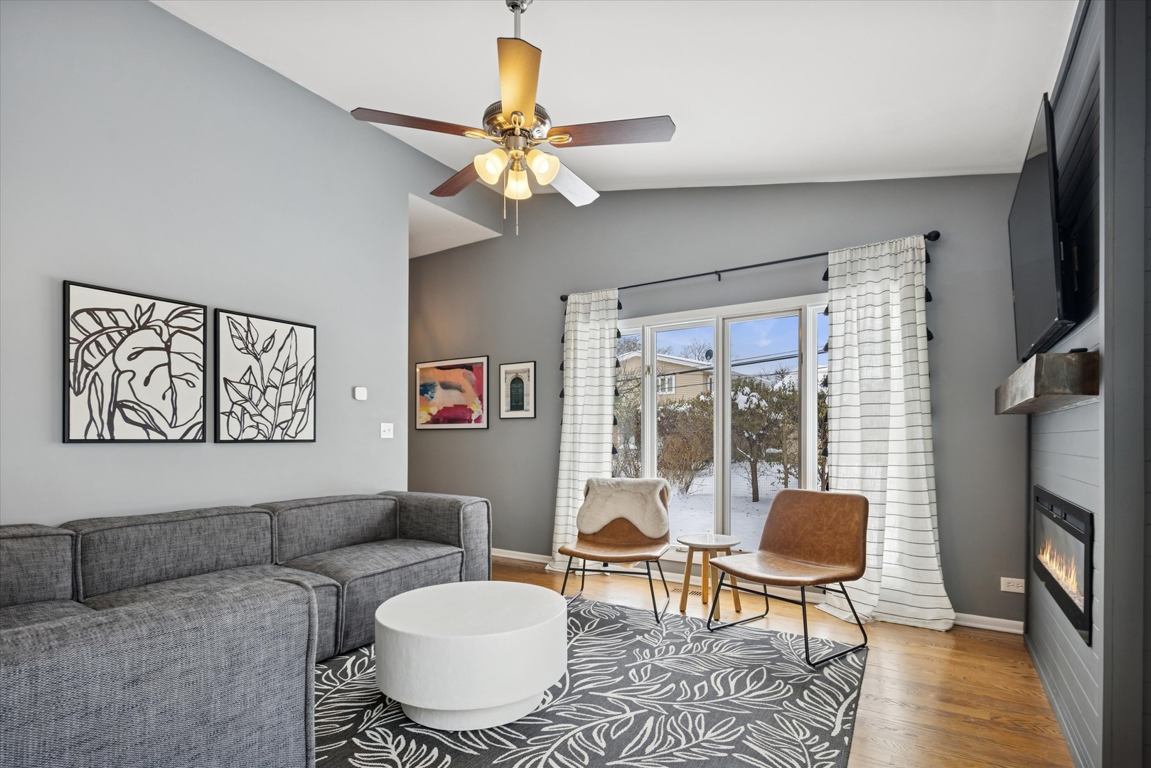Welcome to 120 S. Fairlane – an inviting haven on a quiet, tree-lined street, just steps from Edison & Sandburg schools, town, train, shopping, and expressways. This charming, meticulously maintained home offers thoughtful updates, a unique modern floor plan and outstanding natural light throughout. You’re welcomed into a bright living room featuring a vaulted ceiling, new custom staircase, new front window, and an open flow into the oversized dining room. Gorgeous hardwood floors. The entryway mudroom area has been opened to include a bench, hooks, and added storage-plus this model offers the convenience of direct access from the attached garage into the home. The updated kitchen has been opened to the dining and living rooms and features a new breakfast bar (with hidden storage beneath), decorative wall molding, a wine rack, yard-facing bay window, freshly painted cabinets, new stainless steel appliances, Corian countertops, and a stylish tile backsplash. A rare feature for this Brynhaven model: an added family room off the kitchen with a vaulted ceiling, lots of window light, new fireplace, and new sliders leading out to the patio. This level also includes the home’s 4th bedroom and a full bath with new flooring and vanity-an ideal space for a first-floor primary suite, office, in-law arrangement, playroom, or teen retreat. The 3 bedrooms have ceiling fans, hardwood floors, good closet space, a linen closet, updated full bath with skylight & one bedroom with newly added wall moulding for a refined touch. The lower level offers a spacious rec room with newer carpet and full-size windows, providing room for large furniture and multiple uses. The lower-level full bath is completely new and includes a walk-in shower. There is also a laundry/storage room and a concrete-floored crawl space for excellent additional storage. Many new light fixtures & all new window treatments. To top off this perfect home is a new roof & siding (’23), furnace (’20), central air (’25) & hot water heater (’23). All gutter/downspouts are directed underground. There is an attached garage with a door to the house and yard & a concrete driveway that fits 2 cars side by side. Outside, enjoy summers on the large concrete patio overlooking the expansive, yard with plenty of green space for recreation and relaxation. This move-in-ready home combines comfort, convenience, and exceptional style-truly ready for you to move in and enjoy!