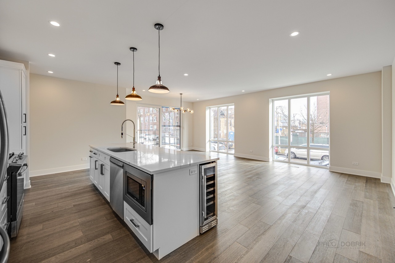 Experience modern Chicago living in this stunning, sun-drenched duplex-down condo just steps from iconic Humboldt Park. This spacious 4 bedroom, 3 full bath home offers the perfect blend of style, comfort, and convenience with high-end finishes throughout. The main level features an open-concept living space with floor-to-ceiling natural light, sleek quartz countertops, stainless steel appliances, a wine fridge, and elegant designer details. The generous primary suite includes a beautifully appointed en-suite bathroom for true retreat-style living. Head downstairs to a fully finished lower level offering a large family room, additional bedroom, and a full bathroom-ideal for guests, an office, or extended family living. Enjoy morning coffee or summer evenings on your private outdoor deck, plus abundant storage space within the building. Additional perks include: Garage parking In-unit washer & dryer All appliances included (including wine fridge) Extra storage room Located on a quiet tree-lined street, yet walking distance to Humboldt Park, local cafes, restaurants, and public transit, this home brings you the best of city living.