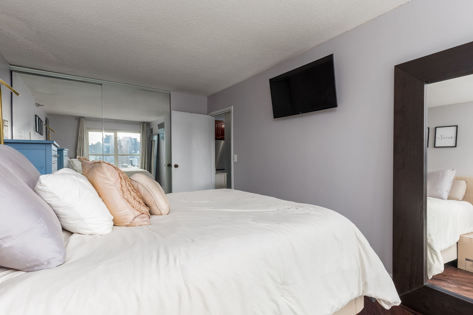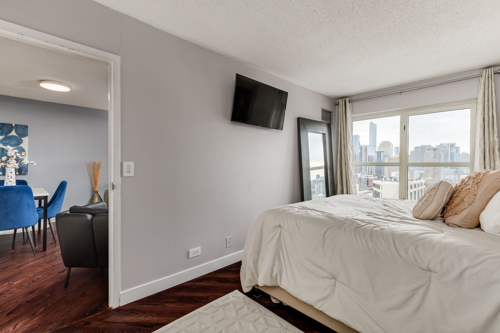 Soak in incredible skyline views from this bright 1 bed, 1 bath condo, complete with a private balcony. The southern exposure floods the living room and bedroom with natural light throughout the day. The kitchen pops with granite counters, updated stainless steel appliances, and cherry wood cabinets. The living room features new cherrywood floors, and hardwood flows throughout the rest of the unit, while the newly updated bathroom adds a touch of luxury. Building perks include a 24-hour doorman, gym, and onsite dry cleaning. Heat, AC, internet and cable are all included. Walk to the Red Line or enjoy the shops and restaurants of Gold Coast and Old Town.