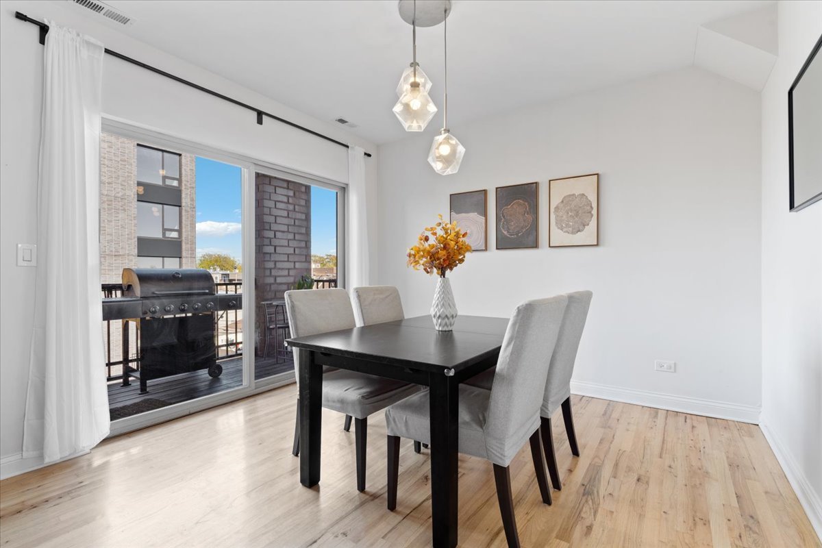 Boutique elevator building two bedroom, two bathroom penthouse home with city views! Unit owner has roof rights! Recently updated and move in ready, this home is flooded with natural light. This home is ideal for entertaining! Boasting lighter stained hardwood flooring, open concept living + dining area plus a separate dining area or nook. The kitchen boasts an oversized island, stainless steel appliances, and white shaker style cabinetry with larger on trend pulls. Your large living room area can fit a huge comfy couch, perfect to gather around cozy around the fireplace. Step outside on to your balcony to take in the tree lined streets with a cup of coffee or glass of wine. As you enter in to the primary suite you can take a deep breath and take in the city views, gorgeous en-suite bathroom featuring steam shower and dual vanity. Really good sized second bedroom with great closet space. Newer side by side laundry. Price includes two prime attached garage parking spots in a heated, attached garage. Nearby vibrant Division Street, Humboldt Park, the New Humboldt Wellness Center, the 606, great restaurants & night life. Easy access to blue line and highways. Unit does not face California Ave.