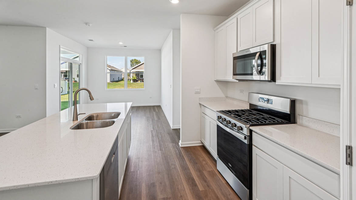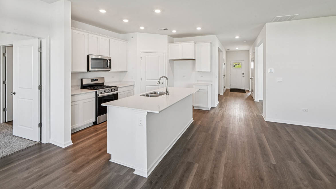 Envision yourself at 1228 Wild Tulip Circle in Bartlett, Illinois, a beautiful new home in The Grasslands community. This ranch home is move-in ready NOW! Scenic homesite includes a fully sodded yard and covered back patio. The Bristol floor plan offers 1,744 square feet of living space with a flex room,2 bedrooms, 2 baths, and 9-foot ceilings. When you first enter the home, there is a secondary bedroom, full bath, and flex room. Down the hall, you will walk into the open concept great room and kitchen. The kitchen layout includes a large island with an overhand for stool, 42-inch designer cabinetry with crown molding and soft close drawers. Additionally, the kitchen features a walk-in-pantry, modern stainless-steel appliances, quartz countertops, and easy-to-maintain luxury vinyl plank flooring. Enjoy your private get away with you spacious primary bedroom and en suite bathroom with a raised height dual sink, quartz top vanity, and walk in shower with clear glass shower doors. Future amenities include walking paths and bike paths. The Grasslands is centrally located between Interstates I-90 and I-88, just a short, 5-minute drive to the Metra, making commuting easy. This charming, historic town evokes a family atmosphere with countless options for shopping, dining and entertainment. All Chicago homes include our America’s Smart Home Technology, featuring a smart video doorbell, smart Honeywell thermostat, smart door lock, Deako smart light switches and more. Exterior photo of actual home. Photos are of similar home and model home. Actual home built may vary.