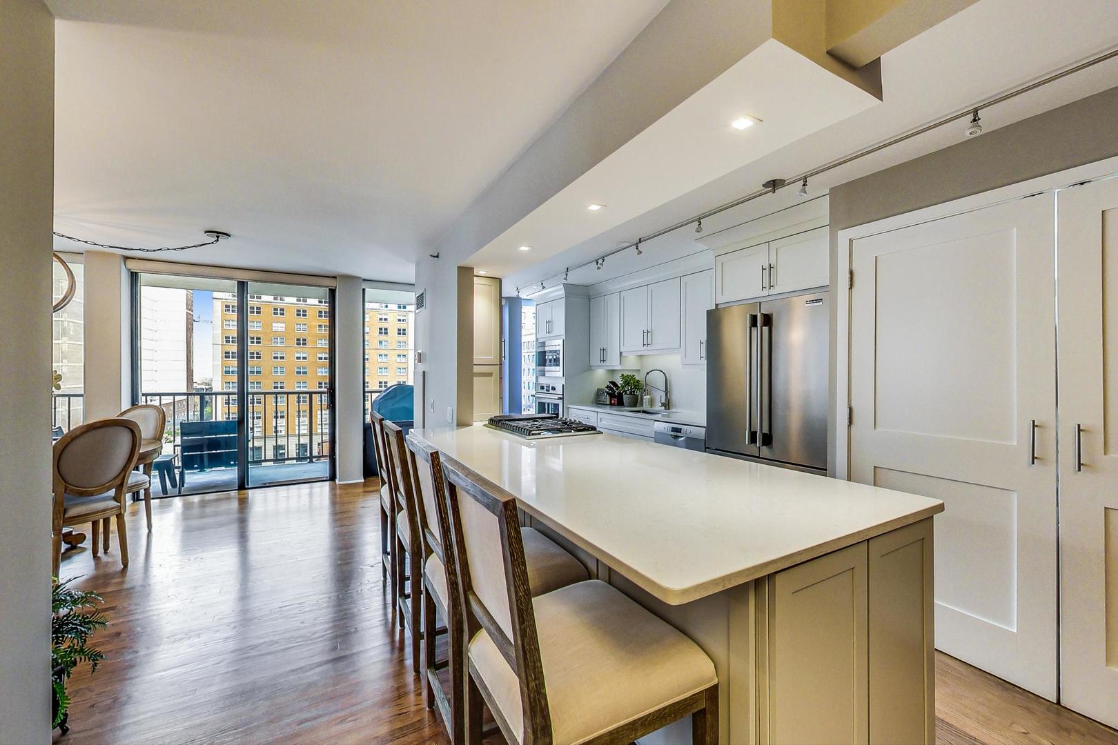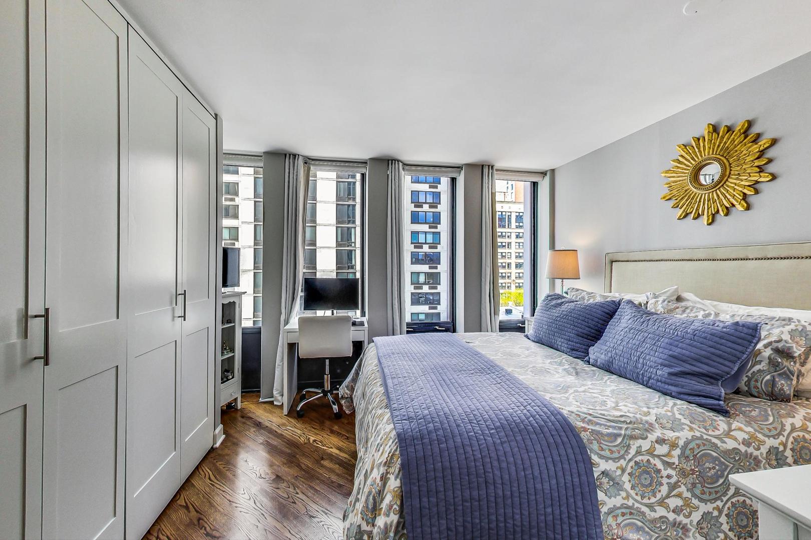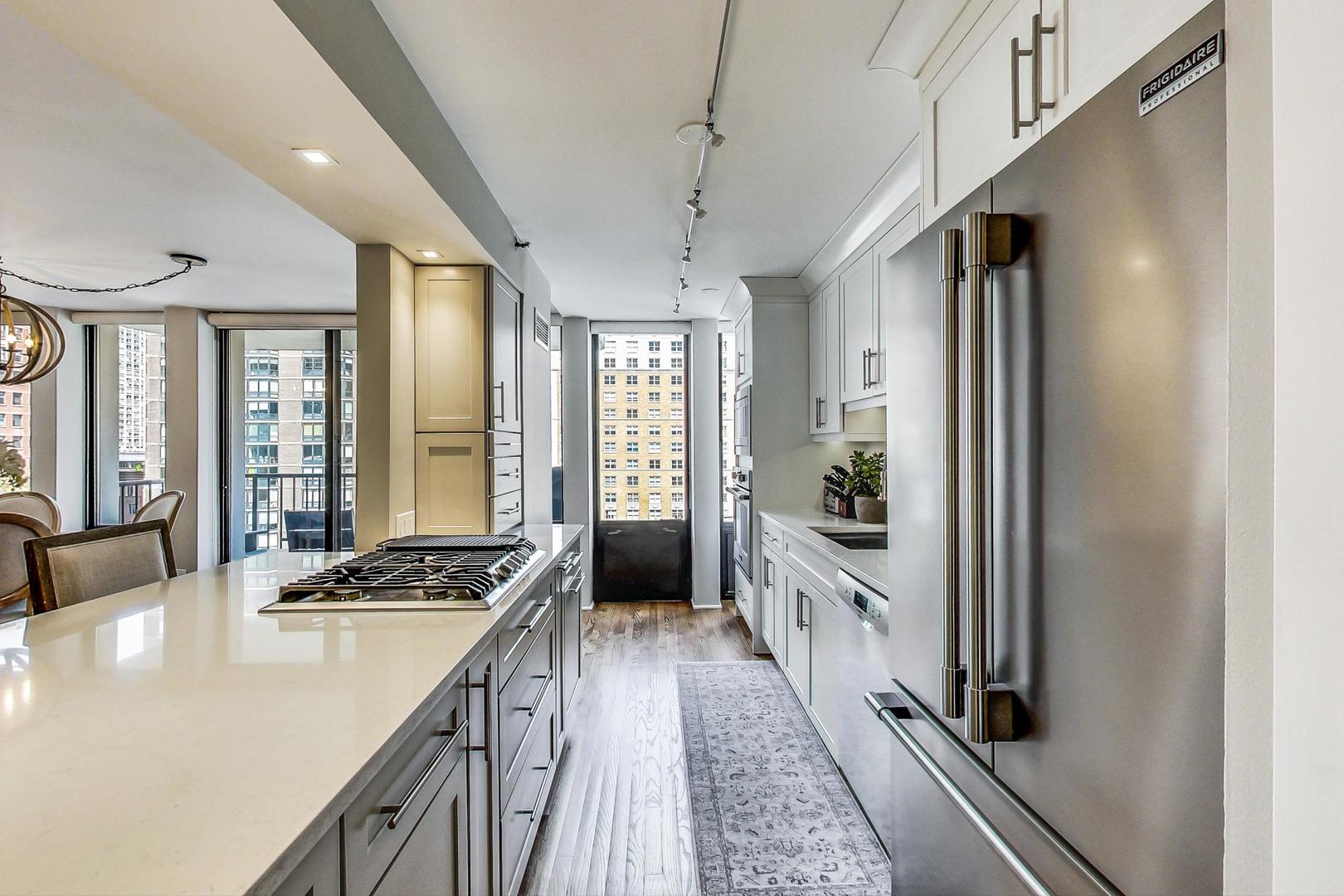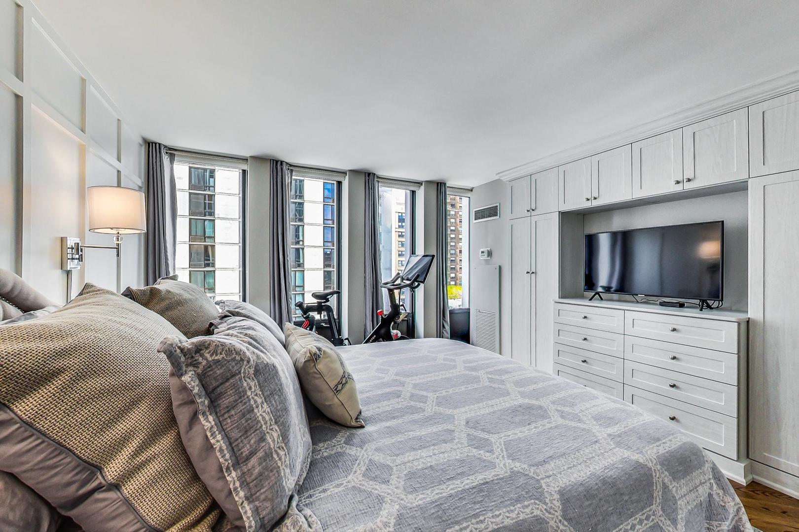 Completely redone with bespoke finishes, this oversized corner 2 bed, 2 bath is perfection. Located in the heart of the Gold Coast, this corner unit has the coveted open floor plan & is flooded with light from floor-to-ceiling windows offering idyllic views. Enjoy cooking & entertaining from the large custom kitchen w/oversized breakfast bar, stone countertops & backsplash, stainless steel appliances, shaker cabinets, & storage galore. The generous floor plan allows for a real dining table & plenty of living space plus a wonderful balcony – perfect for grilling or just relaxing. In the living room, the custom built-in offers more storage plus a hidden desk. Before heading to the bedrooms, don’t miss the dry bar w/drink fridge & marble backsplash! The primary suite is a private oasis w/a gorgeous marble & porcelain bath with dual sinks, walk in shower, organized closet, decorative millwork & a fabulous built-in that more than doubles the closet space. The second bedroom also has generous organized closets. The hall bath is also perfectly redone with marble & porcelain. Throughout the condo, you will find hardwood floors, custom window treatments & shades, brand new doors, organized closets & new lights w/dimmers. No detail was overlooked during this gut rehab. Large private storage room on 8th floor – easy access! Building features include: 24 hour door staff, onsite gym, party room and incredible rooftop deck. A+ location being just steps to fantastic shopping and restaurants, public transportation and Lake Michigan. One deeded parking spot on the 2nd floor available for 50K.