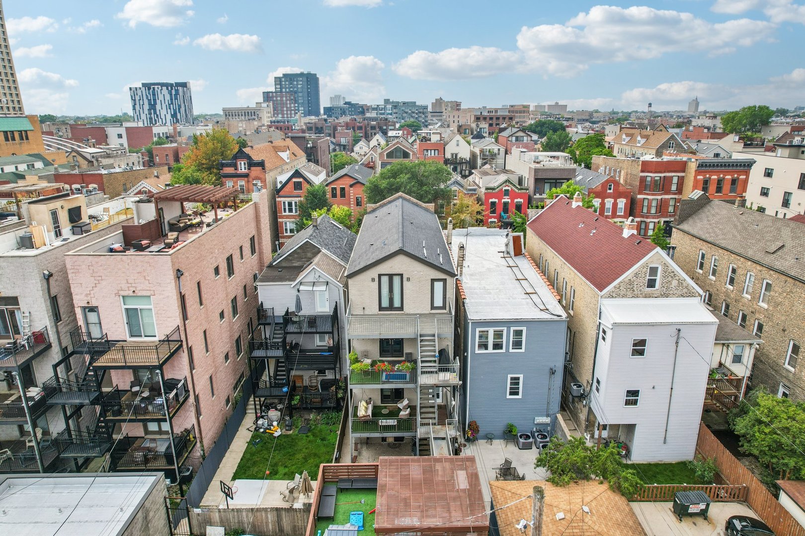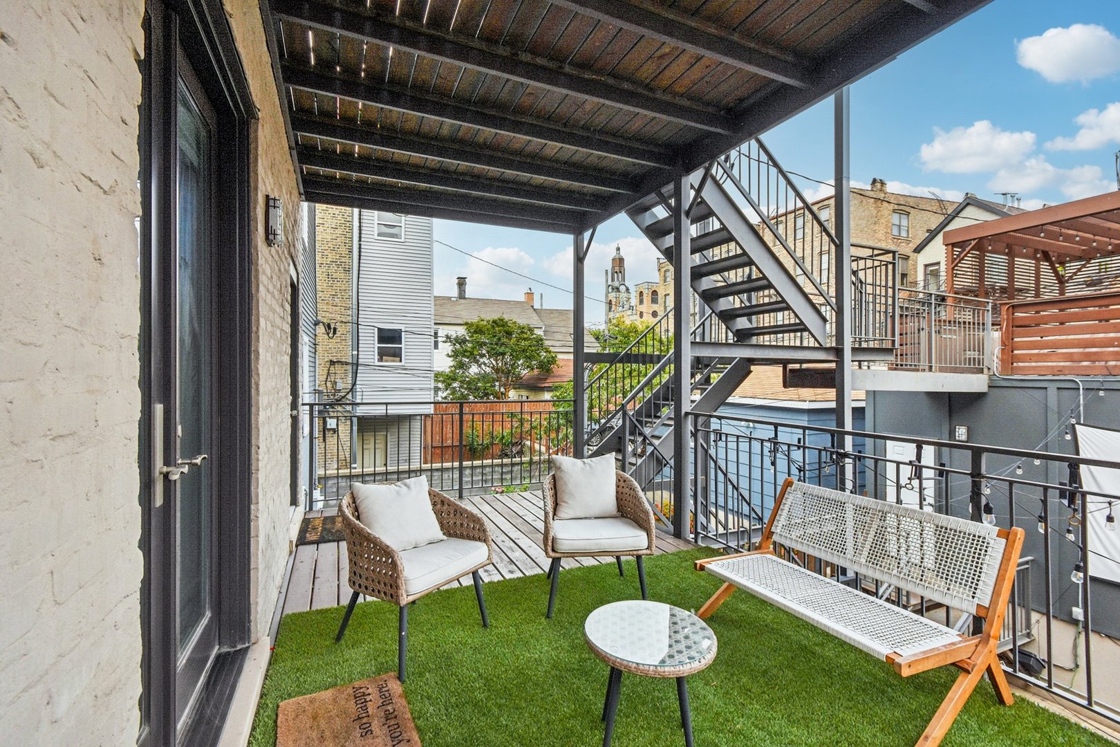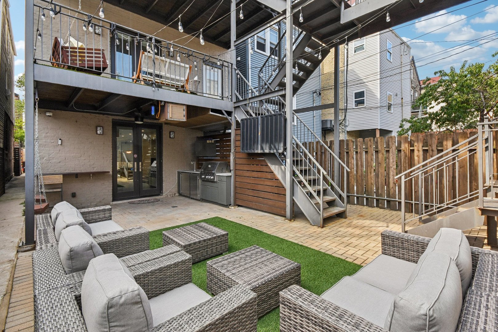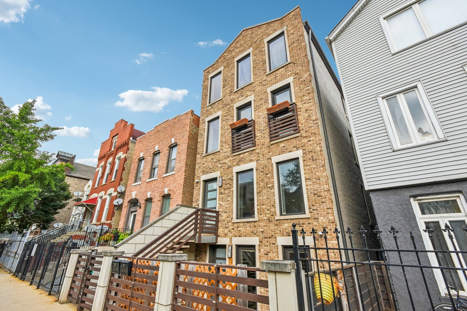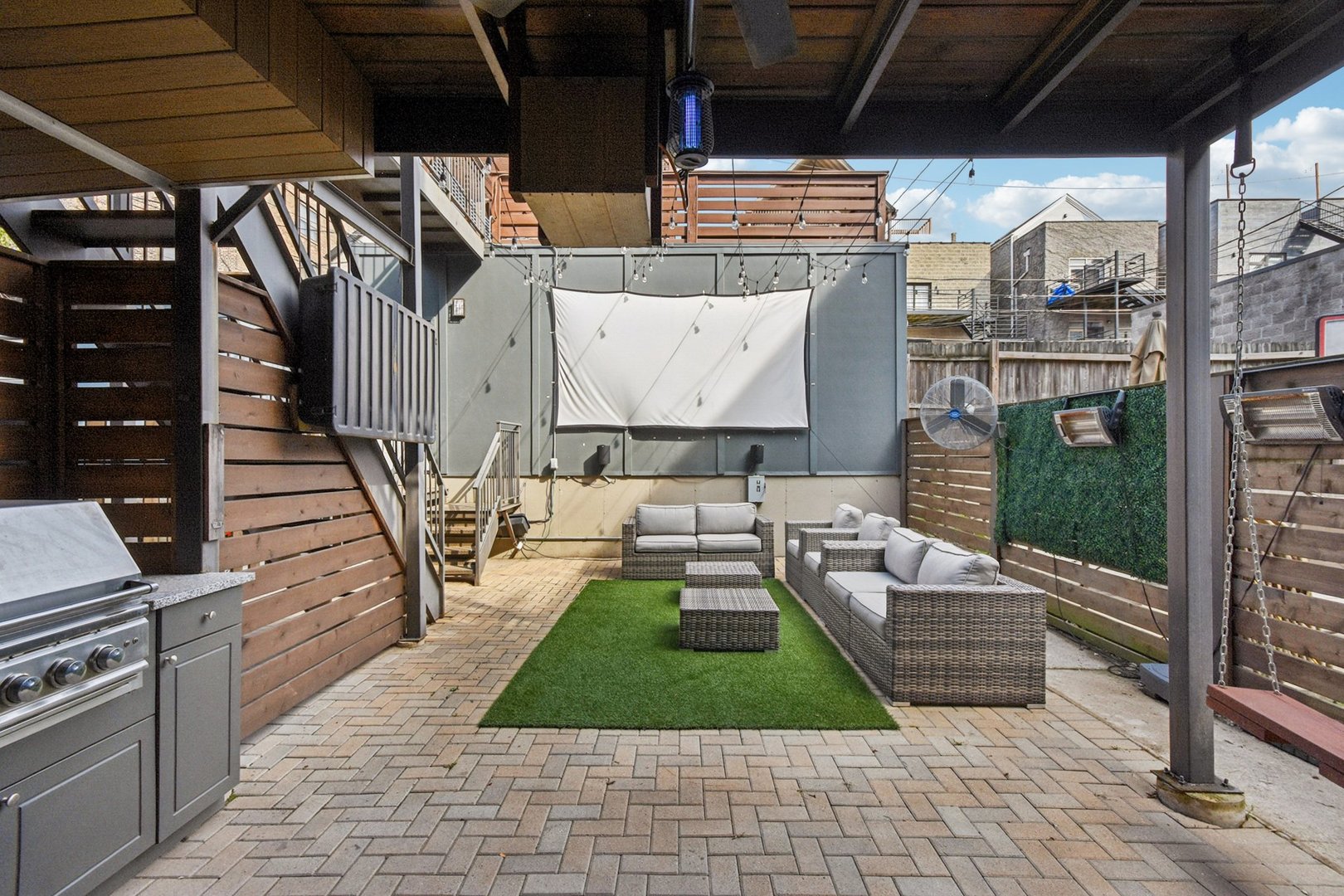 Rare 3BR/2.5BA duplex-up with an open office, 3 private outdoor spaces, including a backyard built for entertaining-full kitchen, gas grill, kegerator, beer cooler, projector/screen, outdoor speakers, heaters, and fans. Second-level patio with swing + backyard swings and children’s rock climbing unit in front yard. Unique layout with all bedrooms upstairs, sunlit primary suite + office area. Open main level with living, dining, and kitchen. Built-out closets, heated floors & steam shower in primary bath. Two garage spaces + outdoor utility room. Prime location near Blue Line, Division St & Milwaukee Ave.