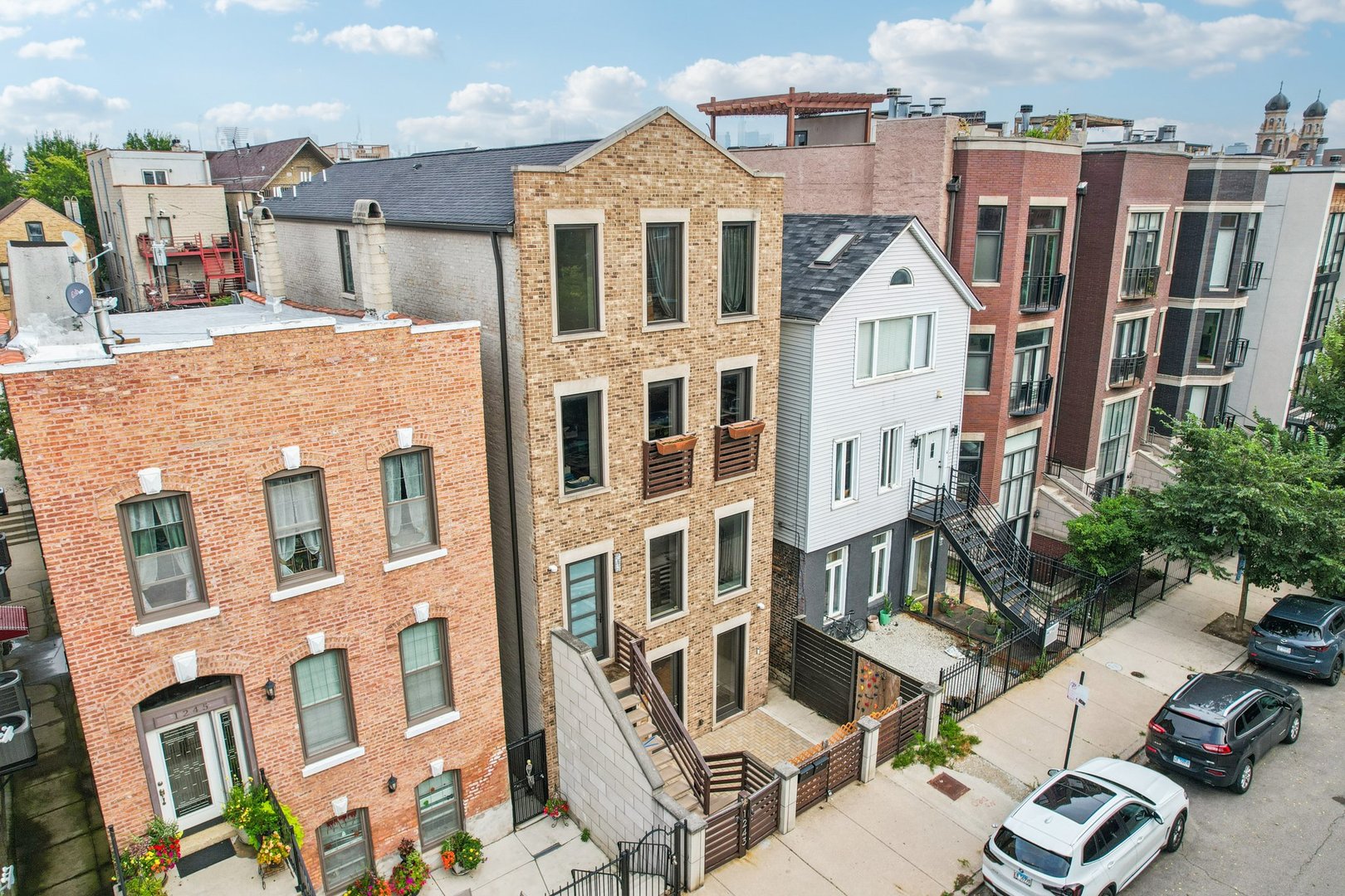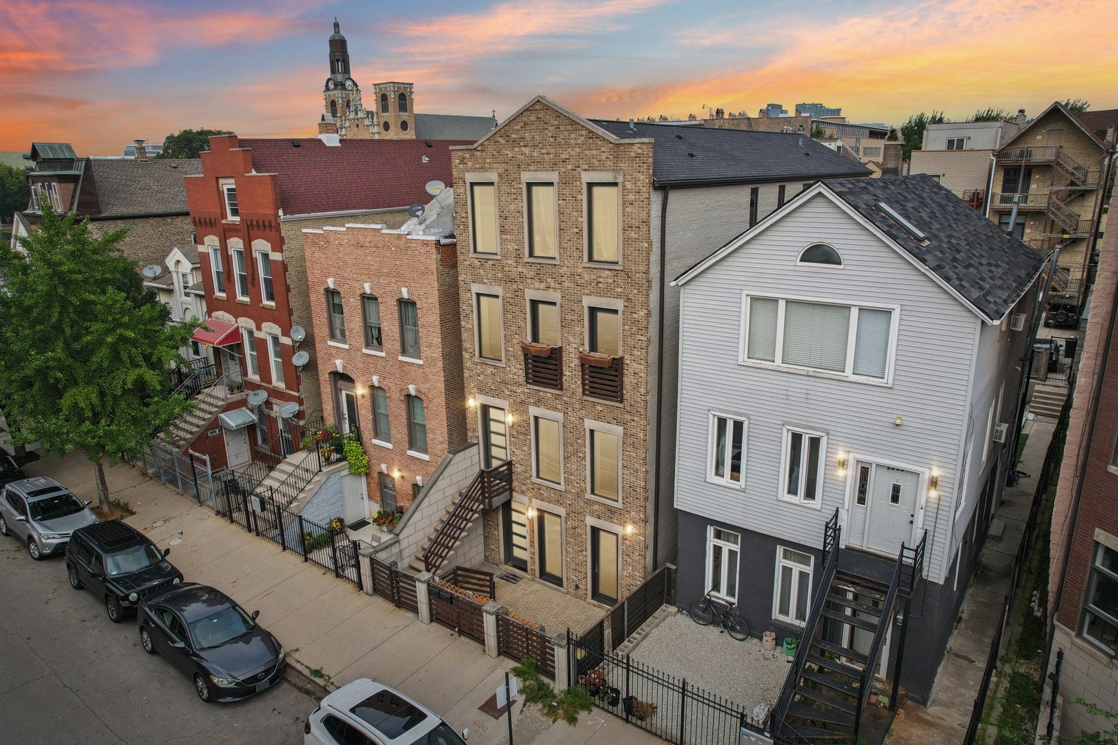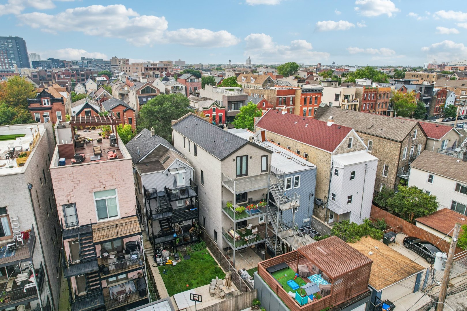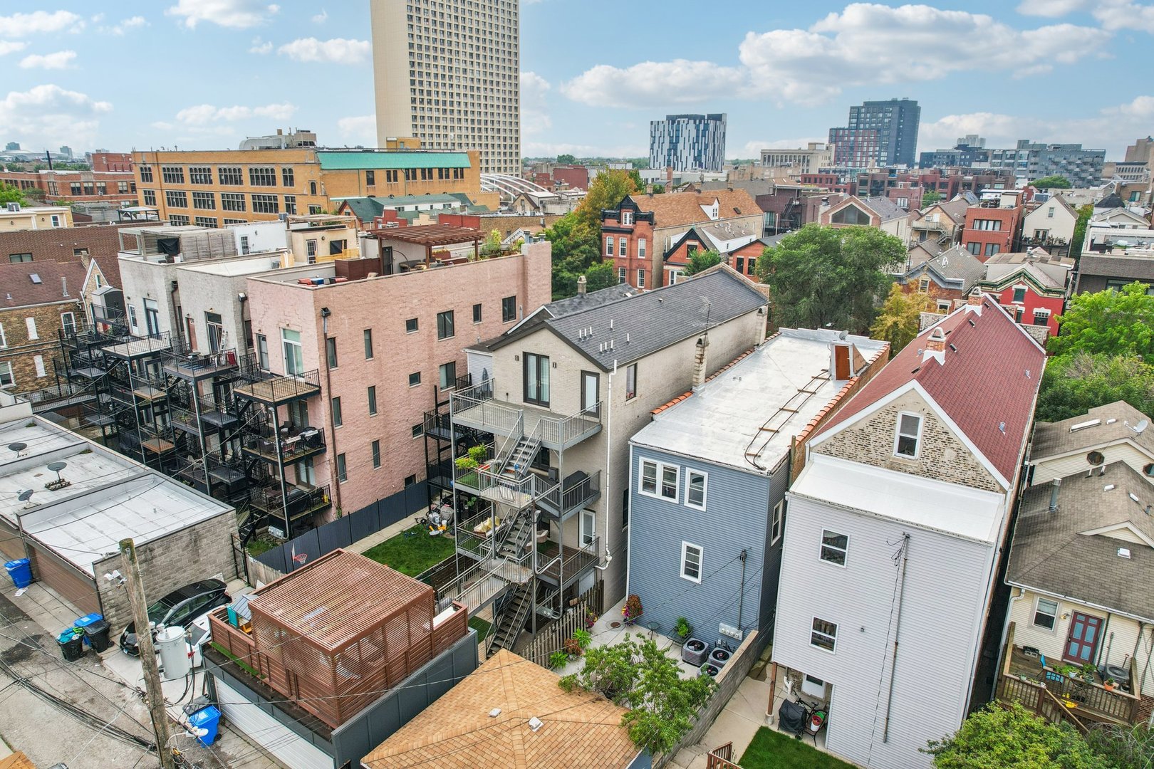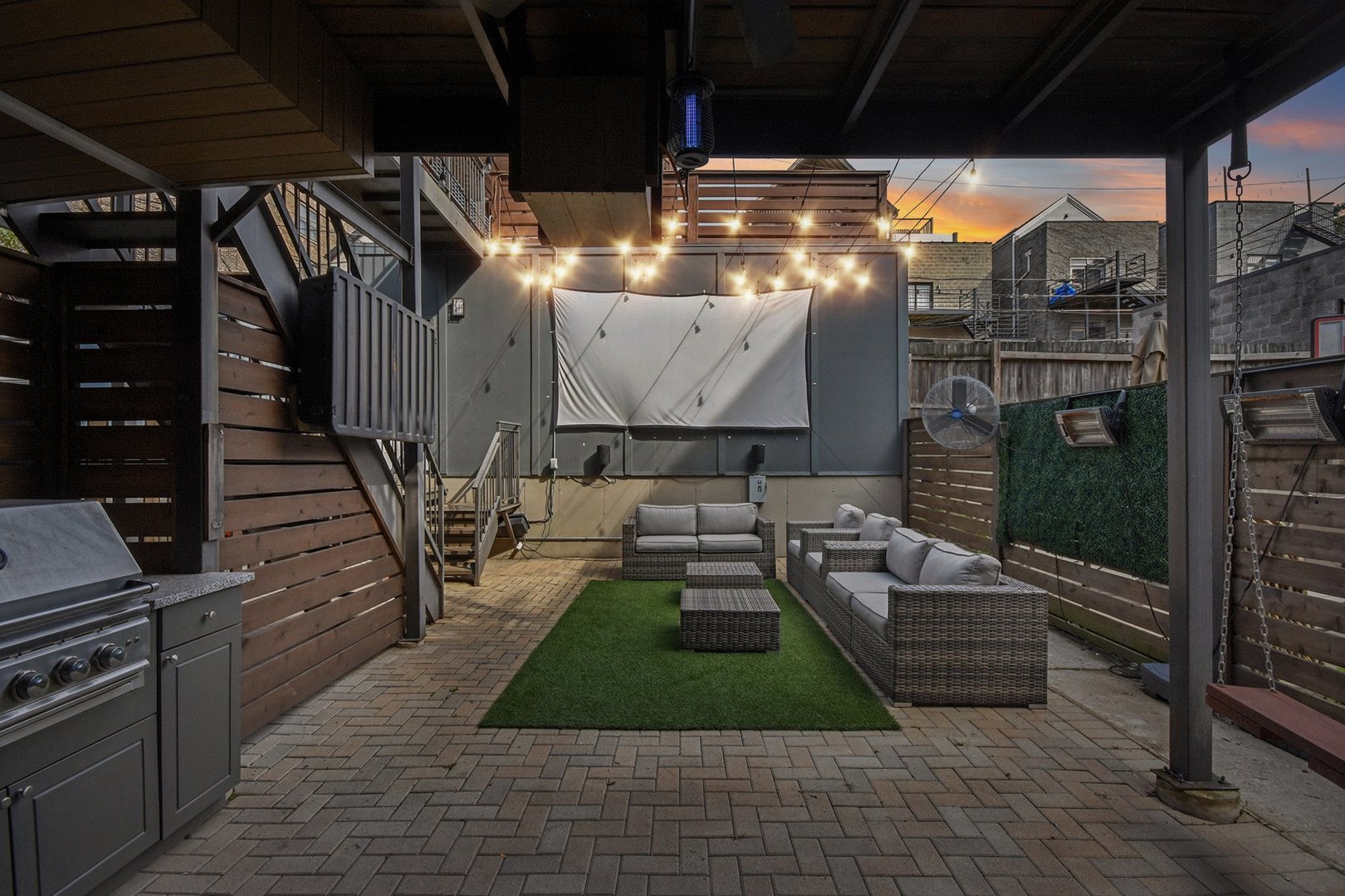 Rare 3BR/2.5BA duplex-up with an open office, 3 private outdoor spaces, including a backyard built for entertaining-full kitchen, gas grill, kegerator, beer cooler, projector/screen, outdoor speakers, heaters, and fans. Second-level patio with swing + backyard swings and children’s rock climbing unit in front yard. Unique layout with all bedrooms upstairs, sunlit primary suite + office area. Open main level with living, dining, and kitchen. Built-out closets, heated floors & steam shower in primary bath. Two garage spaces + outdoor utility room. Prime location near Blue Line, Division St & Milwaukee Ave.
