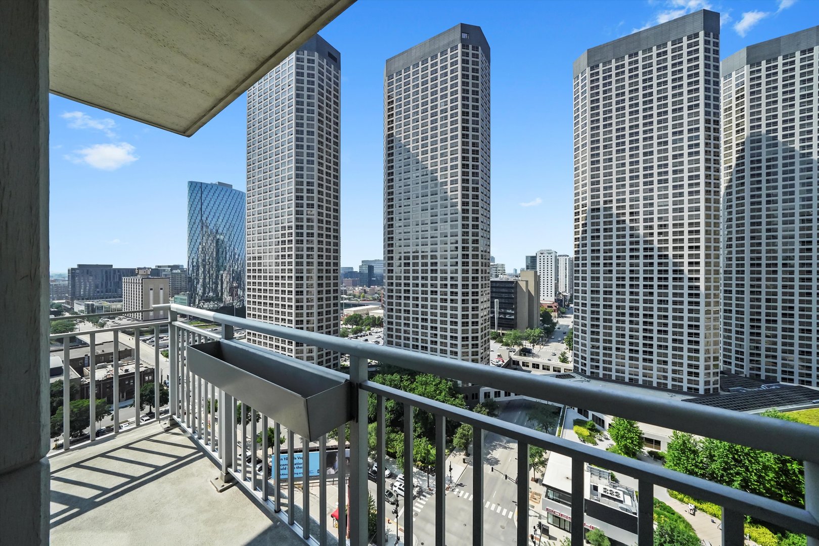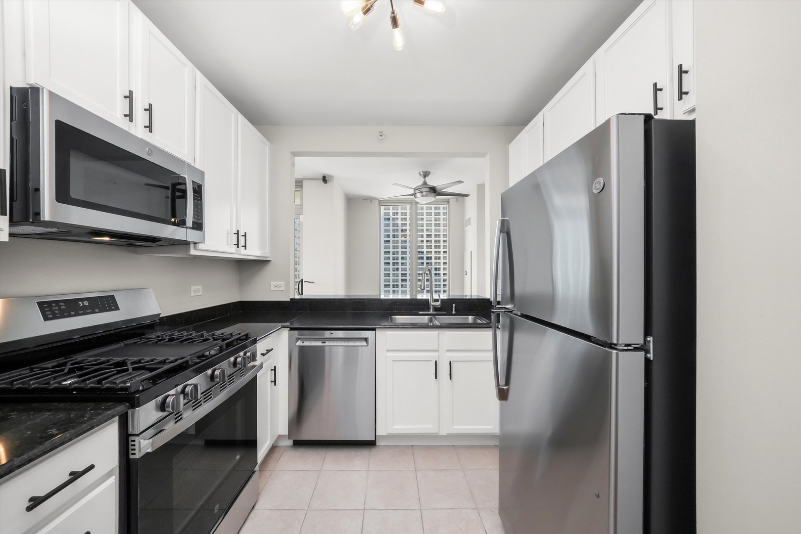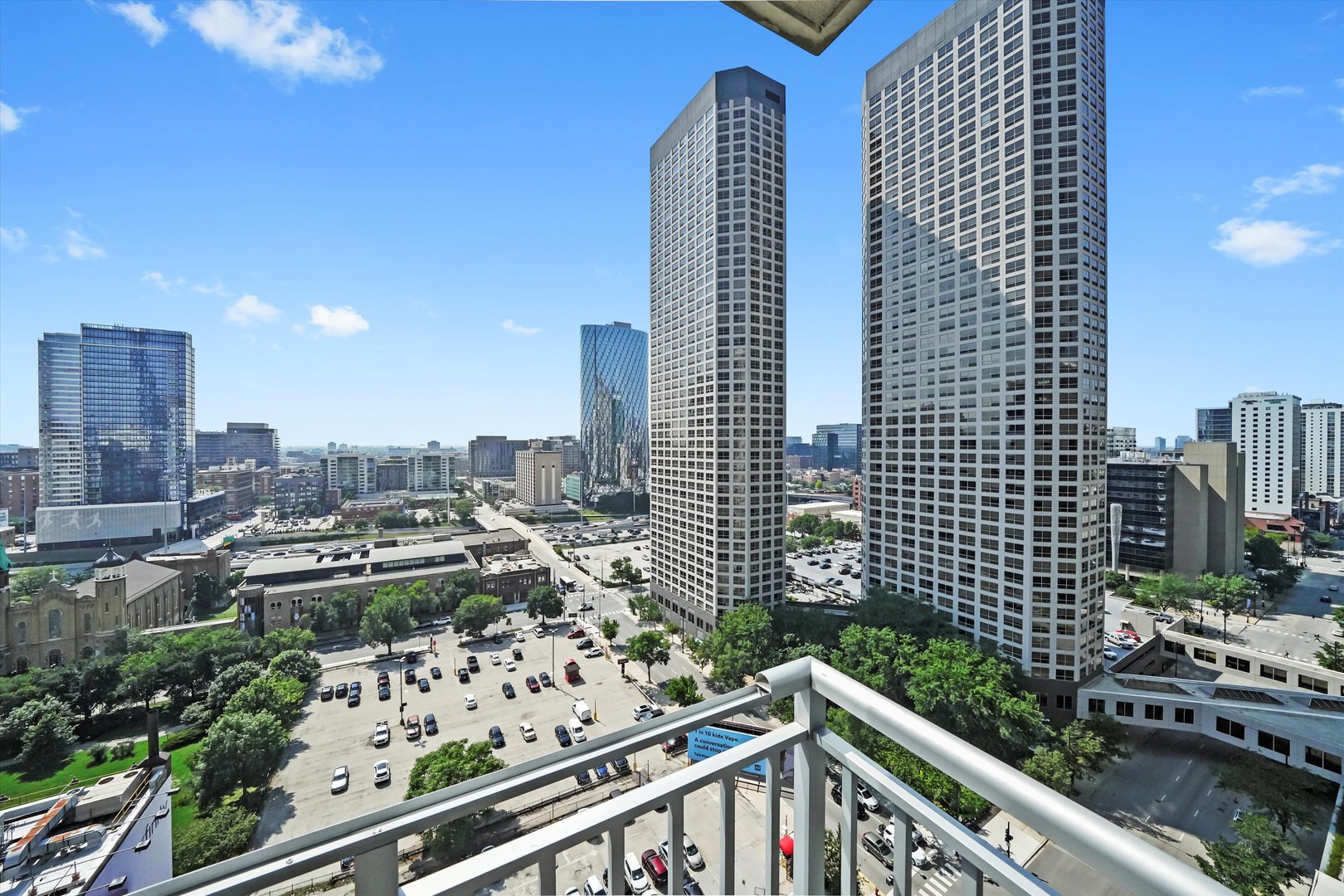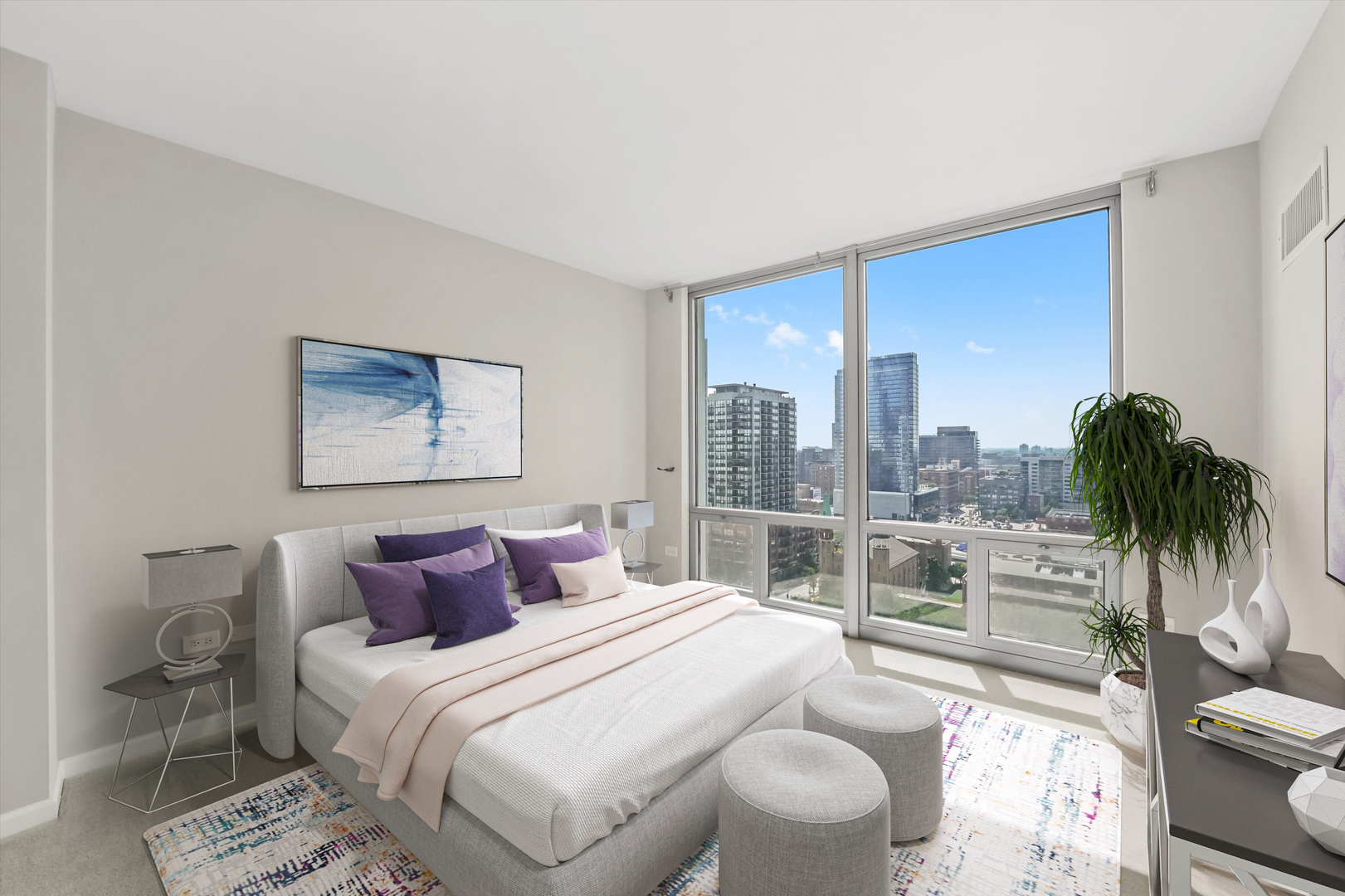 Welcome to this sunlit northwest corner home in the coveted Park Alexandria. This modern updated split 2-bedroom, 2-bath condo features stunning floor-to-ceiling windows, showcasing breathtaking panoramic city views. Enjoy hardwood floors throughout the bright, open-concept living space complemented by a dedicated separate dining area, perfect for both everyday living and entertaining. The Chef’s kitchen boasts granite countertops, sleek white cabinetry with new black hardware, and Brand New stainless steel appliances. Step out onto your private balcony to take in fresh air and skyline views. This thoughtfully designed unit also features a walk-in coat closet and pantry combo. Retreat to the spacious bedrooms featuring a luxurious en-suite with a double vanity & separate glass enclosed shower & soaking tub, walk in closet and with ample storage space. The second bedroom also has floor to ceiling windows and a walk in closet. An in-unit washer and dryer enhance daily convenience. Park Alexandria offers full amenities, including 24-hour doorman, fitness center, expansive landscaped sundeck with a dog patio, 2 guest suites, party room, bike room, on-site manager/engineer and receiving room. Exterior storage cage and extra spacious premium garage parking space right off the elevator are included. Ideally located in the top tier highly sought after Skinner School District, near Whole Foods, the Riverwalk & all of the world class West Loop dining, shopping, & public transit.