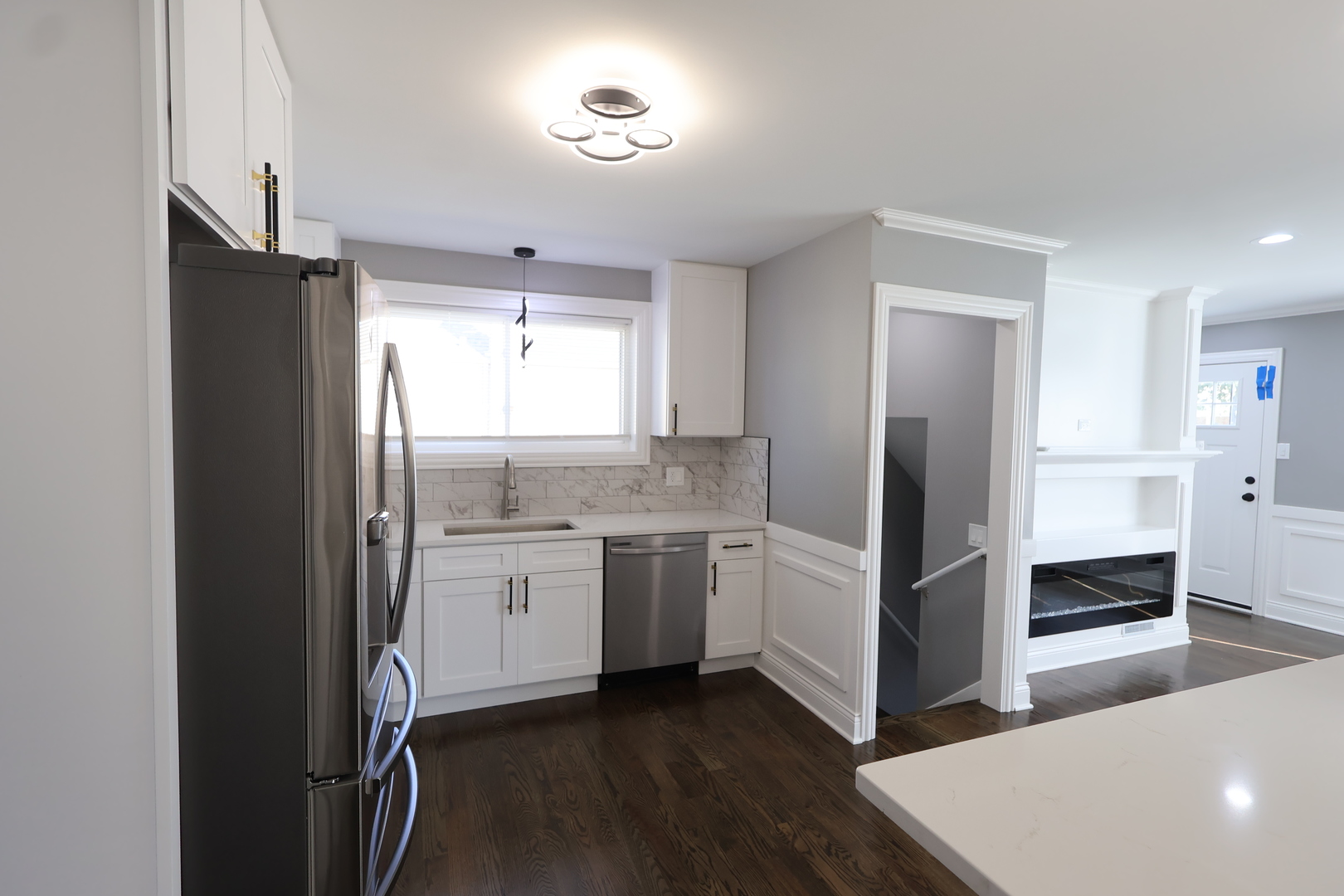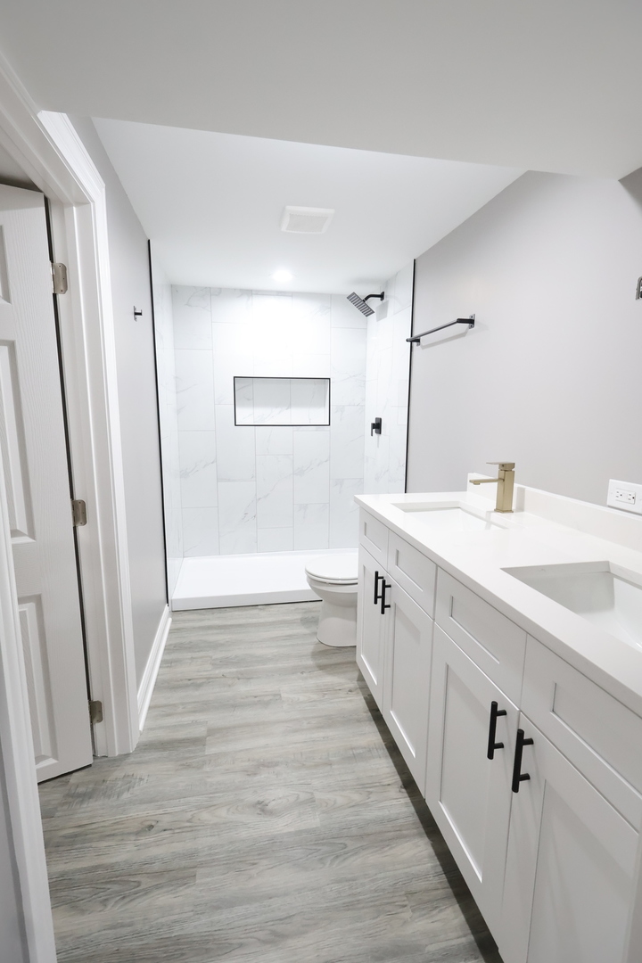 Impressive 4-bedroom, 2-bath ranch with a full finished basement. Completely renovated inside and out! Updates include new plumbing, electrical, drywall, insulation, roof, and a tall, brand-new 2.5-car garage with high ceilings. The seller also installed a full French drain tile system with sump and ejector pumps. Inside, you’ll find hardwood floors throughout, recessed lighting, and a bright open layout anchored by a custom-built electric fireplace and media wall. The kitchen features ceiling-height cabinets, quartz countertops, stainless steel appliances, and a built-in breakfast bar for everyday dining. The lower level includes a spacious bedroom that can serve as a master suite, with private access to a modern bath featuring dual sinks and a walk-in shower, plus a large family room and laundry area. Exterior upgrades include new concrete sidewalks. Every detail reflects quality, comfort, and care. Move-in ready and beautifully finished!