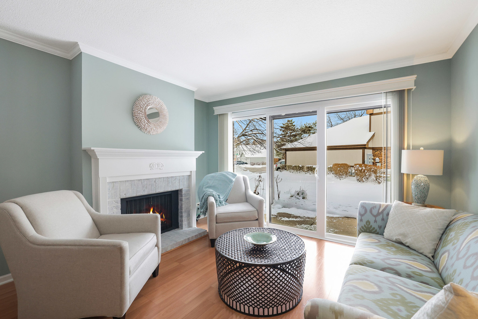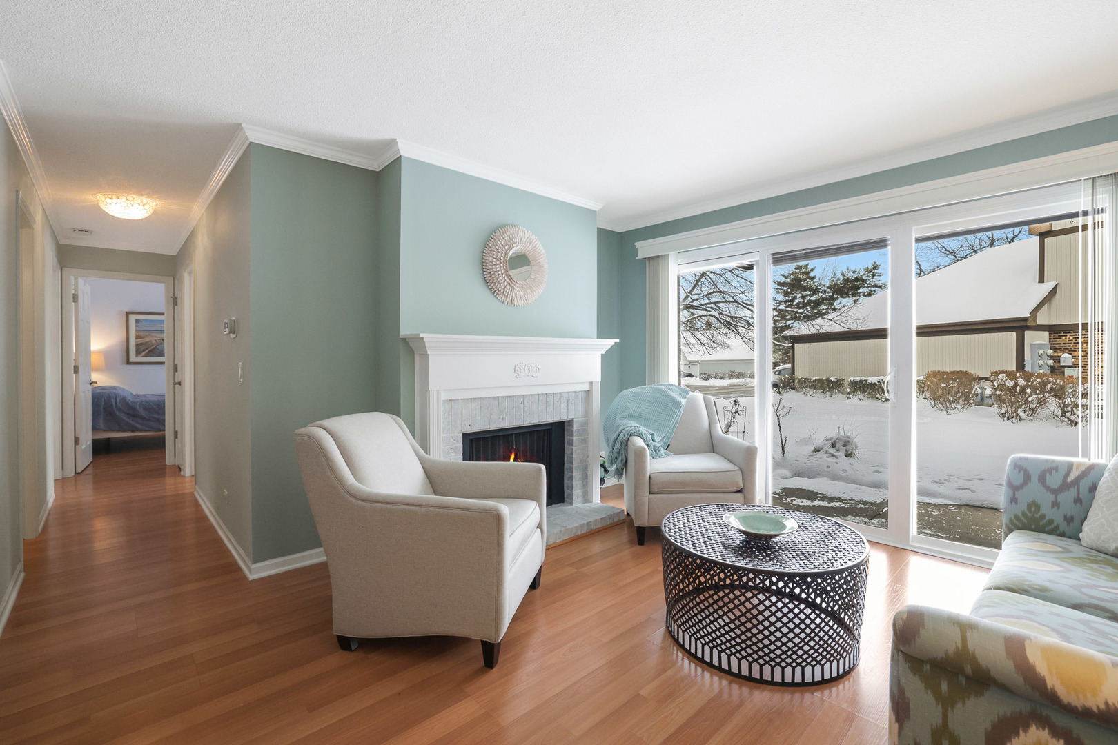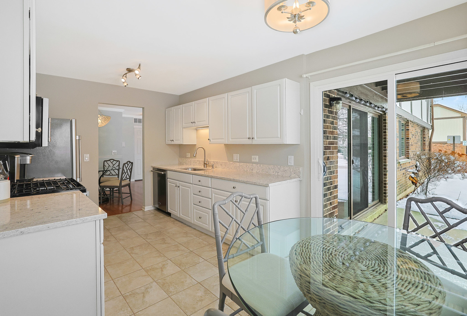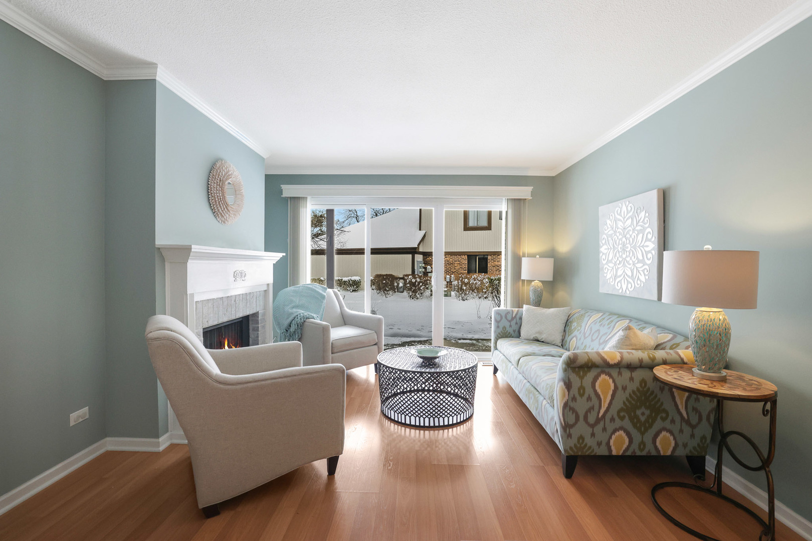 Nothing to do but move into this adorable 1st-floor corner unit! This rarely available 3-bedroom, 2-bathroom home is the largest model in the community and even comes with the largest 1-car garage. Step into an inviting, open living room with a cozy fireplace, crown molding, and a slider leading to the patio. Laminate floors run through the living room, dining room, and all bedrooms. The upgraded kitchen features quartz countertops, an extra-deep sink with upgraded faucet, white cabinets with under-cabinet lighting, stainless steel appliances (2019), ceramic tile floors, and an eat-in nook overlooking the patio. The primary bedroom includes more crown molding, a walk-in closet, and a private updated bathroom with quartz counters, white cabinets, and a tiled walk-in shower. Two additional guest bedrooms and another updated bathroom complete the space. Other updates include a new furnace and A/C in 2015, water heater in 2020, and all windows and sliders replaced in 2022. Neutral paint and decor throughout. Convenient in-unit laundry room with storage shelves. Steps to the community pool and playground, and just minutes from downtown Schaumburg, shopping, and more. Don’t miss this one!