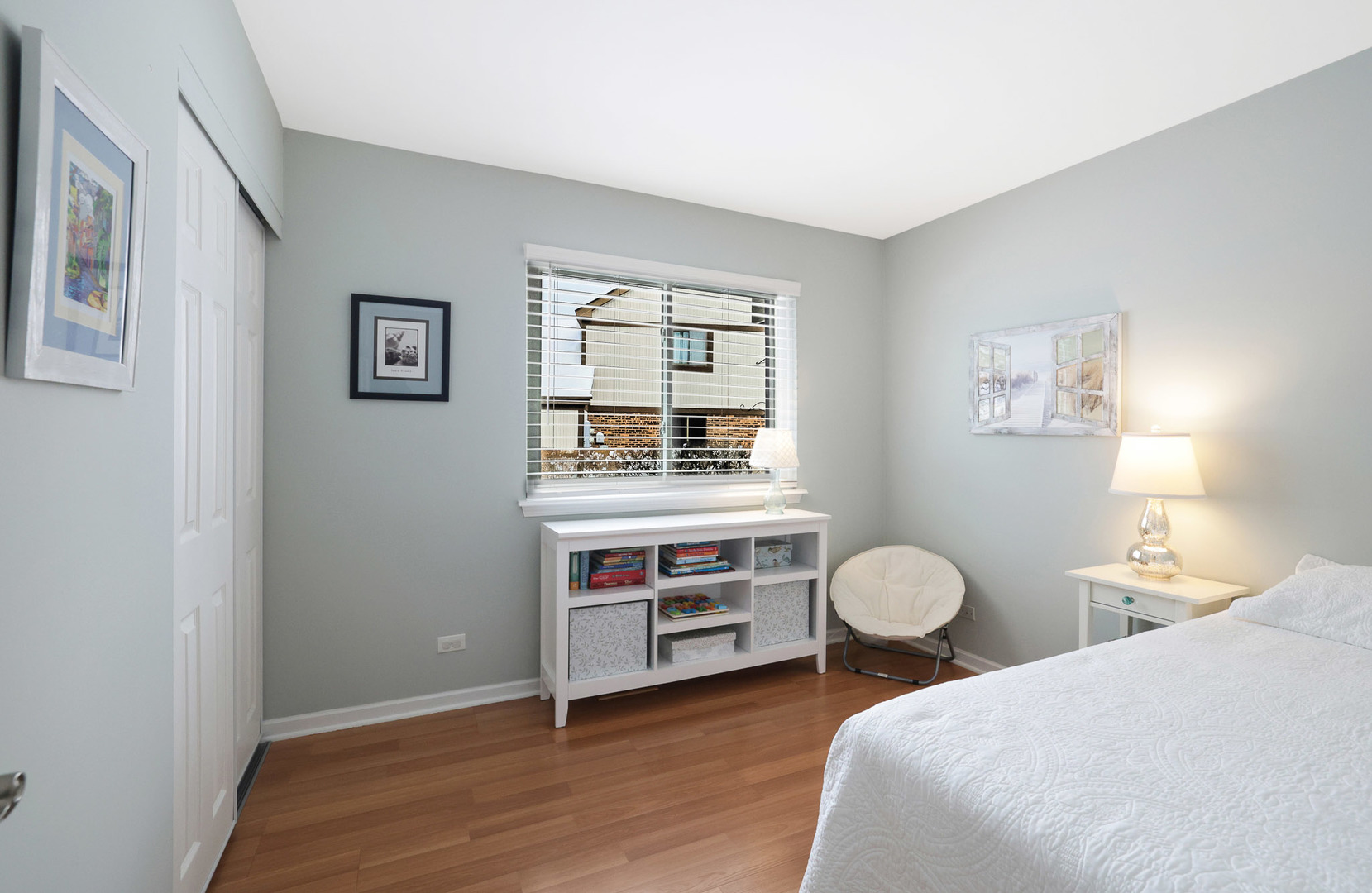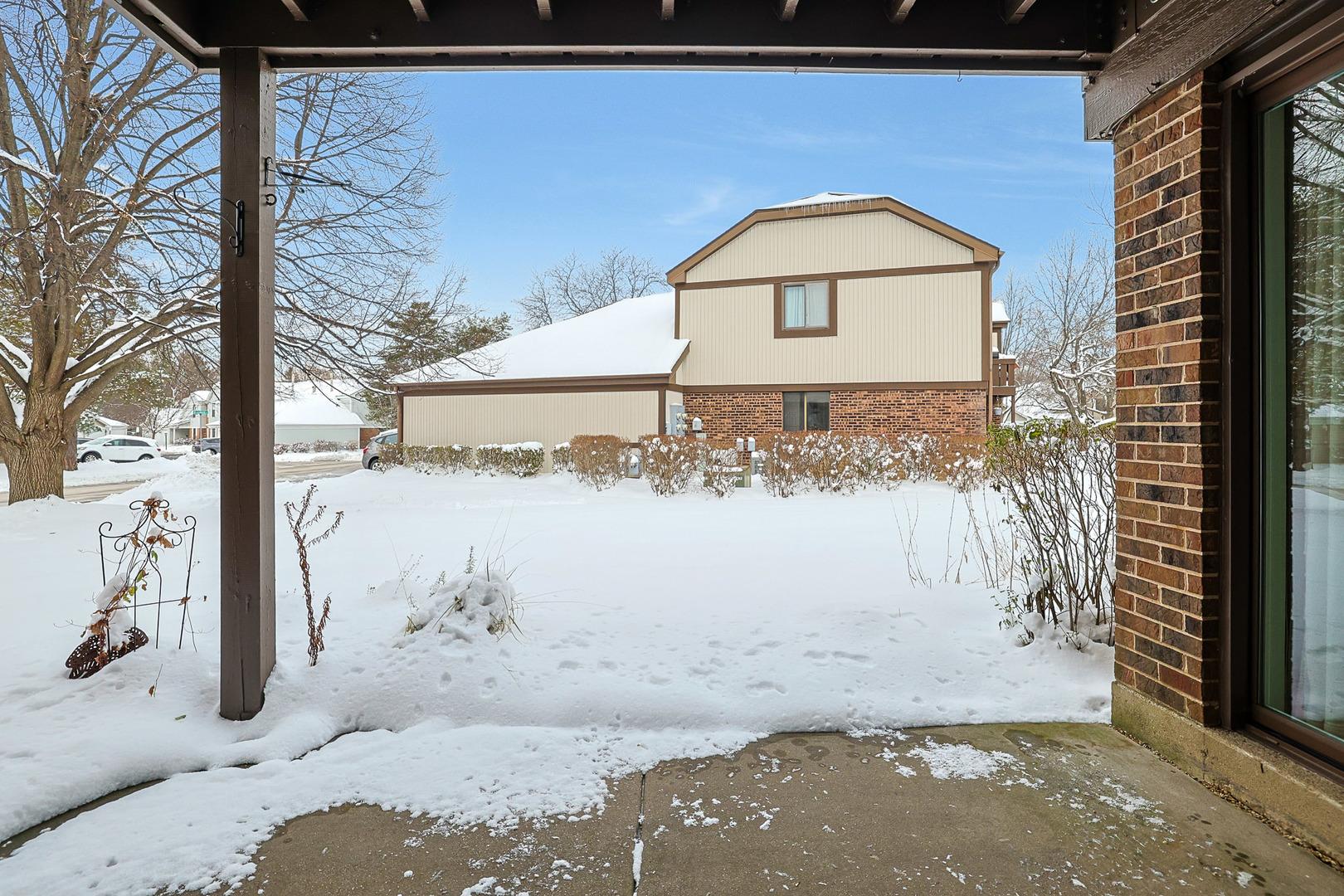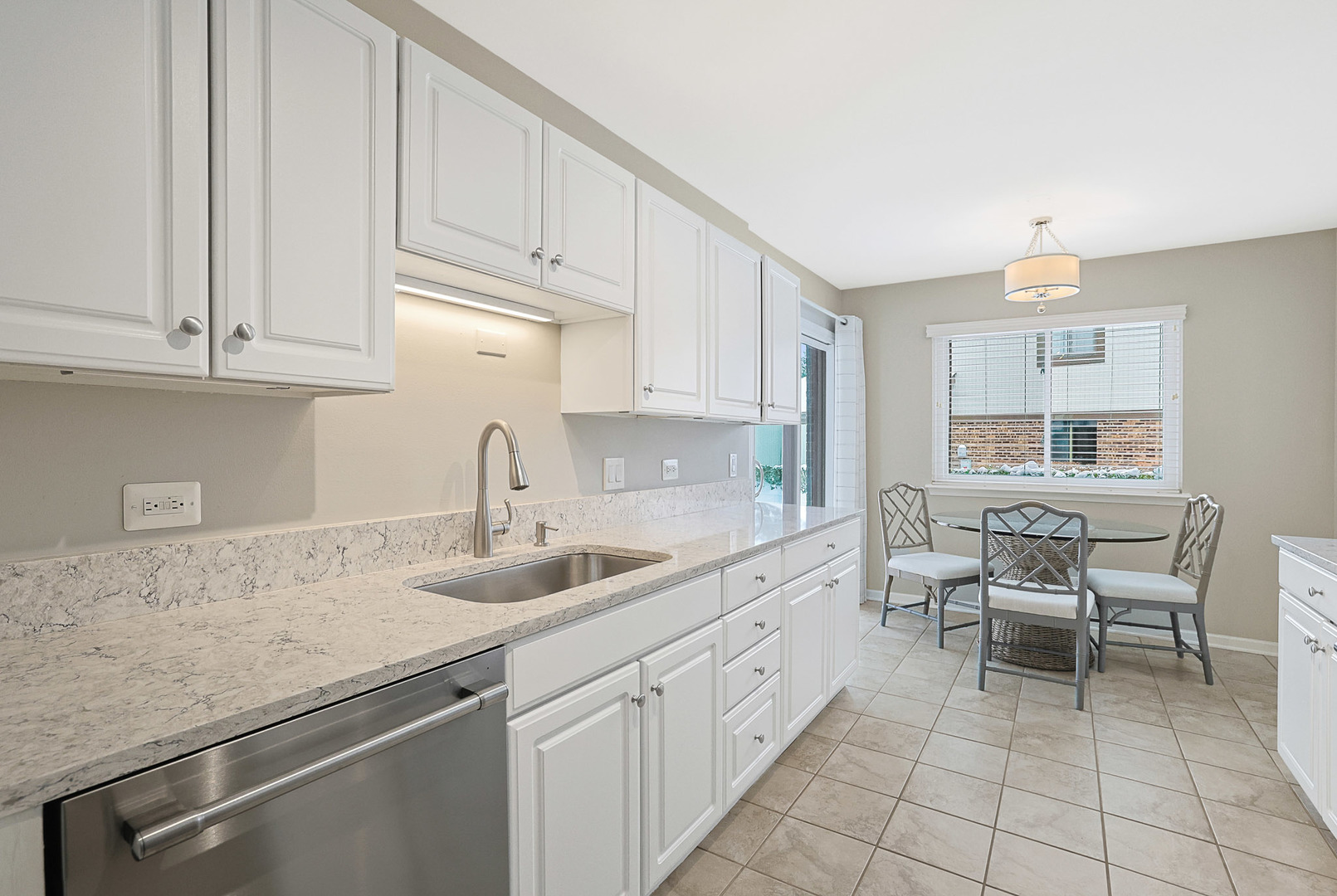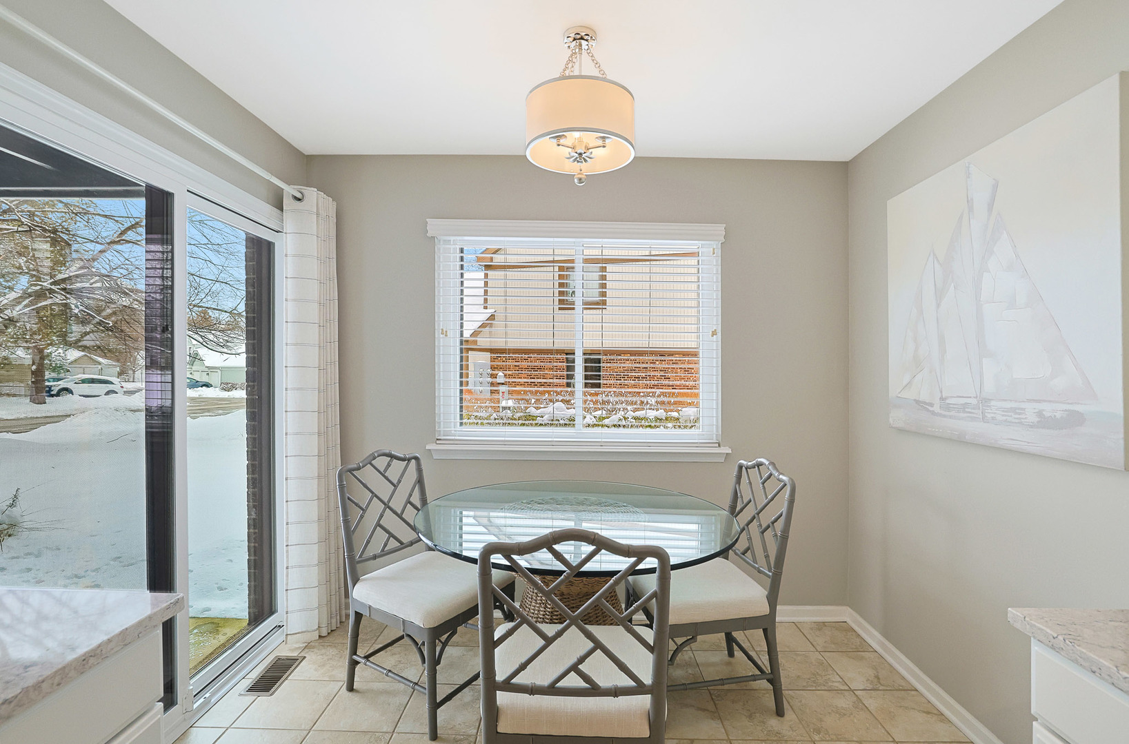 Nothing to do but move into this adorable 1st-floor corner unit! This rarely available 3-bedroom, 2-bathroom home is the largest model in the community and even comes with the largest 1-car garage. Step into an inviting, open living room with a cozy fireplace, crown molding, and a slider leading to the patio. Laminate floors run through the living room, dining room, and all bedrooms. The upgraded kitchen features quartz countertops, an extra-deep sink with upgraded faucet, white cabinets with under-cabinet lighting, stainless steel appliances (2019), ceramic tile floors, and an eat-in nook overlooking the patio. The primary bedroom includes more crown molding, a walk-in closet, and a private updated bathroom with quartz counters, white cabinets, and a tiled walk-in shower. Two additional guest bedrooms and another updated bathroom complete the space. Other updates include a new furnace and A/C in 2015, water heater in 2020, and all windows and sliders replaced in 2022. Neutral paint and decor throughout. Convenient in-unit laundry room with storage shelves. Steps to the community pool and playground, and just minutes from downtown Schaumburg, shopping, and more. Don’t miss this one!