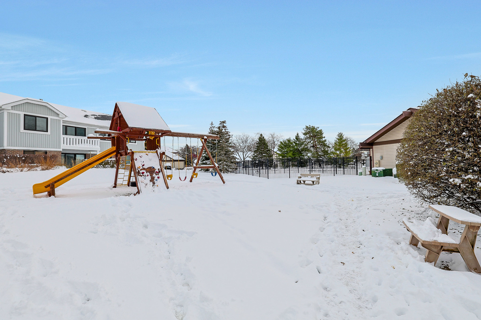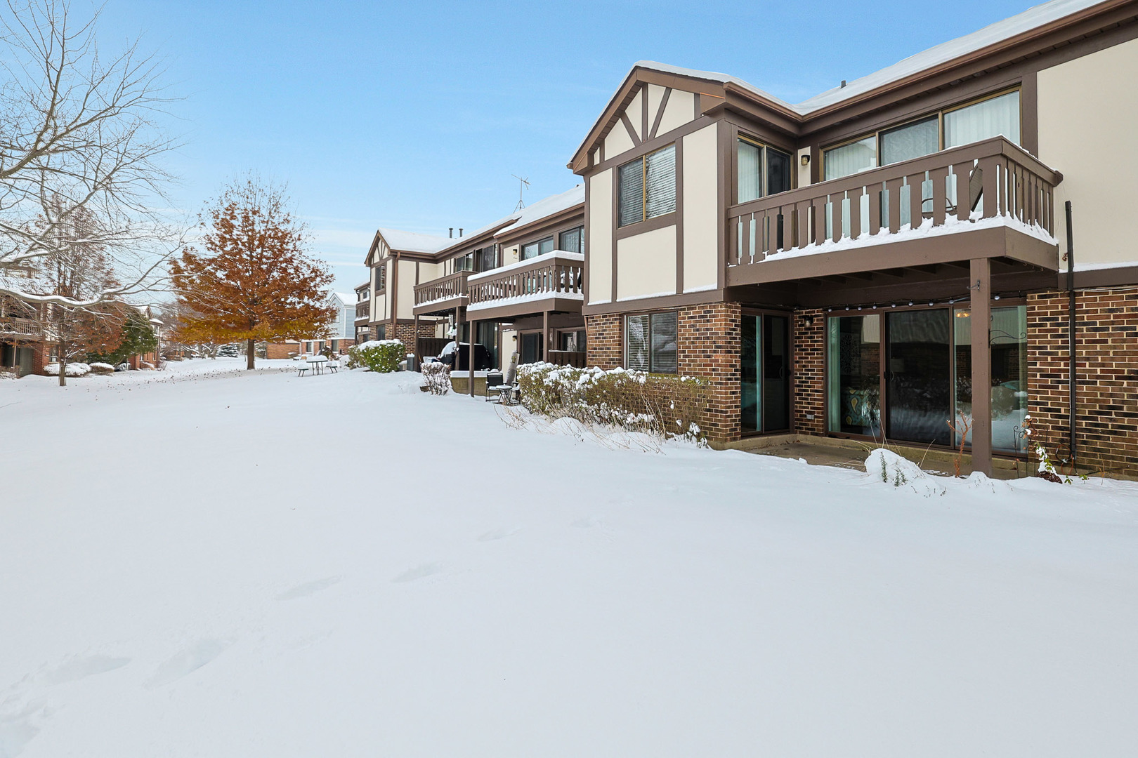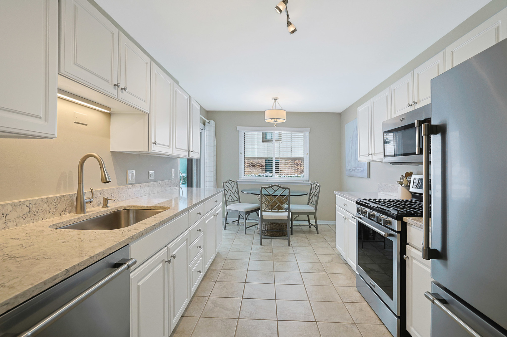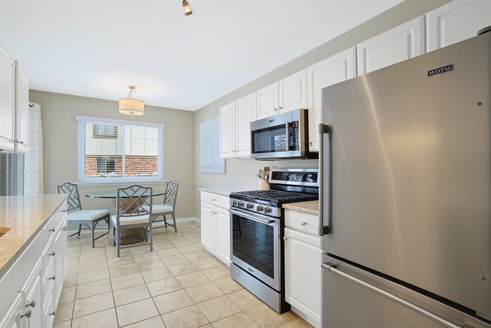 Nothing to do but move into this adorable 1st-floor corner unit! This rarely available 3-bedroom, 2-bathroom home is the largest model in the community and even comes with the largest 1-car garage. Step into an inviting, open living room with a cozy fireplace, crown molding, and a slider leading to the patio. Laminate floors run through the living room, dining room, and all bedrooms. The upgraded kitchen features quartz countertops, an extra-deep sink with upgraded faucet, white cabinets with under-cabinet lighting, stainless steel appliances (2019), ceramic tile floors, and an eat-in nook overlooking the patio. The primary bedroom includes more crown molding, a walk-in closet, and a private updated bathroom with quartz counters, white cabinets, and a tiled walk-in shower. Two additional guest bedrooms and another updated bathroom complete the space. Other updates include a new furnace and A/C in 2015, water heater in 2020, and all windows and sliders replaced in 2022. Neutral paint and decor throughout. Convenient in-unit laundry room with storage shelves. Steps to the community pool and playground, and just minutes from downtown Schaumburg, shopping, and more. Don’t miss this one!