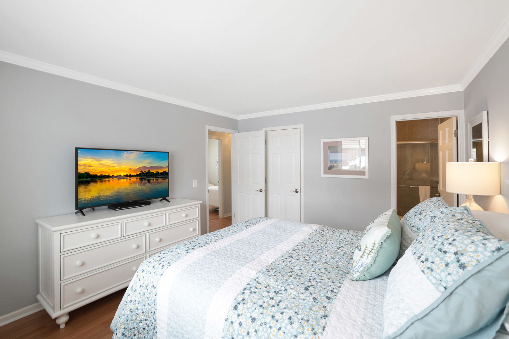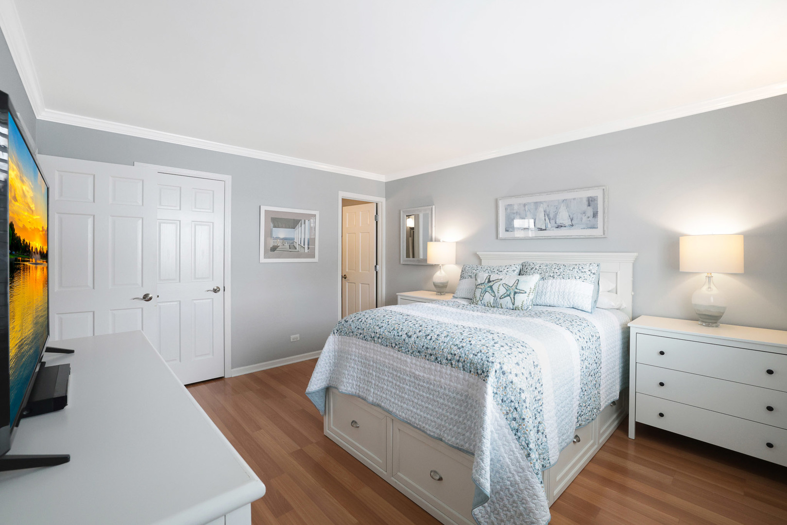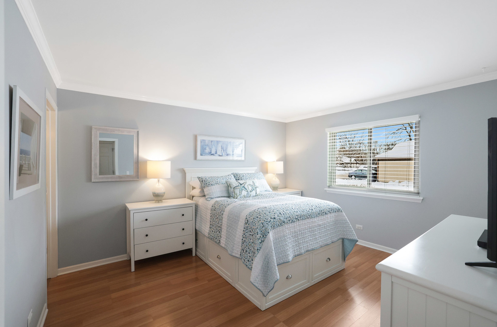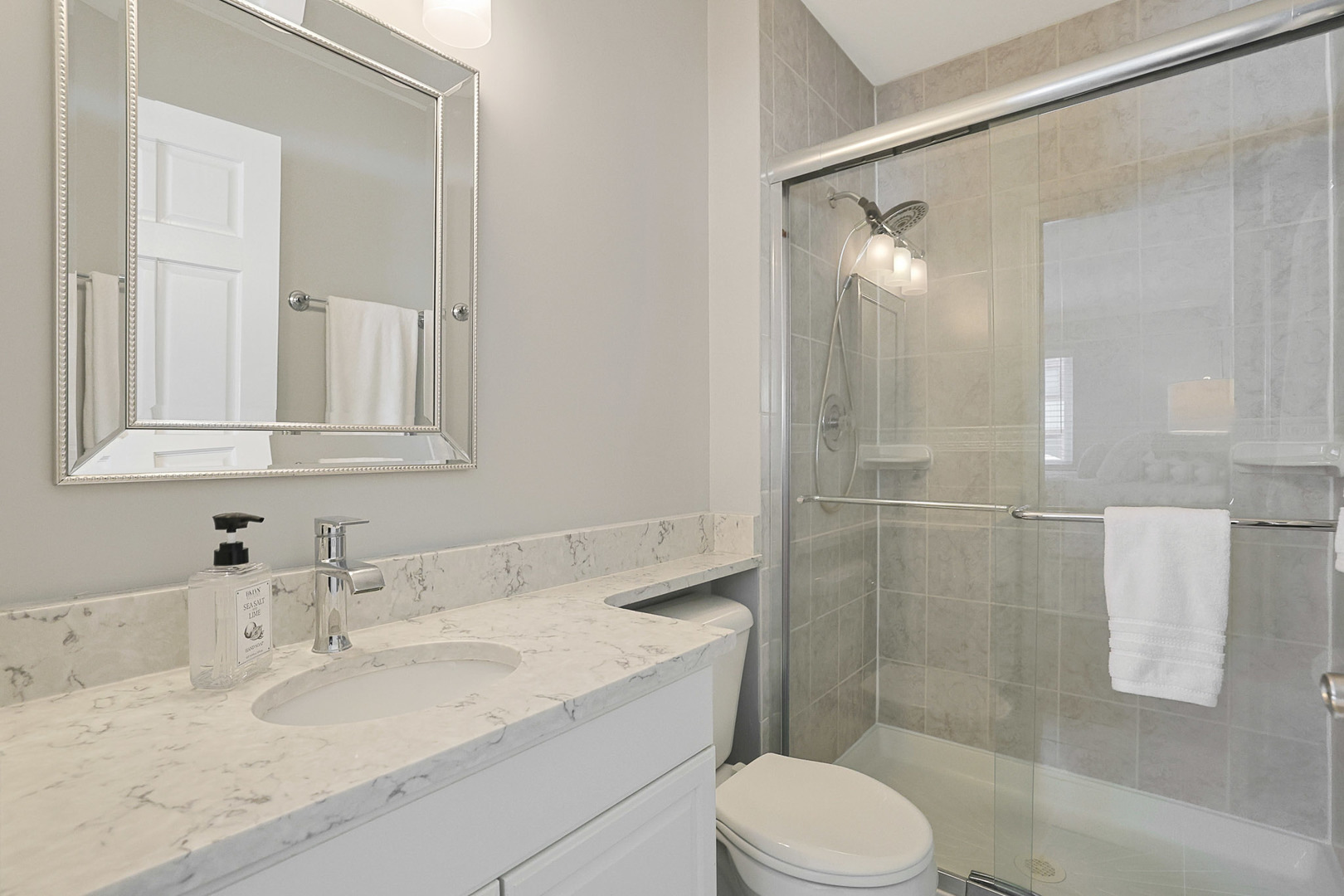 Nothing to do but move into this adorable 1st-floor corner unit! This rarely available 3-bedroom, 2-bathroom home is the largest model in the community and even comes with the largest 1-car garage. Step into an inviting, open living room with a cozy fireplace, crown molding, and a slider leading to the patio. Laminate floors run through the living room, dining room, and all bedrooms. The upgraded kitchen features quartz countertops, an extra-deep sink with upgraded faucet, white cabinets with under-cabinet lighting, stainless steel appliances (2019), ceramic tile floors, and an eat-in nook overlooking the patio. The primary bedroom includes more crown molding, a walk-in closet, and a private updated bathroom with quartz counters, white cabinets, and a tiled walk-in shower. Two additional guest bedrooms and another updated bathroom complete the space. Other updates include a new furnace and A/C in 2015, water heater in 2020, and all windows and sliders replaced in 2022. Neutral paint and decor throughout. Convenient in-unit laundry room with storage shelves. Steps to the community pool and playground, and just minutes from downtown Schaumburg, shopping, and more. Don’t miss this one!