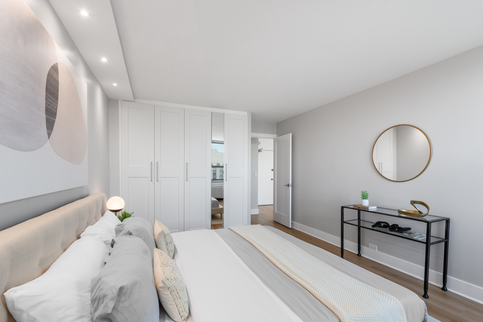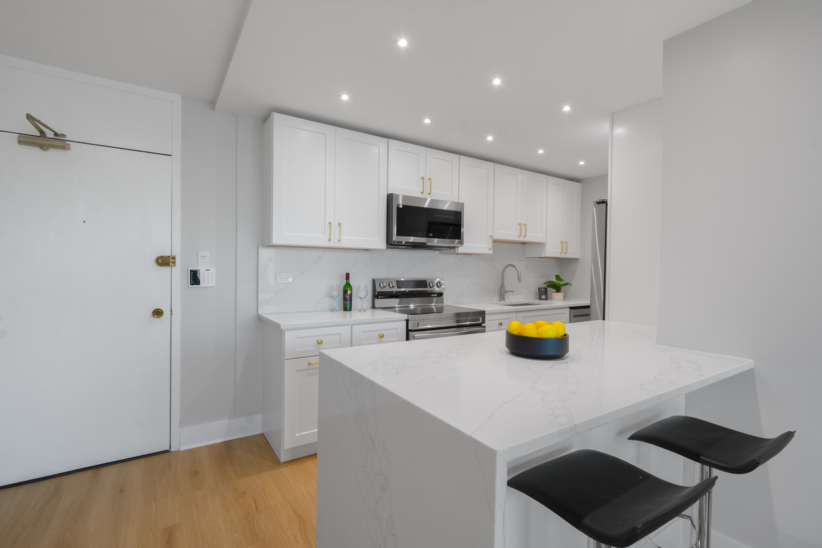 Presenting this rare new tw0 bedroom home on a high floor (17th) with stunning views. It also has a separate dining/office space. The home has been gut rehabbed and meticulously renovated to the highest standards. Be the first to live in this redesigned floor plan for today’s lifestyle and living. Top quality craftsmanship and finishes throughout. The home has all new windows. A brand-new open-concept kitchen features classic white shaker cabinets, quartz counters & island with waterfall edge and breakfast bar. High-end stainless steel appliances including french door refrigerator, Kitchen opens to the living/dining room, which has new recessed lighting. The bathroom is fully rehabbed with new walk-in shower, vanity with quartz top, upscale commode & fixtures, mirrored medicine cabinet, contemporary tiles. The primary bedroom is generously sized allowing for a Den/home office,Throughout the home there are wide plank light wood color floors. New plumbing, electrical, designer lighting. Enjoy the spectacular unobstructed views from the 17th floor out over the city with amazing sunsets. Additional storage cage included in the building. Eliot House is a highly desired, well run building with low assessments & good reserves, many major updates completed including all new windows, elevators and renovated lobby. There’s a newer rooftop sun deck with furniture and grill and also a ground floor patio BBQ area, renovated laundry room, 24 hour door staff, maintenance & management are onsite. Low monthly assessment includes heat, TV cable and high speed internet service (everything except electricity). Sandburg Village amenities include 2 outdoor pools & sundecks, tennis courts, hospitality rooms- (some additional fees) The landscaped courtyards, play lot, commercial facilities provide a welcoming community environment. Convenient for transportation – train/subway on same block, buses at door, access to Lake Shore Dr, bike path. Located in Gold Coast / Old Town, close to downtown, Lincoln Park. Enjoy all attractions of the neighborhood – restaurants, nightlife, shopping, new Jewel, Lakefront trail, beach, parks. Pool and FFC gym are next door. Pets allowed. Parking in building garage only $150 p/m there is a wait list.
