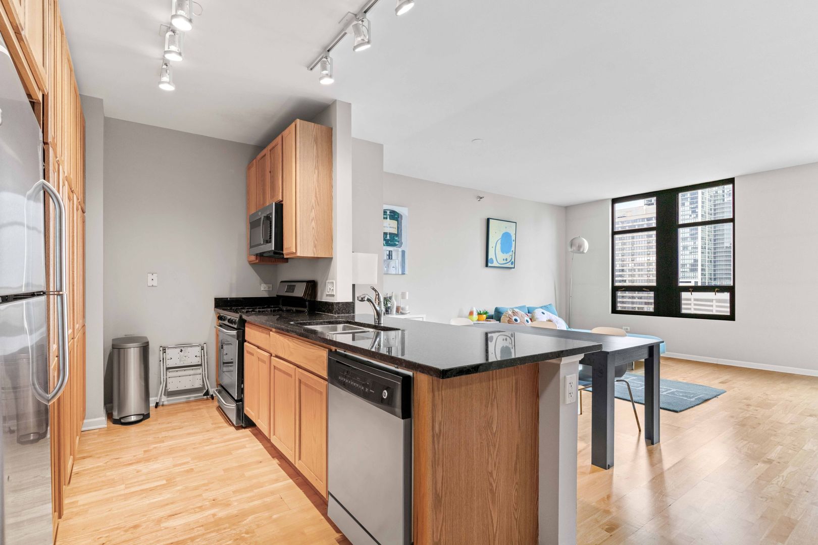 Enjoy breathtaking city and lake views from this beautifully upgraded high-floor east-facing 1-bedroom condo in the heart of the South Loop. The unit features 42″ kitchen cabinets with abundant storage space, granite countertops, stainless steel appliances, in-unit washer and dryer, private balcony, and hardwood floors throughout. A deeded garage space is available for an additional $25K. Building amenities include a 24-hour doorman, fitness center, extra assigned storage, on-site maintenance and management, and package reception. Assessments cover heat, air conditioning, cable TV, internet, parking, gas, fitness center, and storage. Ideally located just blocks from shopping (Target, Trader Joe’s, Jewel), numerous restaurants, the lakefront (Museum Campus, Grant Park), public transportation (Red, Green, and Orange lines, CTA buses), and entertainment at Roosevelt Collection, with easy access to highways and Lake Shore Drive.