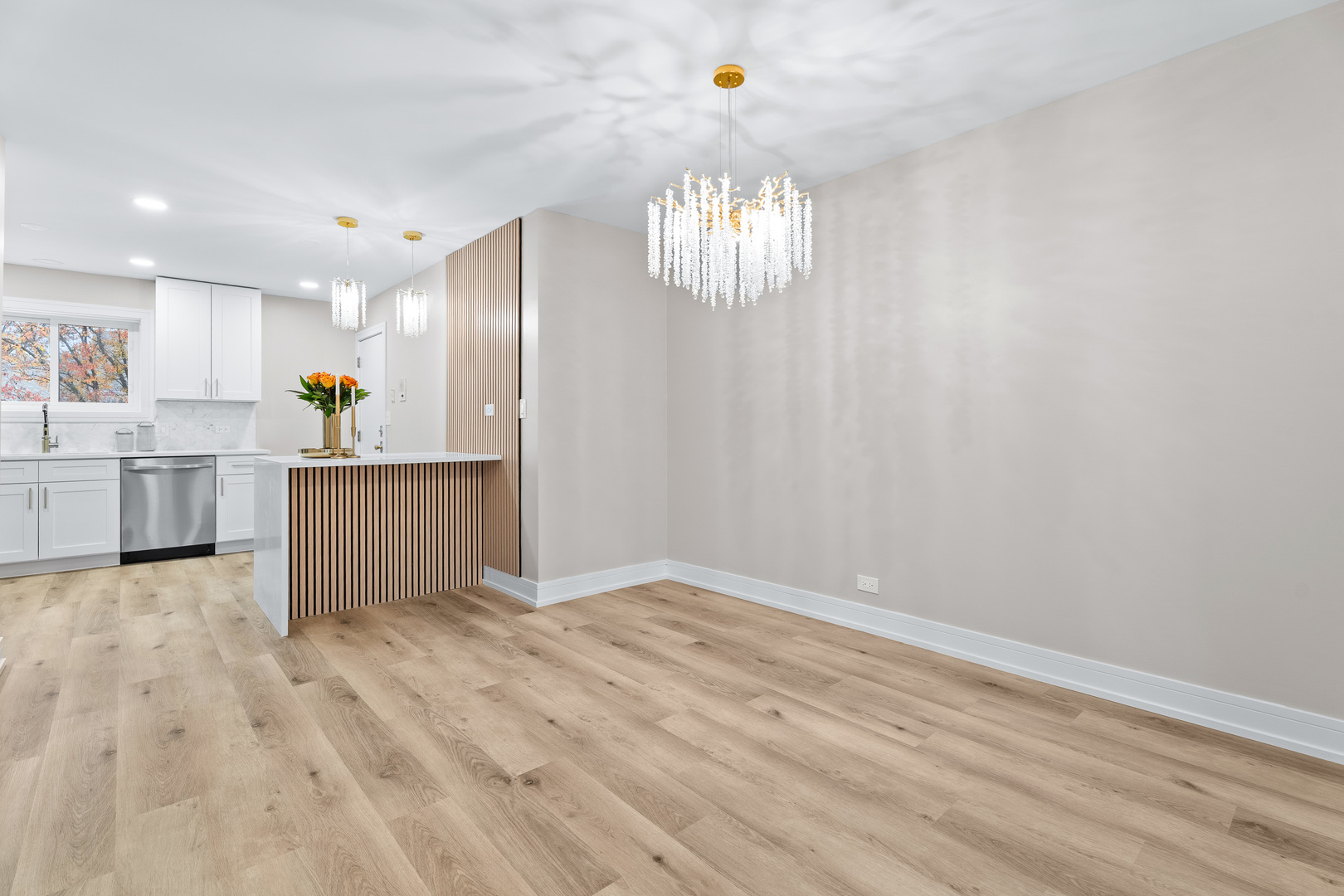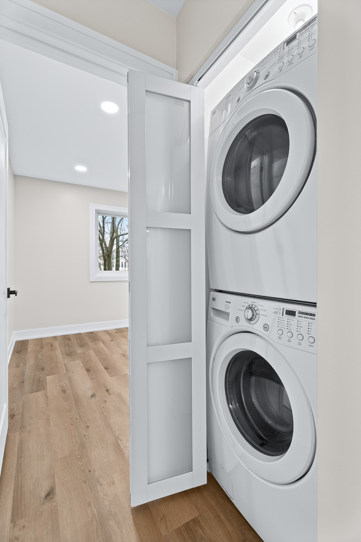 Beautifully Updated Condo in Prime Palatine Location. Welcome to this completely renovated, light-filled condo nestled in one of Palatine’s most convenient neighborhoods-just minutes from charming local shops, great restaurants, and easy access to I-90. From the moment you walk in, the home feels fresh, modern, and thoughtfully designed. The stunning kitchen immediately catches your eye with its crisp white shaker cabinets, luxurious quartz countertops, and a gorgeous backsplash. The contemporary island, accented with warm slatted wood detailing, adds both style and functionality, while the elegant crystal pendant lights bring a touch of sophistication to the space. A window above the sink lets in wonderful natural light, and the brand-new stainless steel appliances complete the perfect modern kitchen setup. The open living and dining area flows effortlessly, highlighted by new vinyl flooring, fresh paint, and a beautiful chandelier that creates an inviting atmosphere. From here, step out onto your private balcony overlooking peaceful natural views-an ideal spot for your morning coffee or a relaxing evening. Both bathrooms have been completely redesigned with top-quality finishes. The primary suite features a spacious walk-in shower with modern lighting and warm, tasteful tile work that gives the space a spa-like feel. The second bathroom offers a fully updated bathtub and fresh, clean design. The unit also includes an in-unit washer and dryer, abundant closet space, and an oversized storage room conveniently located near the condo. Every inch of this home has been updated with care, offering a bright, modern, move-in-ready space that combines beauty with everyday practicality. If you’re looking for a stylish, comfortable home in an unbeatable location, this one is truly a must-see.