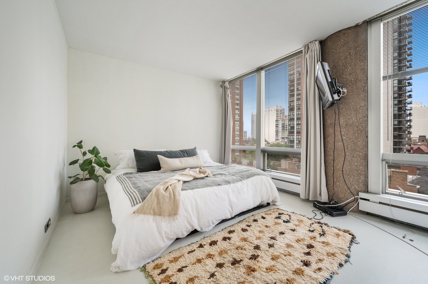 Gorgeous Modern Gold Coast 1 bedroom condo with floor to ceiling wrap around windows and views of historic Astor Street. Concrete flooring, updated kitchen, bath and closets. Rooftop deck w/ stunning 360 views of city and lake. Beautiful tree lined and skyline views. Sleek NE corner unit in mid century modern building by renowned architect Bertrand Goldberg. Amazing location and walking distance to the lake, park, restaurants and Michigan Ave.