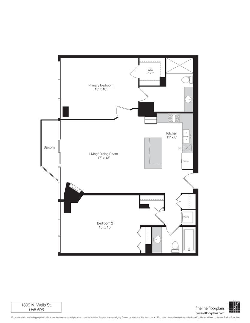 Bright and open south-facing 2 bed / 2 bath condo with 1 garage parking space, private balcony, and in-unit laundry in the heart of Old Town! Large bedroom sizes, with primary bedroom en suite and lots of closet space throughout! Recently replaced central air A/C system and washer/dryer. This elevator building features door staff, remodeled hallways, a community room, and a common rooftop with skyline views. RCN internet and cable, storage cage, and garage parking are included in the assessment. Rare 99 “Walk Score”! Incredible location close to all the restaurants and shops on Wells Street, the 3 Arts Club Cafe, CTA Red and Brown Lines, Jewel-Osco, and Aldi!
