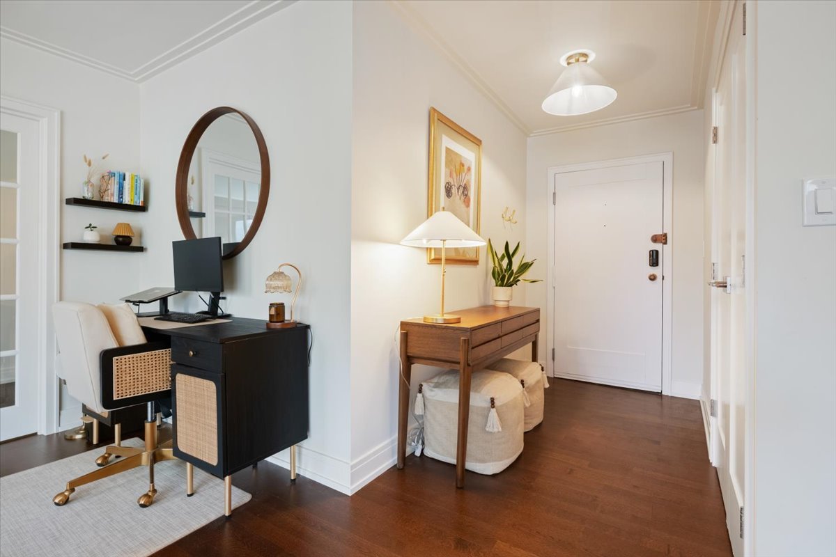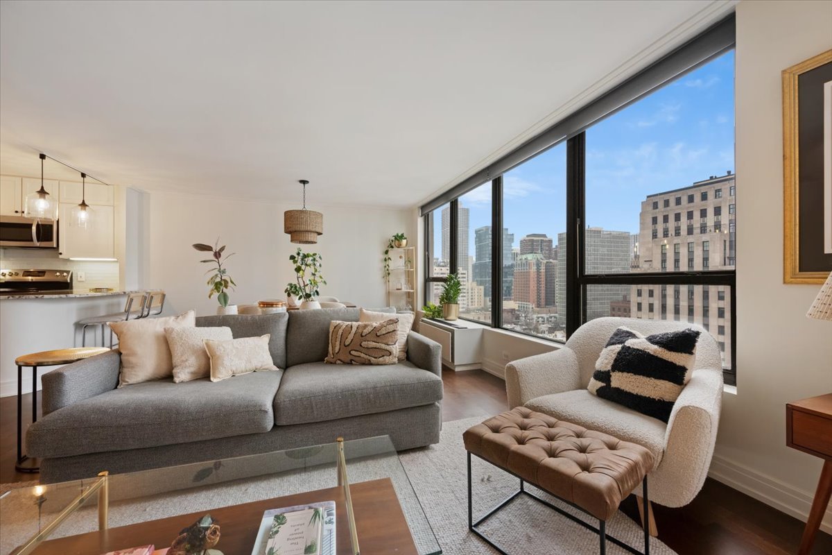 Just moments from Oak Street Beach, the Chicago Lakefront Trail, Lincoln Park, and Gold Coast’s best shopping, dining, and entertainment, Unit 1502 at Ritchie Court offers a truly one-of-a-kind floor plan. Originally two studios combined, this oversized one-bedroom features a bright, open layout with beautiful natural light (especially in the afternoons), three oversized closets, and is one of the rare one-bedroom units in the building and in Gold Coast with full-size in-unit laundry. The kitchen features all stainless steel appliances, ample storage, and a pantry closet. The combined living and dining area offers hardwood laminate flooring and an extra-wide floorplan allowing space to work from home. The primary suite accommodates a king-size bed and includes an impressive 14-foot-long closet. The en-suite bathroom features a marble shower, vanity with ample counter space, a linen closet, and a stackable washer and dryer. This home has been lovingly taken care of, with major updates occurring in 2023: popcorn ceiling removal, 7ft door replacement, and installation of baseboard and crown molding. The dishwasher and A/C unit in the living room were both upgraded in 2025. 1313 Ritchie is a professionally managed, full-service building offering 24-hour door staff, a fitness center, outdoor pool deck, party room, in-house hair and nail salon, and on-site dry cleaning. The building is well maintained and has completed several major updates, including a pool renovation in 2023, a full common area hallway remodel in 2025, and riser replacement in 2025. One deeded parking space, #328, is available for purchase in the attached heated garage for 35,000. The unit includes two storage cages. Monthly HOA total is 1,136.12, broken down as follows: 939 unit, 115 parking, 34 internet, and 48 cable. The seller currently pays 322.21 per month for a special assessment, which will be paid in full at closing. Maximum of 2 pets per unit, 50 lb weight limit. TV and two scones on either side of TV excluded.