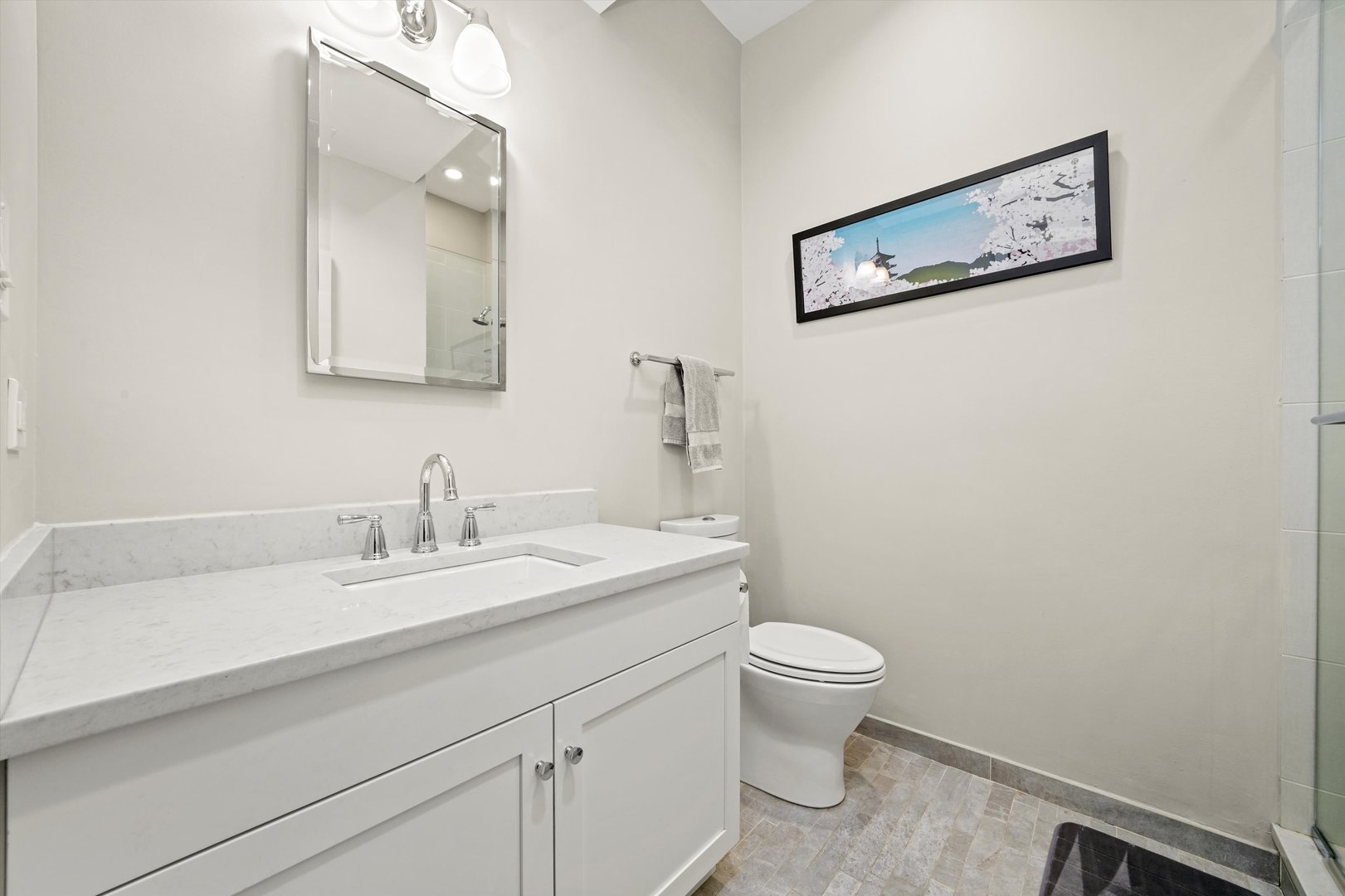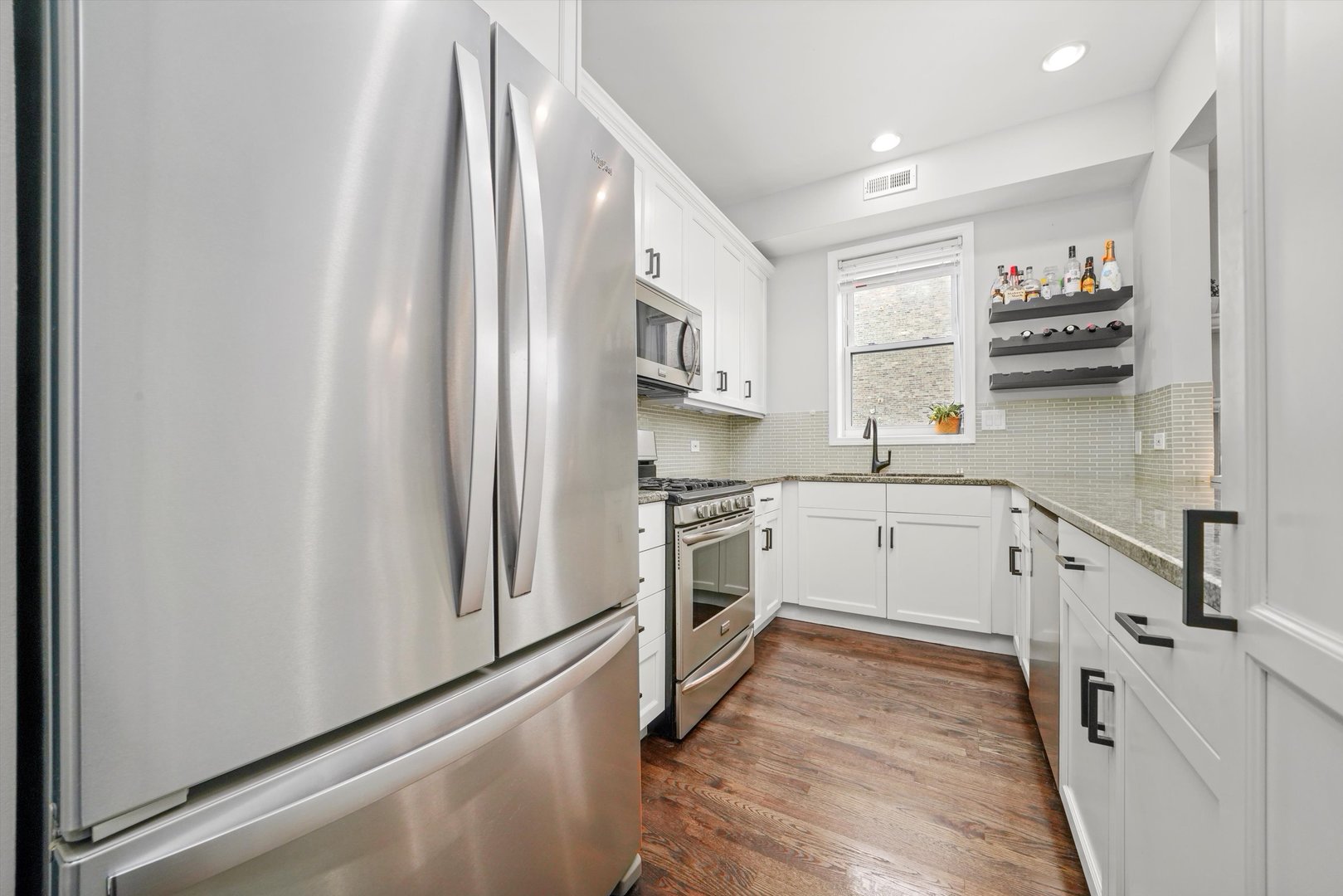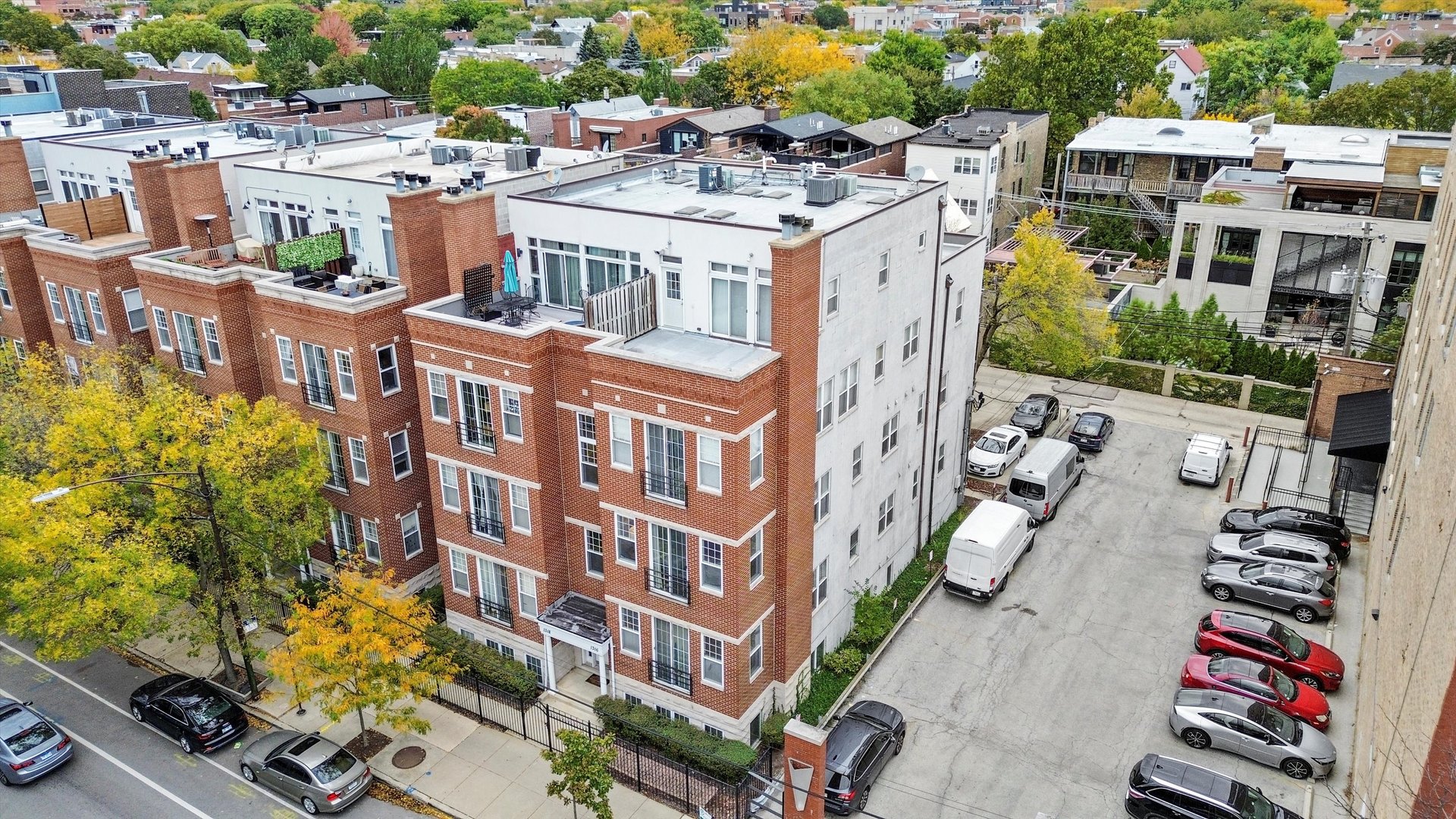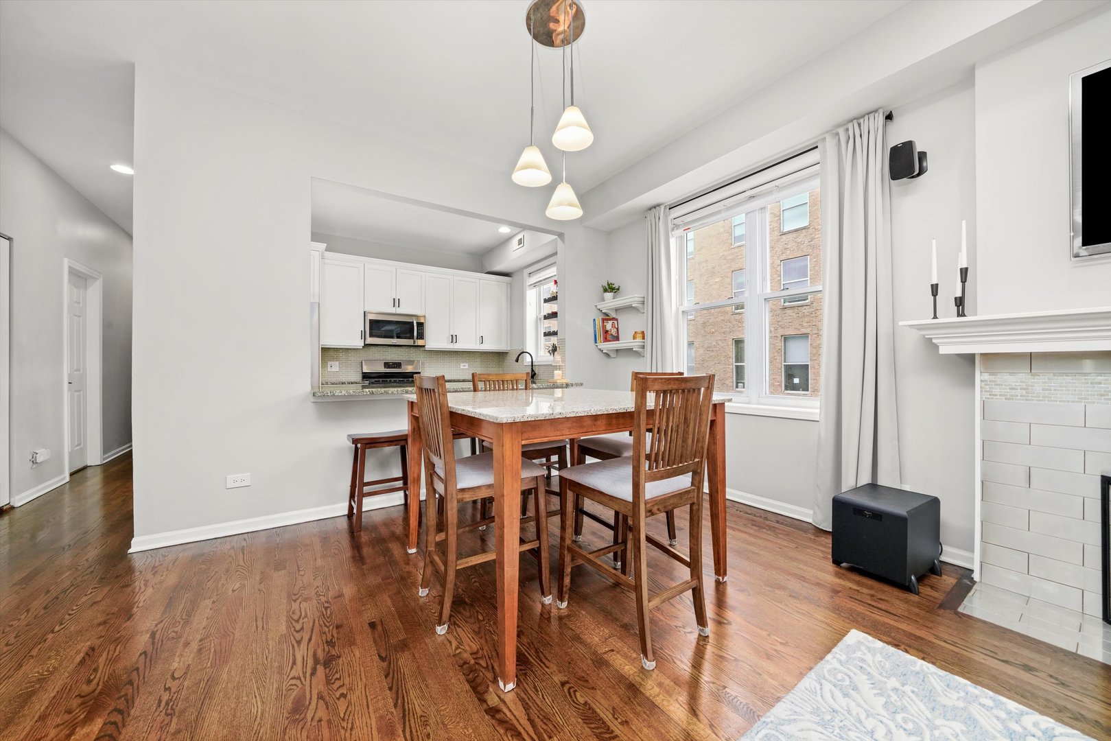 Welcome home to this bright, airy, and beautifully updated 2-bedroom, 2-bath condo perfectly situated in the heart of Lakeview, just steps from the vibrant Southport Corridor. This sun-drenched end-unit walk-up is filled with natural light throughout the day, thanks to its open south and east exposures. The spacious living area features a charming wood-burning fireplace with a classic wood mantel, a gas starter, and built-in surround sound-creating the perfect setting for relaxing or entertaining. Adjacent to the living space, the dining area offers ample room for a full table and is highlighted by a custom chandelier. The open floor plan flows effortlessly into the kitchen, which showcases crisp white cabinetry, stone countertops, a glass tile backsplash, stainless steel appliances, and a generous island with breakfast bar seating. Walnut-stained hardwood floors run throughout the home, complemented by excellent closet space, including a large front coat closet for added convenience. Retreat to the gracious primary suite, complete with a custom-organized walk-in closet and a luxurious en-suite bath featuring marble and stone finishes along with Restoration Hardware and Kohler fixtures. The second bathroom has been fully updated with the same high-end touches. Enjoy morning coffee or evening gatherings on your private rear deck, accessible from the primary bedroom. Additional features include a two-car tandem parking space and a private 10×8 lower-level storage room. With the El, Whole Foods, Target, boutique shopping, and some of Lakeview’s best restaurants just steps away, this home perfectly blends comfort, style, and convenience in one of Chicago’s most desirable neighborhoods.